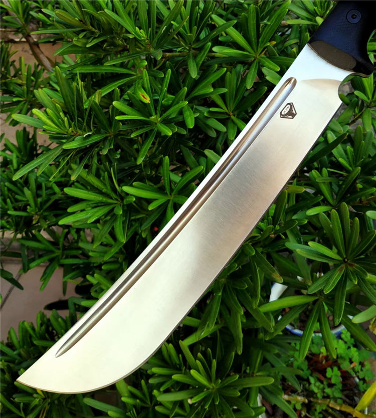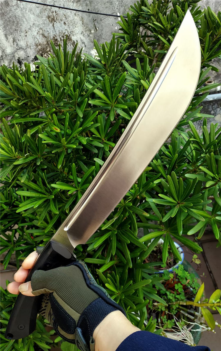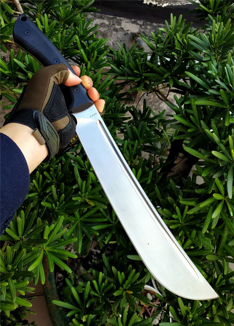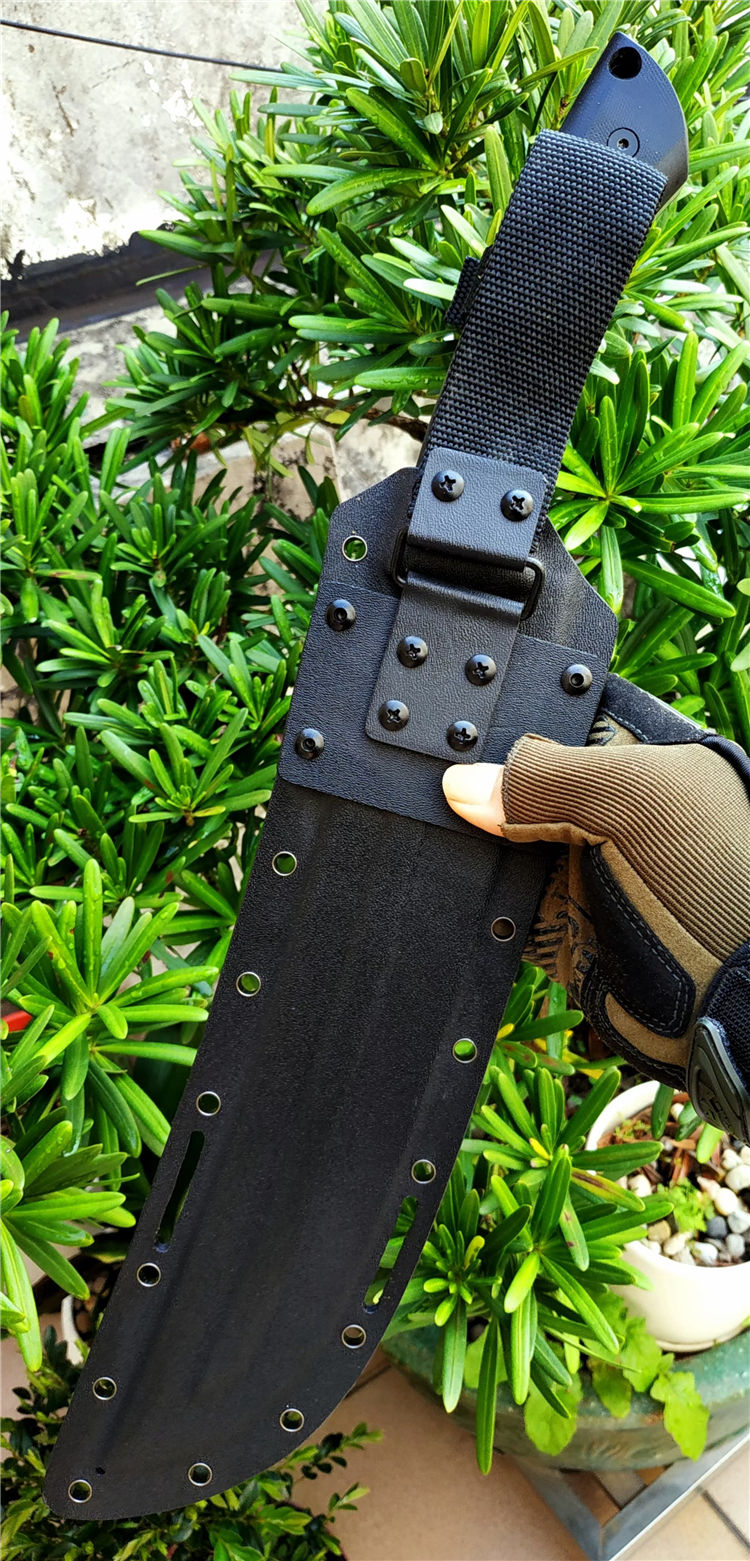 野牛大黑牛砍刀 全长:460mm 刃长:295mm 刃宽:53mm 柄长:165mm 刃厚:6.5mm 刃材:DC53钢 热处理:真空油淬热处理 硬度:59HRC 表面处理:砂光钢本色 柄材:G10 刀体:CNC精细加工+数控V磨 刀鞘:2.0美产K鞘 刀重:680克