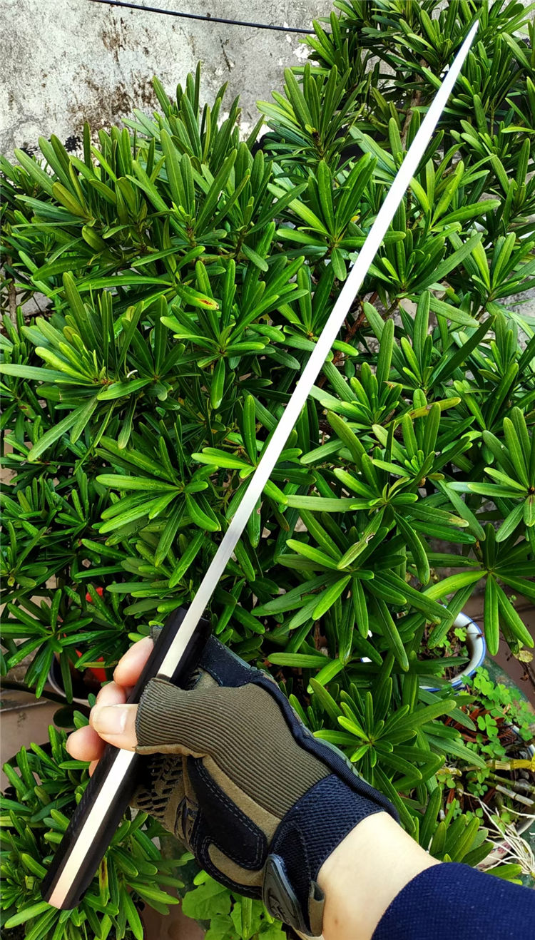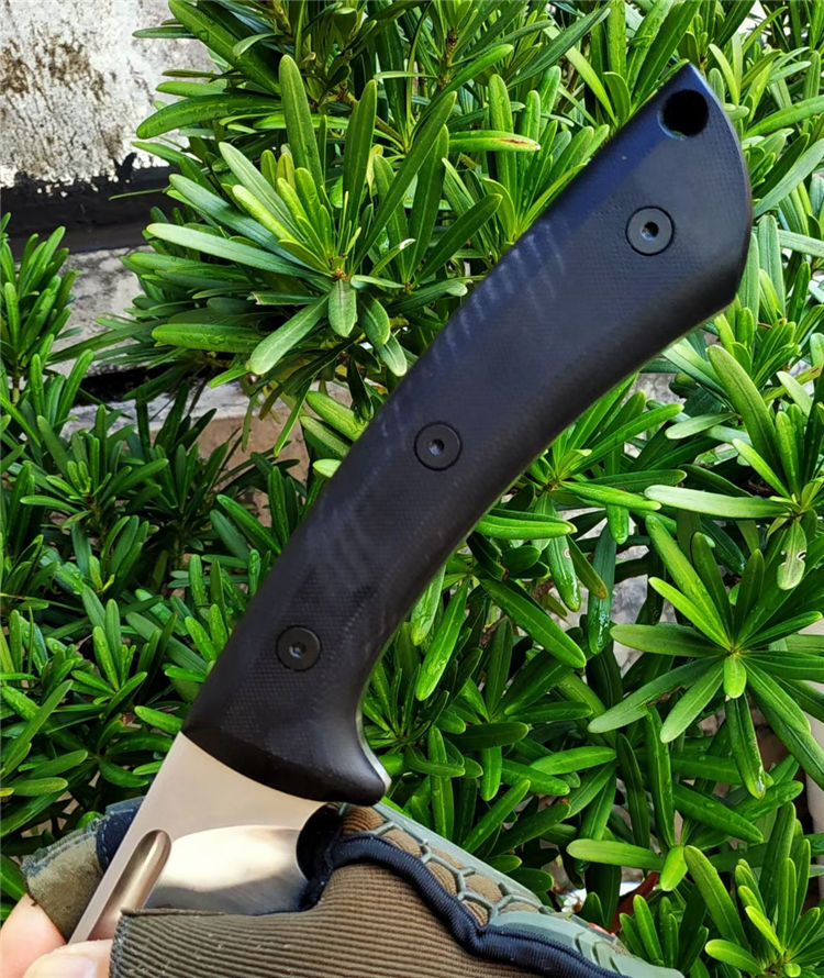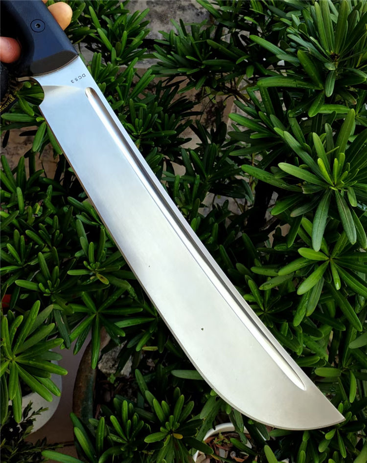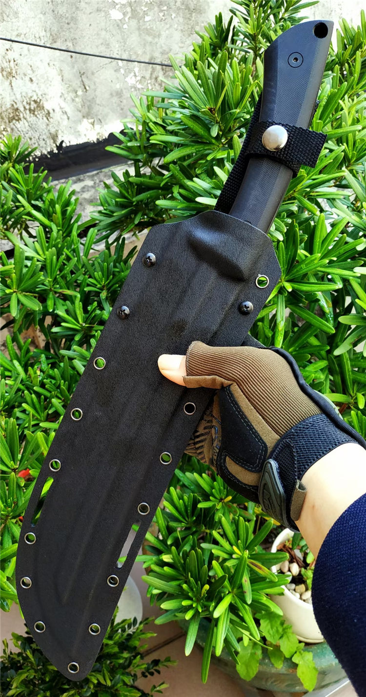 野牛大黑牛砍刀 全长:460mm 刃长:295mm 刃宽:53mm 柄长:165mm 刃厚:6.5mm 刃材:DC53钢 热处理:真空油淬热处理 硬度:59HRC 表面处理:砂光钢本色 柄材:G10 刀体:CNC精细加工+数控V磨 刀鞘:2.0美产K鞘 刀重:680克