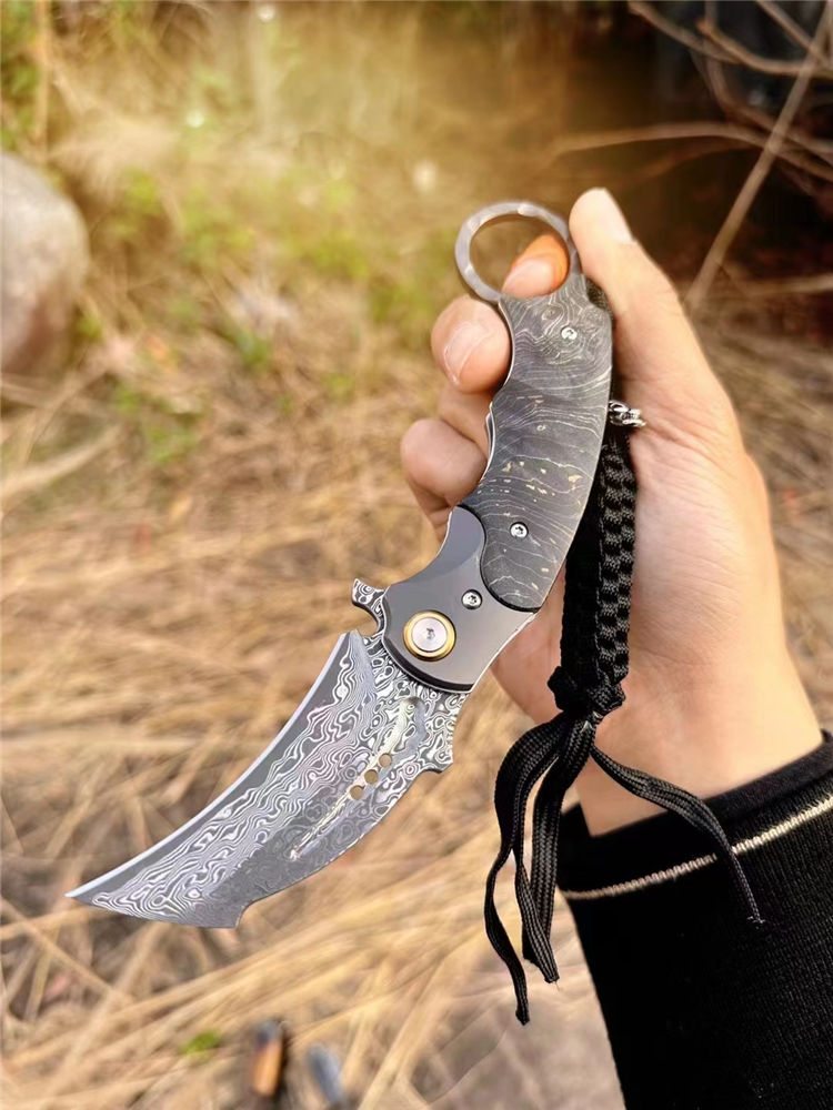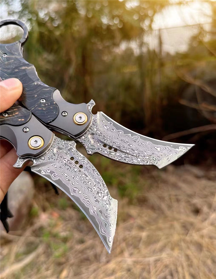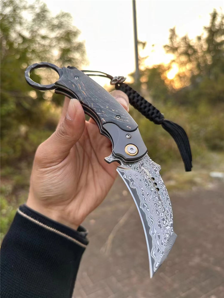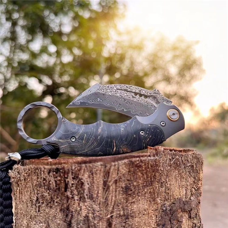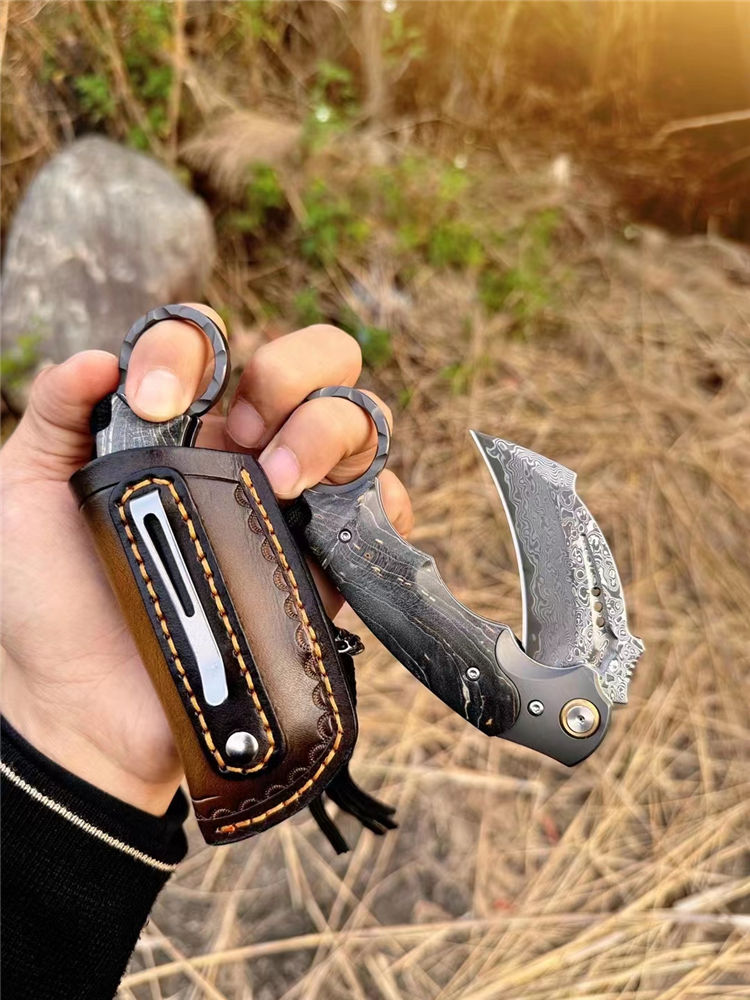 整体小巧,便于携带,刀片采用了日本进口大马士革钢制作,刀身拥有出色的锋利度和60HRC硬度,针尖型刀尖能提供足够的穿透力、滚轴轴承快开系统,单手轻松操作,刀柄设计比较符合人体工程学,搭配进口稳定木材质,有三个手指贴合凹槽,尾部有一个圆环,可以保证在使用的时候不会轻易地脱手,方便携带和快速出刀,高品质手工打造、皮套手工雕刻完成,背面口袋夹设计、非常不错的一款折叠爪刀、出口订单数量有限