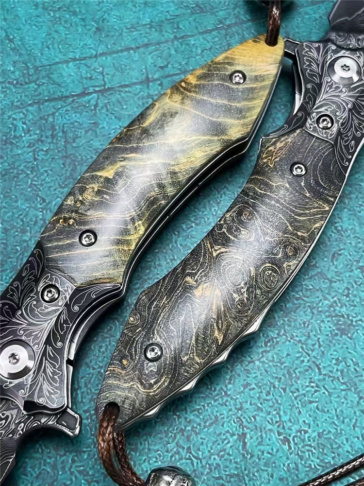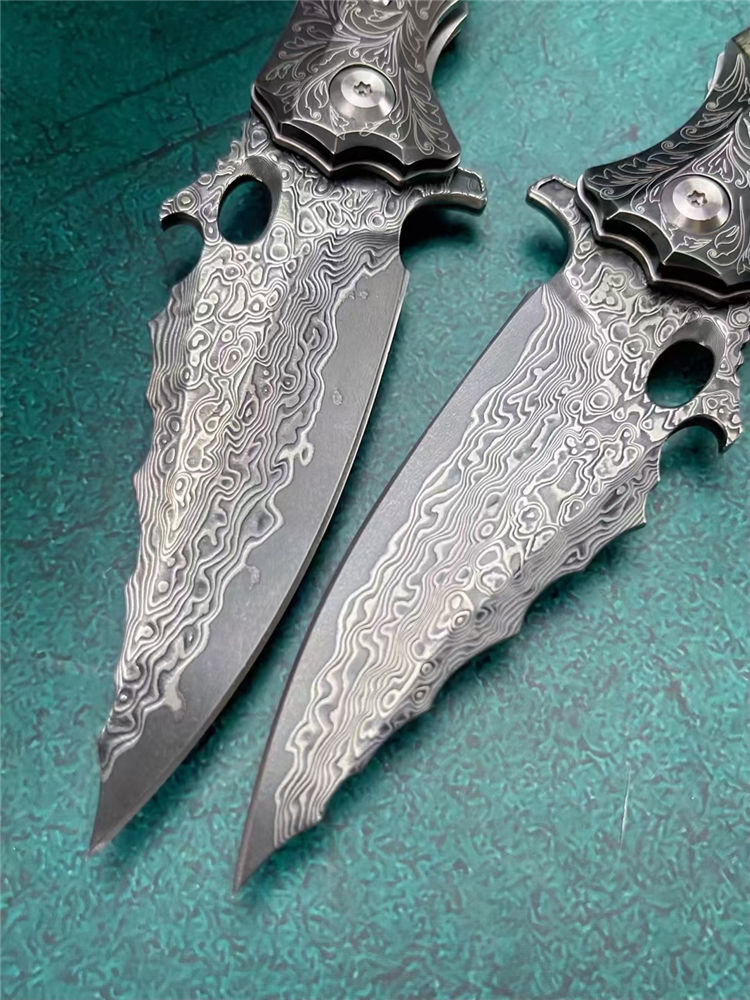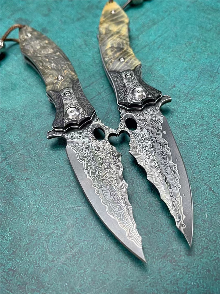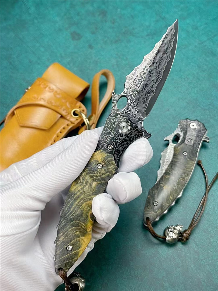 大马士革夜叉折刀 全长:190mm 刃长:75mm 刃宽:23mm 刃厚:3mm 刃材:进口锻造VG10大马士革钢 开刃方式:水冷多次开刃 硬度:60HRC 柄材:固化稳定木 皮套:植鞣皮手工雕花缝线制作 滚珠轴承快开结构
