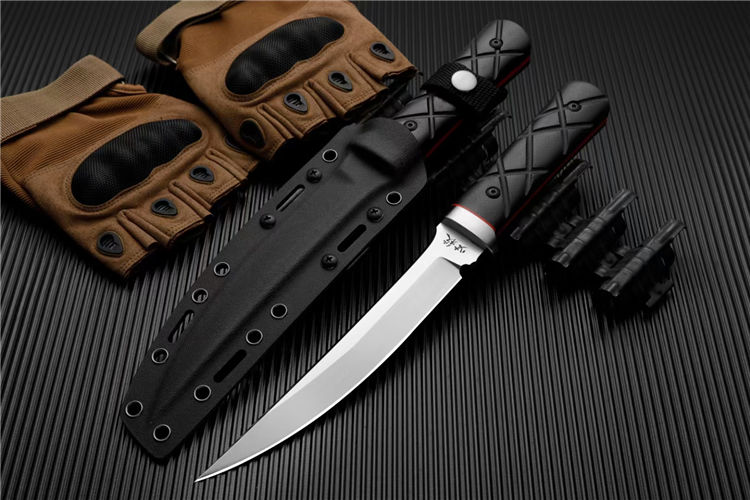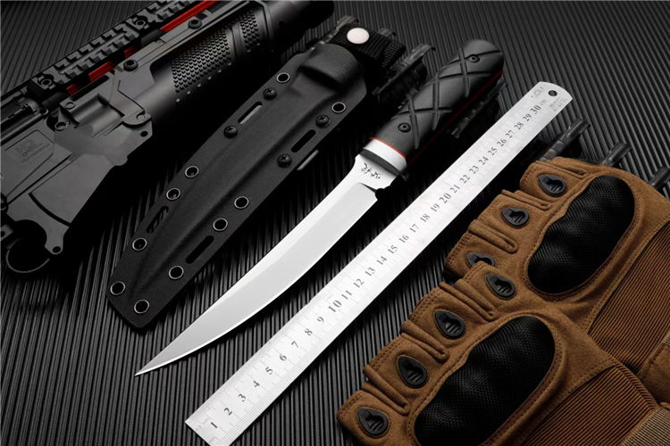 复刻版必杀刃直刀 全长:320mm 刃长:191mm 厚度:5.8mm 柄长:129mm 刃宽:27.5mm 钢材:进口3V粉末钢 刀鞘:2.0美国进口K鞘头 硬度:61 护手全钢,手柄亚麻柄一体龙骨刃面分段打磨上翘的刀尖,杀气凛凛,强壮的假刃,安心安然