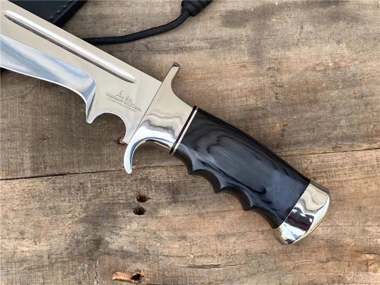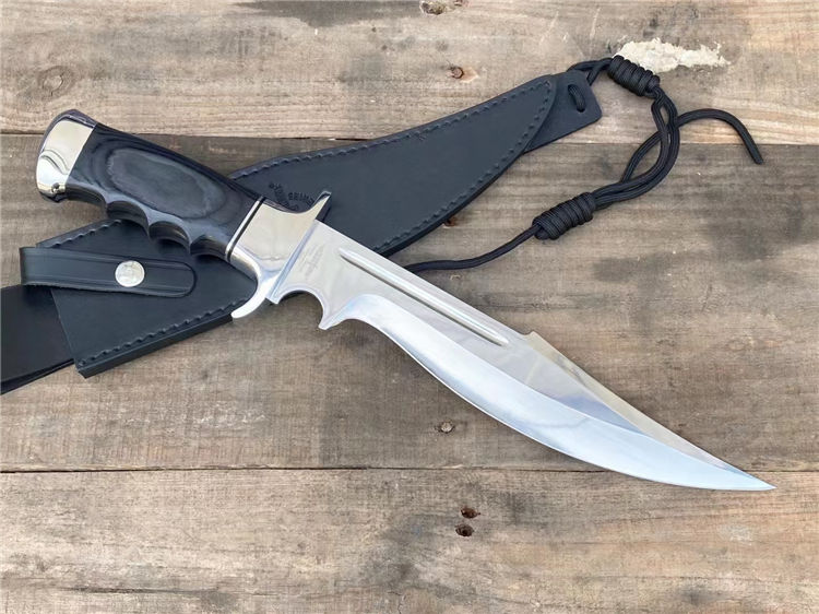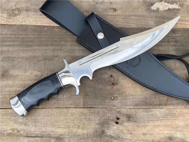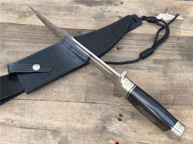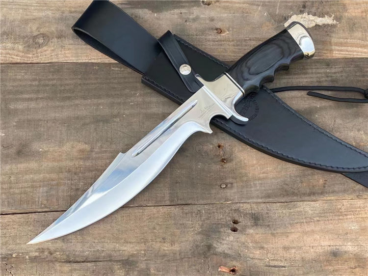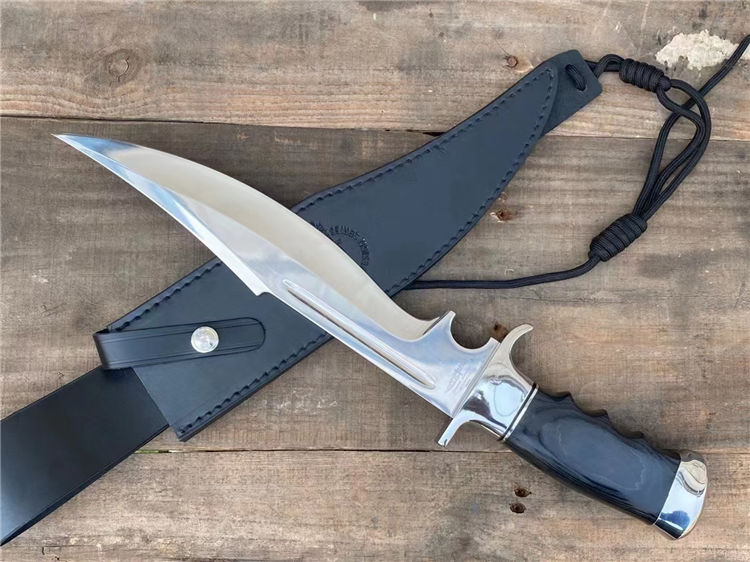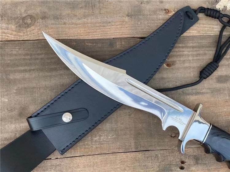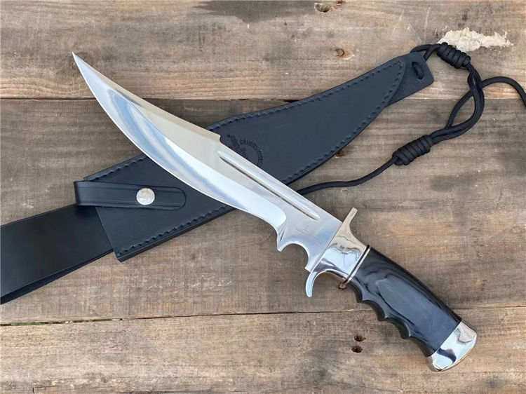 神希尔鲍伊军刀 全长:41.8CM 刃长:27.5CM 柄长:14CM 刃厚:5MM 刃宽:5.1cm 表面:镜光 重量:950gk 刃材:7CR15MOV 柄材:护手双钢头+黑彩木 硬度:58HRC 其他:彩盒 配:皮套