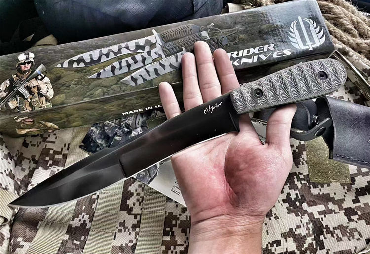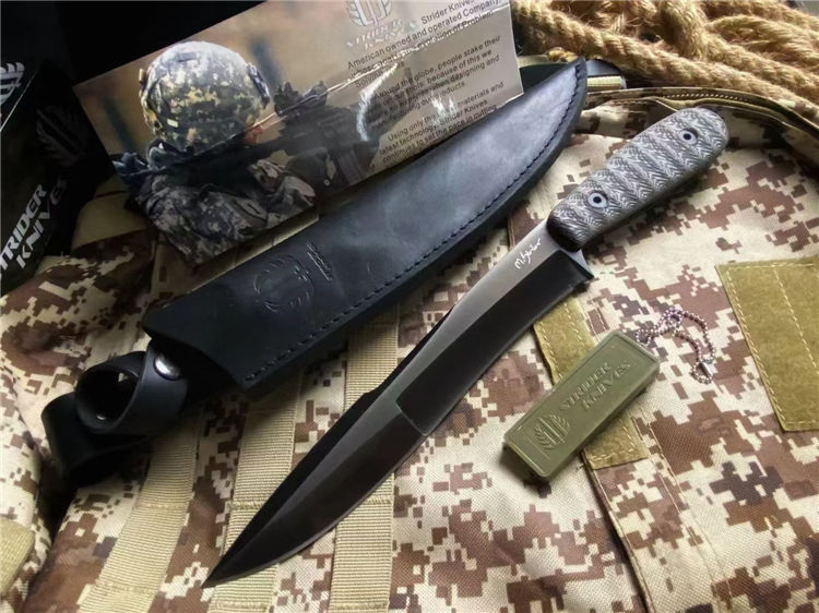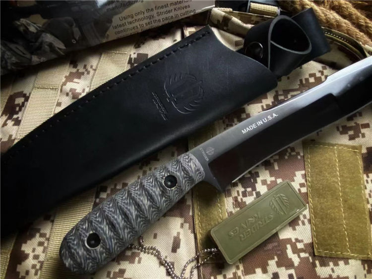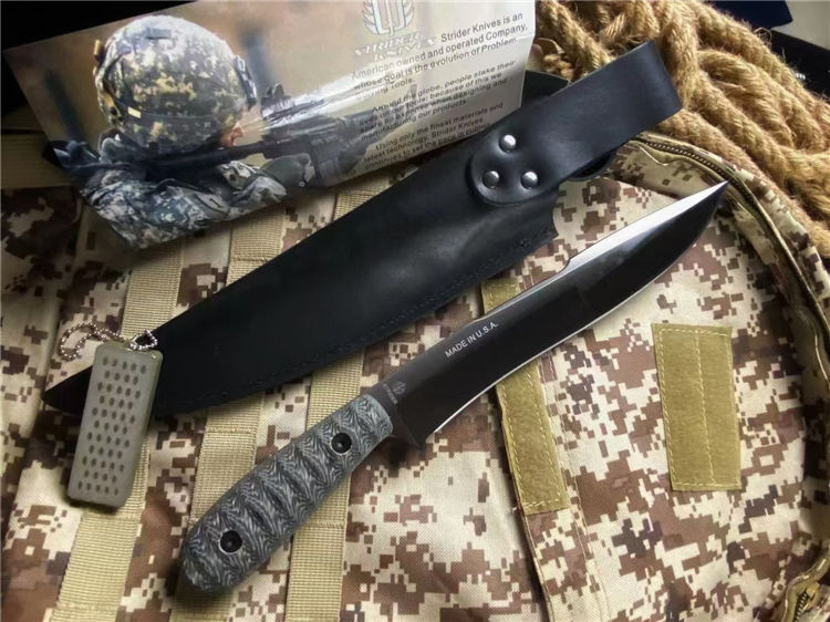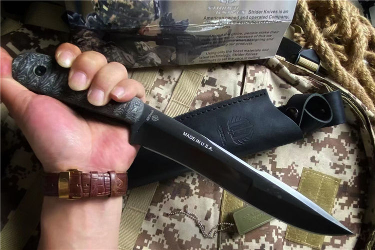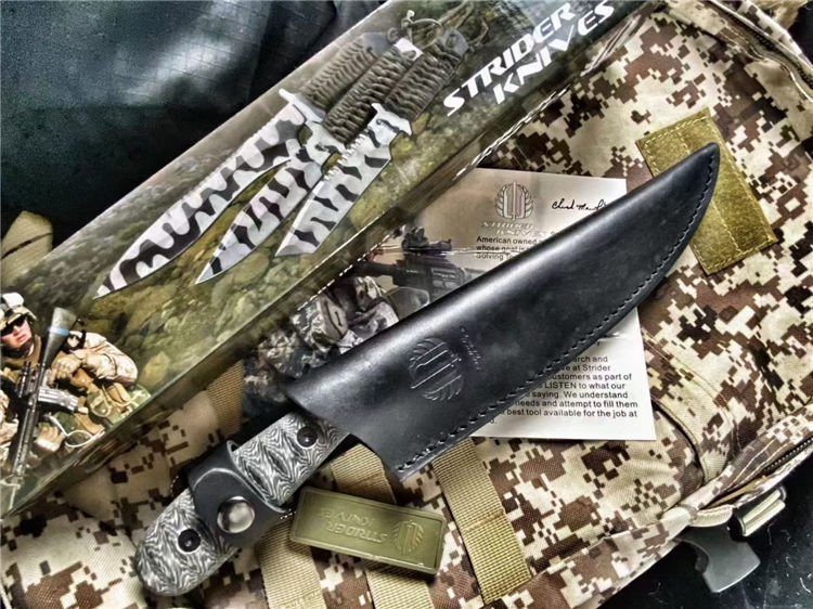 挺进者Strider Knives直刀 总长:35cm 刃长:23cm 刃厚:7mm 刃宽:3.4cm 钢材:进口A8模具钢 硬度:60HRC热处理 配备牛皮套,磨刀石,迷彩盒装:黑色手工盒子