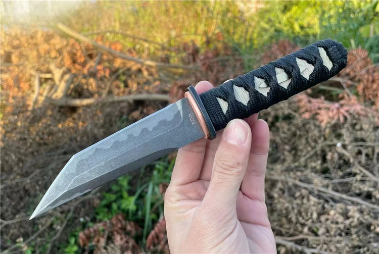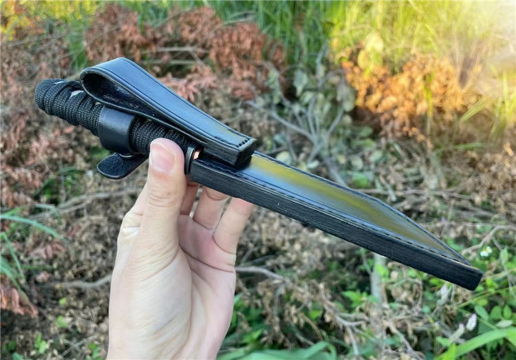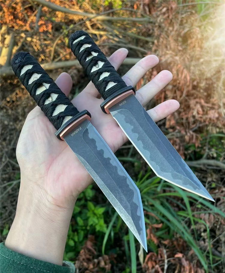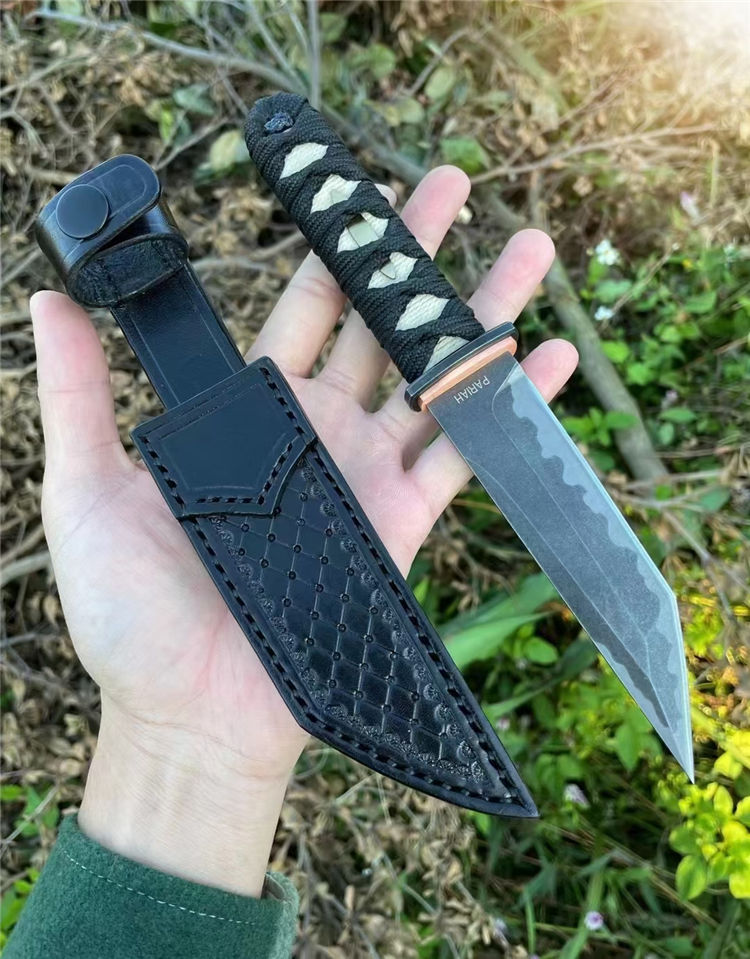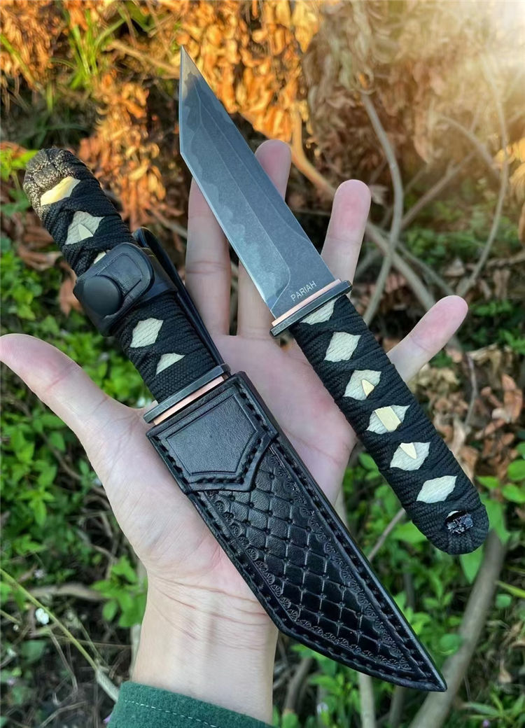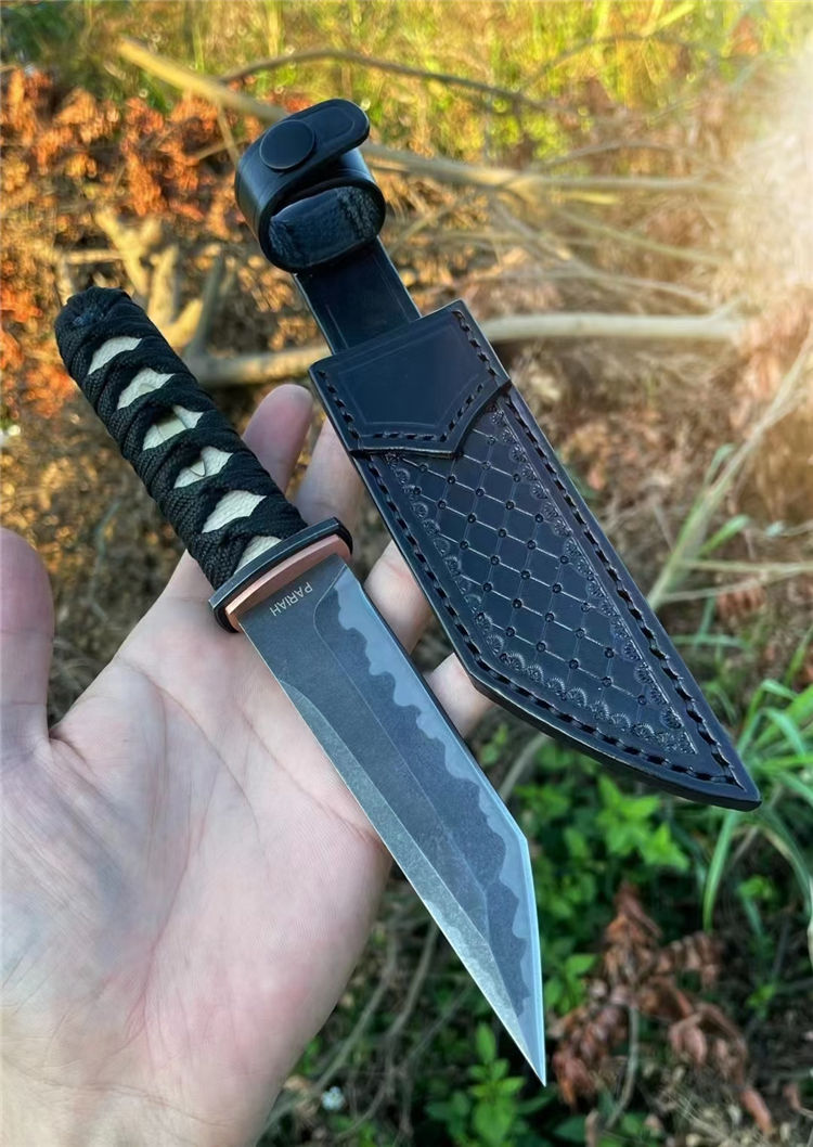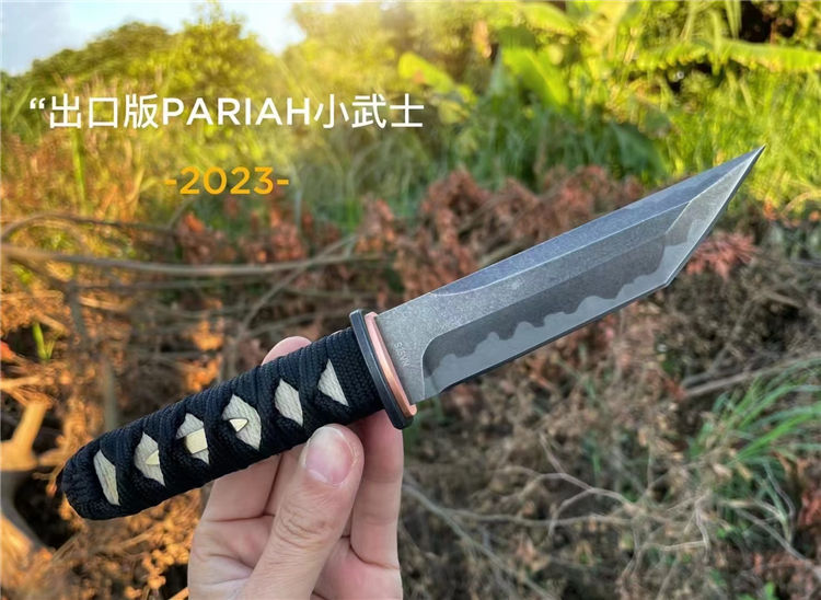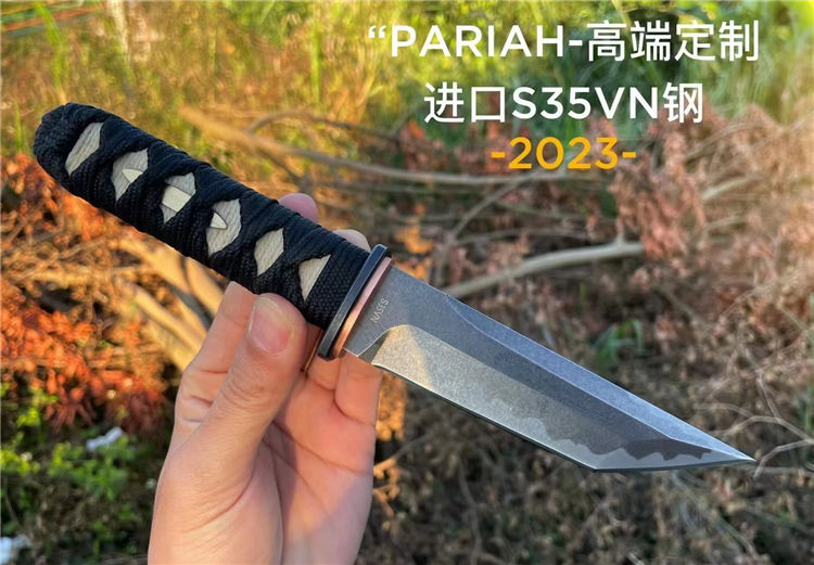 PARIAH武影者直刀 总长:23.5CM 刃长:11CM 刃厚:5MM 刃宽:3CM 钢材:S35VN钢 硬度:60-62HRC 热处理:专业真空热处理油淬,低温回火 重量:单刀200g,含鞘258G 表面效果:灰黑石洗迷彩工艺效果 柄材:实木缠绵绳子 结构工艺:一体龙骨钢材入柄内固定 刀套:高品质手工制作植鞣皮纯手工缝线染色 包装:手工盒子包装