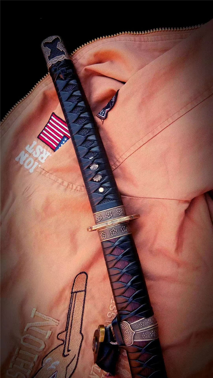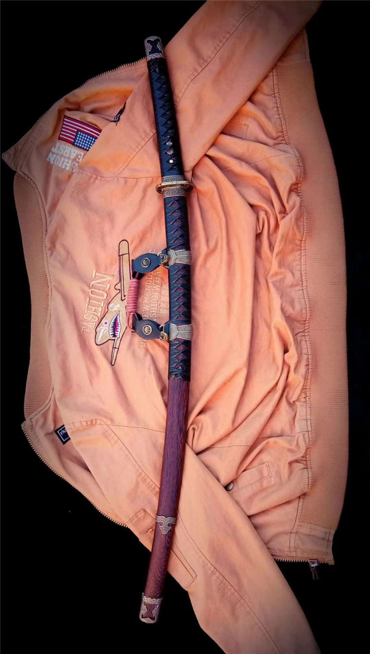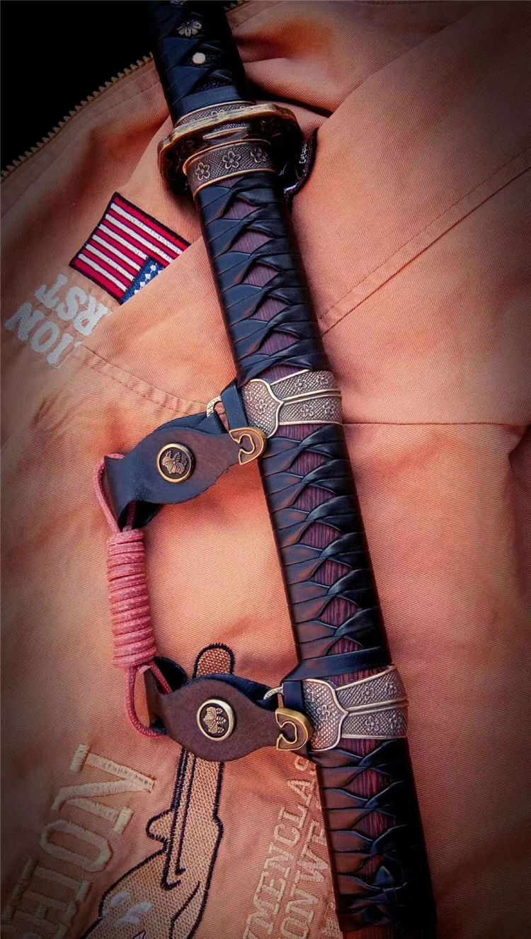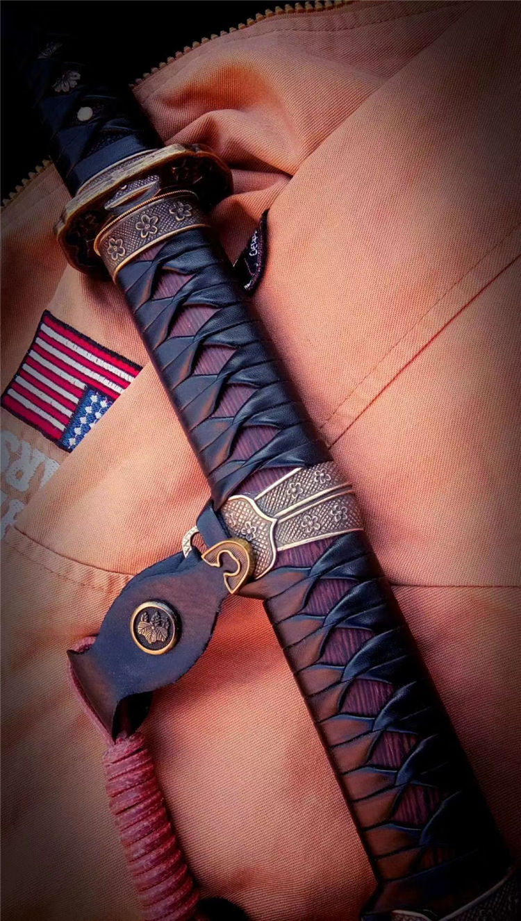 刀身为弹簧钢锻造,手工开槽,研磨开刃,鞘为鸡翅木,手工下料打磨,缠绳。配精美太刀配饰,纯铜刀镞,雕刻家徽,刀柄实木缠绳