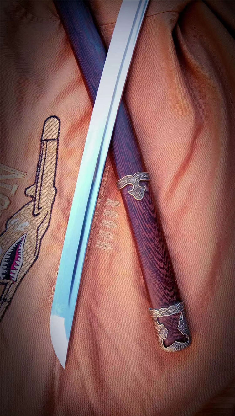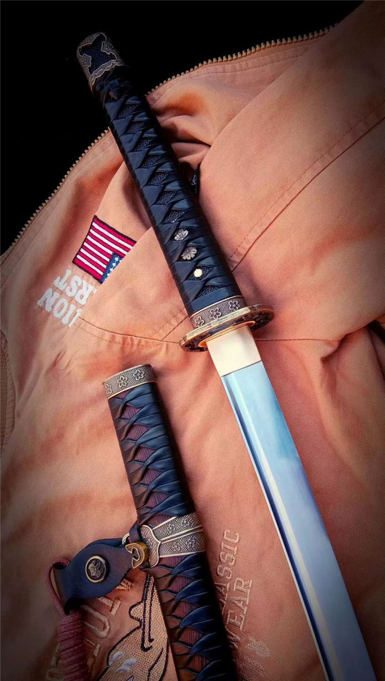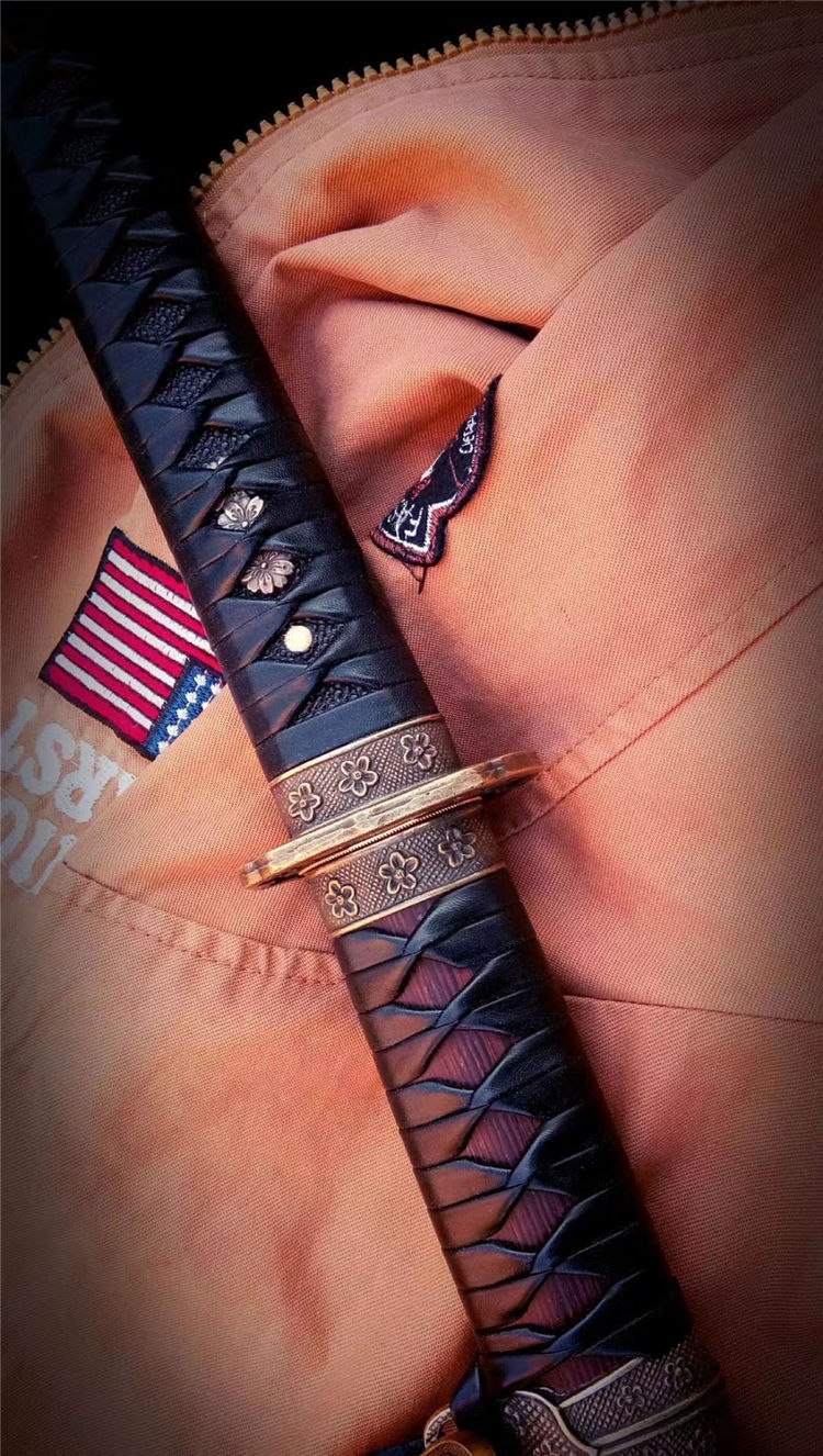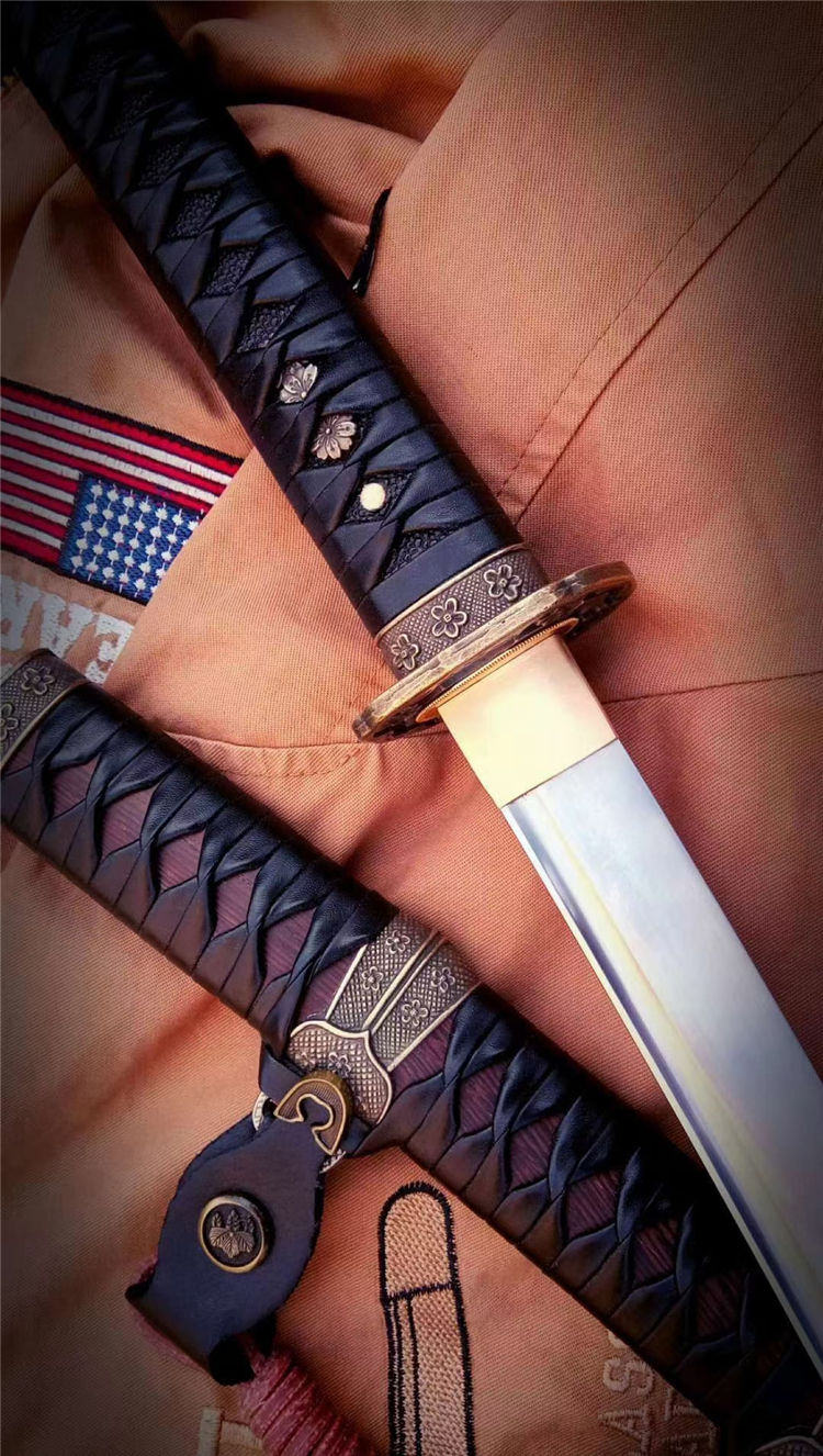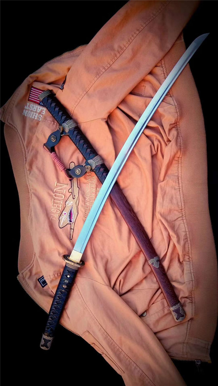 刀身为弹簧钢锻造,手工开槽,研磨开刃,鞘为鸡翅木,手工下料打磨,缠绳。配精美太刀配饰,纯铜刀镞,雕刻家徽,刀柄实木缠绳