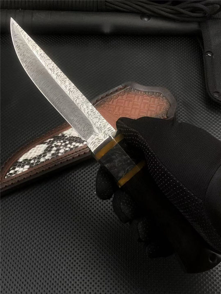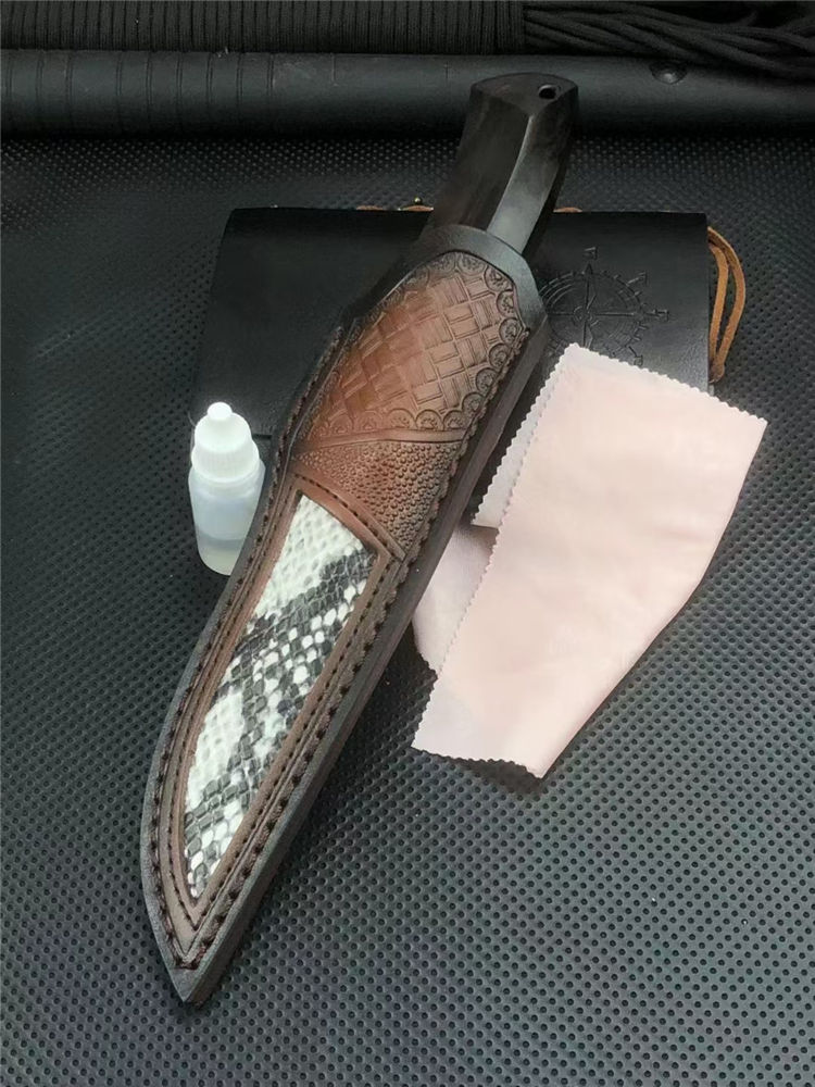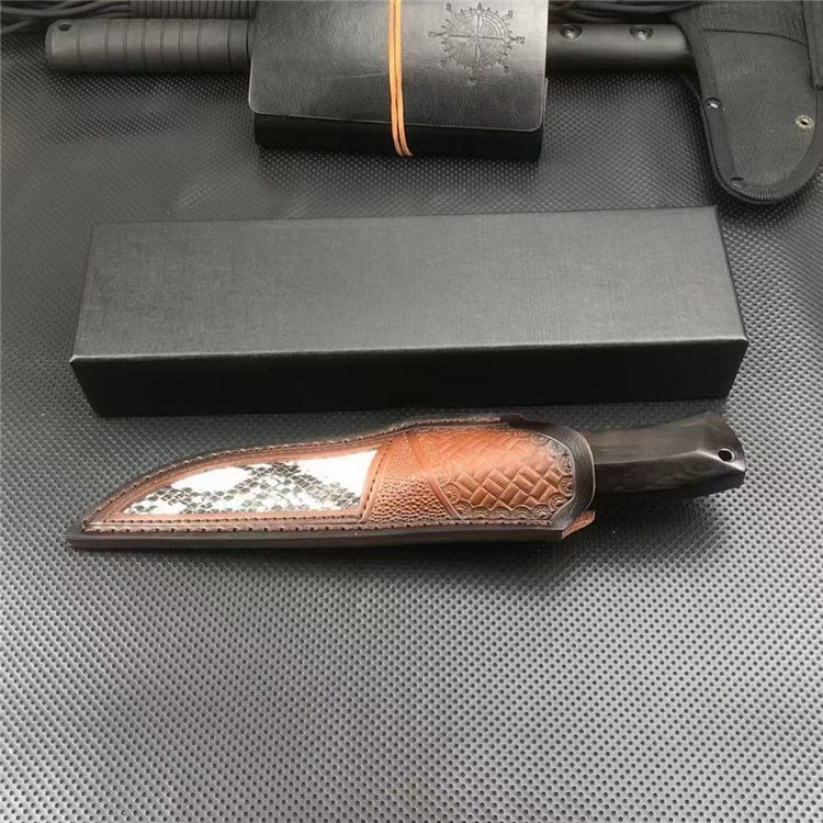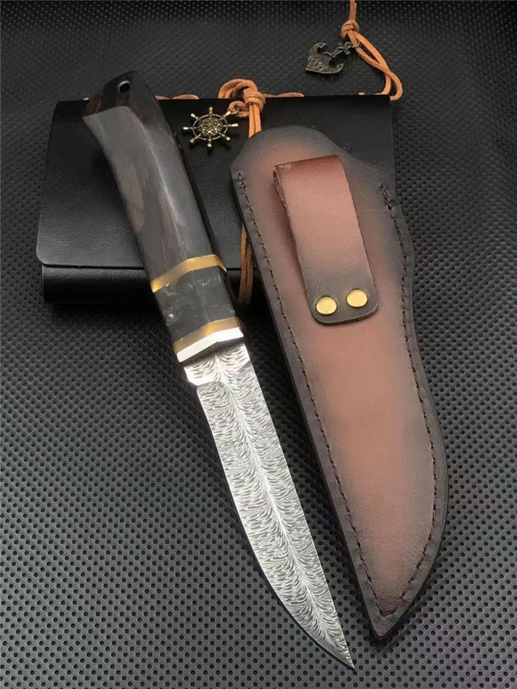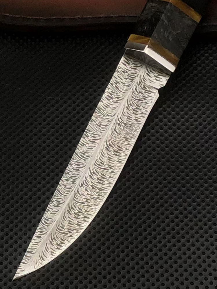 魅影腐蚀纹直刀 总长:25.2cm 刃长:12.7cm 柄长:12.5cm 刃宽:2.5cm 厚度:3.5mm 净重:295.8g(含包装、毛重:187.9g(含鞘) 钢材:9Cr15Mov 表面:腐蚀羽毛纹 硬度:59~60HRC 手柄:固态木+黑檀木 皮套:真牛皮刀套+礼品盒