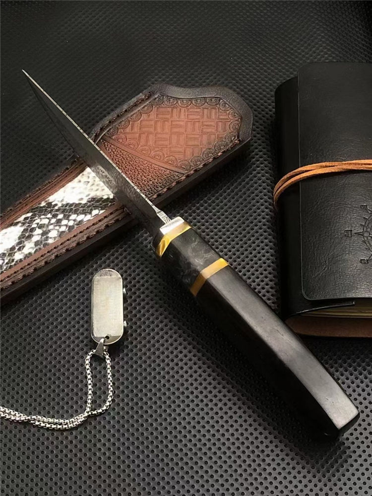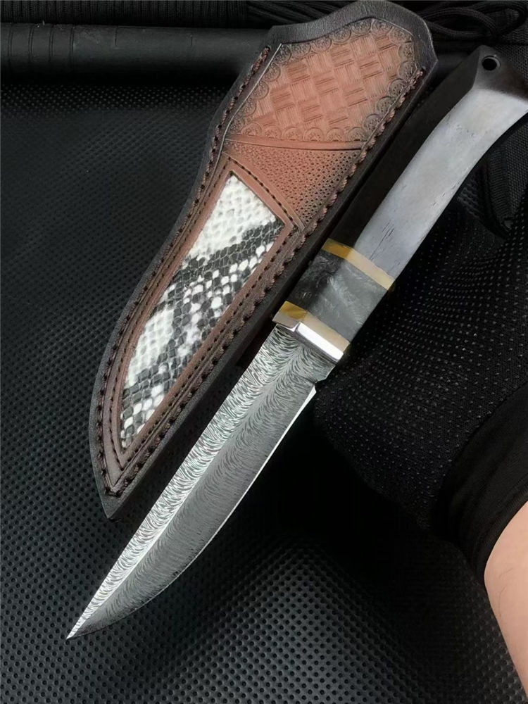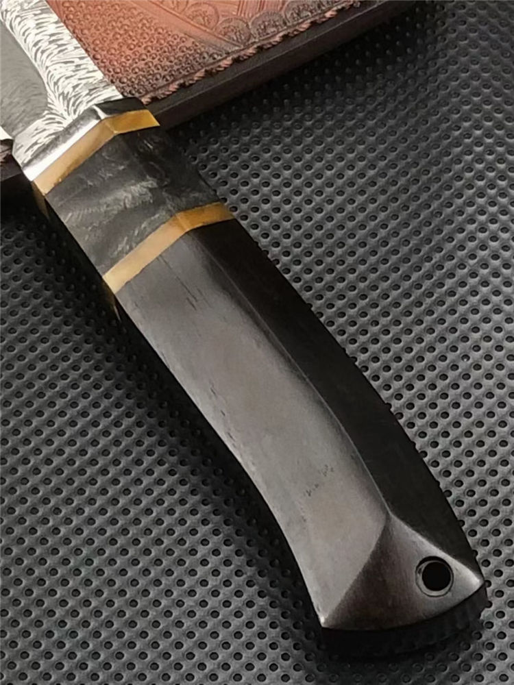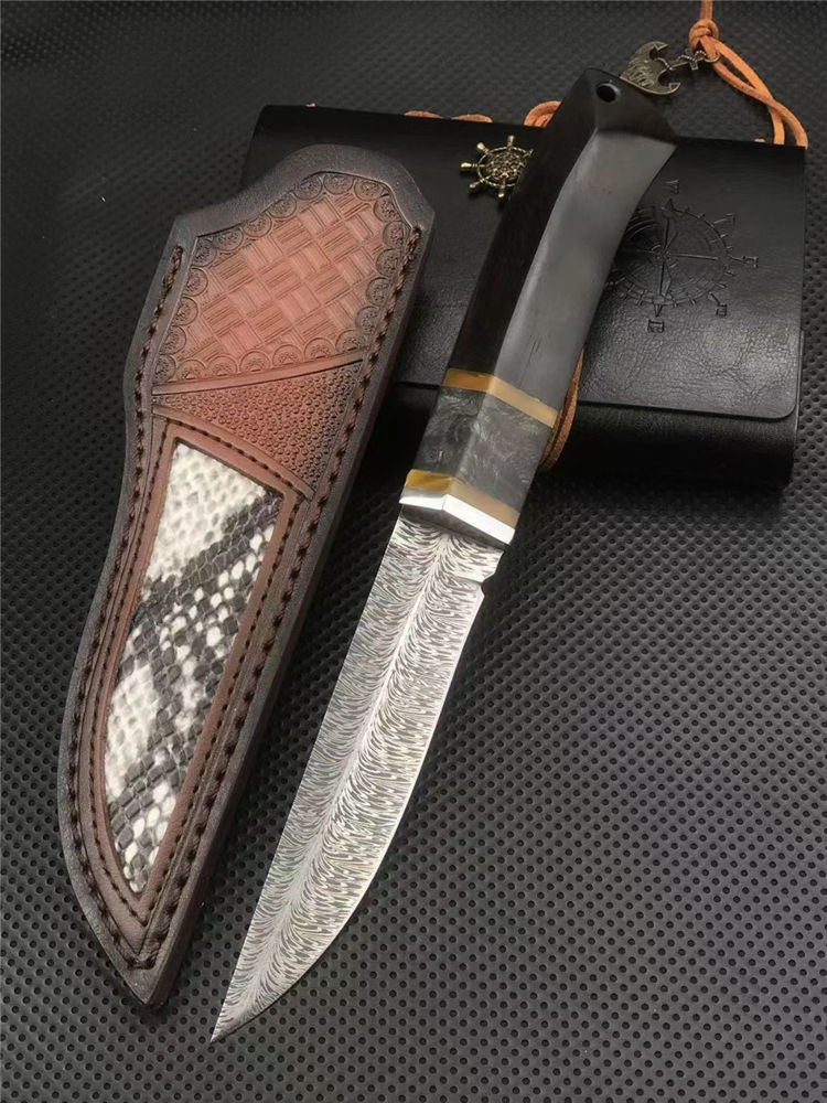 魅影腐蚀纹直刀 总长:25.2cm 刃长:12.7cm 柄长:12.5cm 刃宽:2.5cm 厚度:3.5mm 净重:295.8g(含包装、毛重:187.9g(含鞘) 钢材:9Cr15Mov 表面:腐蚀羽毛纹 硬度:59~60HRC 手柄:固态木+黑檀木 皮套:真牛皮刀套+礼品盒