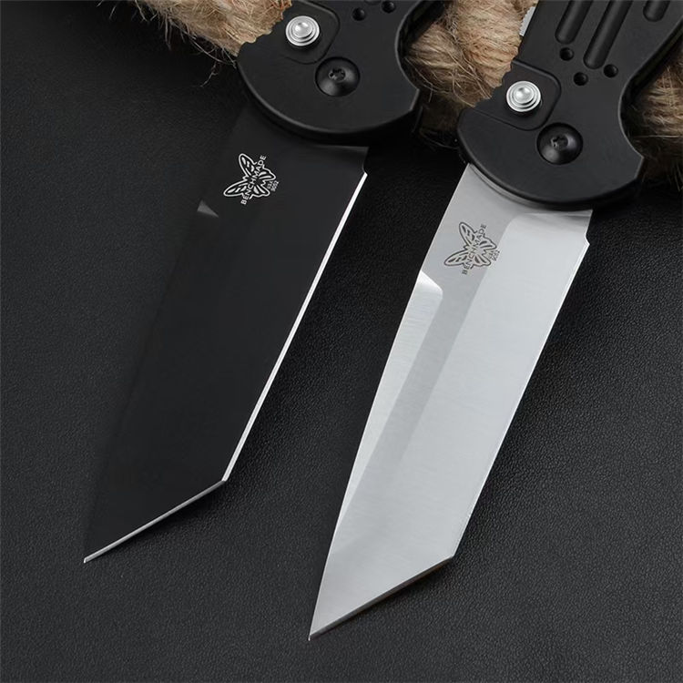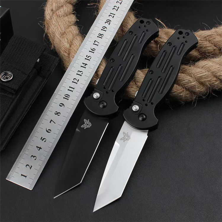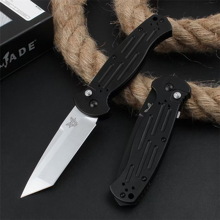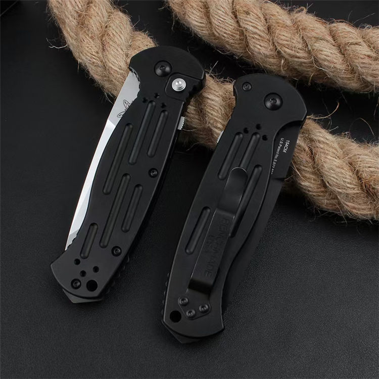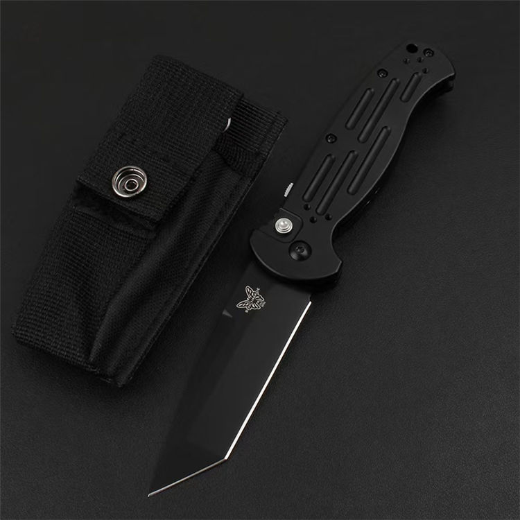 蝴蝶9052侧开跳刀 全长:216mm 刃长:90mm 闭合:126mm 钢材:154CM 刃厚:3.2mm 硬度:59-60HRC (超高硬度,非常锋利) 表面:锻光或黑色BK消反光涂层 净重:122.8g 重量:215g(含包装物) 柄材:6061 T6铝合金+尾部破窗锥+阳极氧化经CNC电脑锣成型,极度精密 开启方式:按钮式开启,附带安全锁定保险 设计者:BENCHMADE design 附件:一个战术尼龙鞘 包装:原装彩盒 说明书