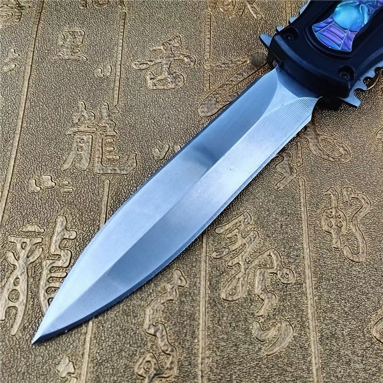 2号直出跳刀 总长:24.2CM 刃长:10CM 刃宽:2CM 厚度:2.5MM 材质:440C 柄材:锌合金 柄长:14.2CM 柄宽:12MM 柄厚:2.5MM 重量:240G