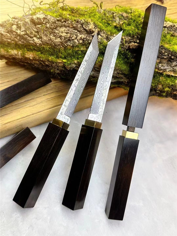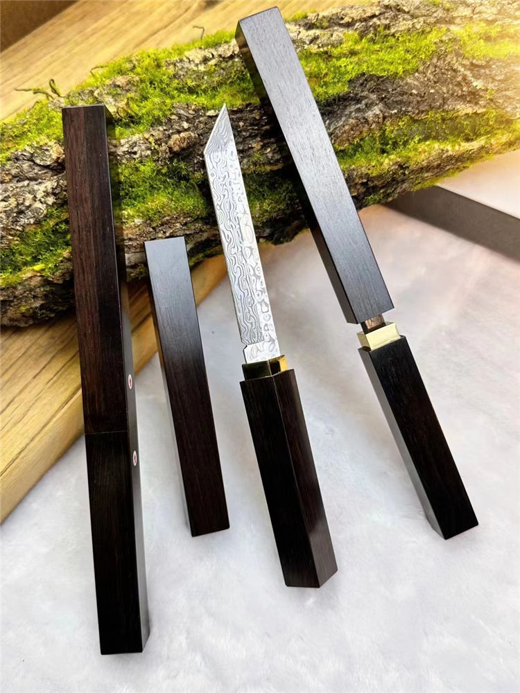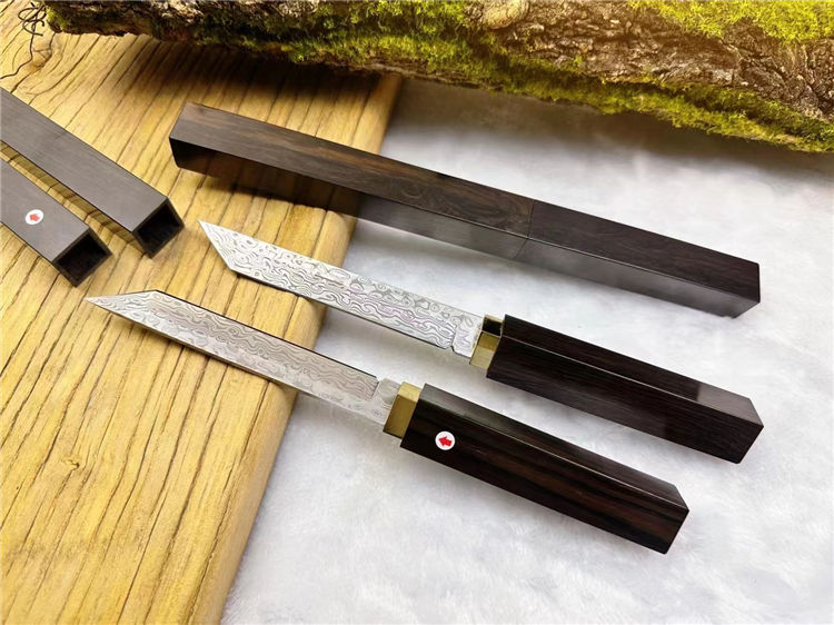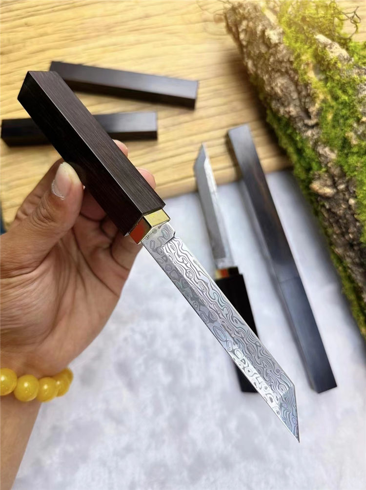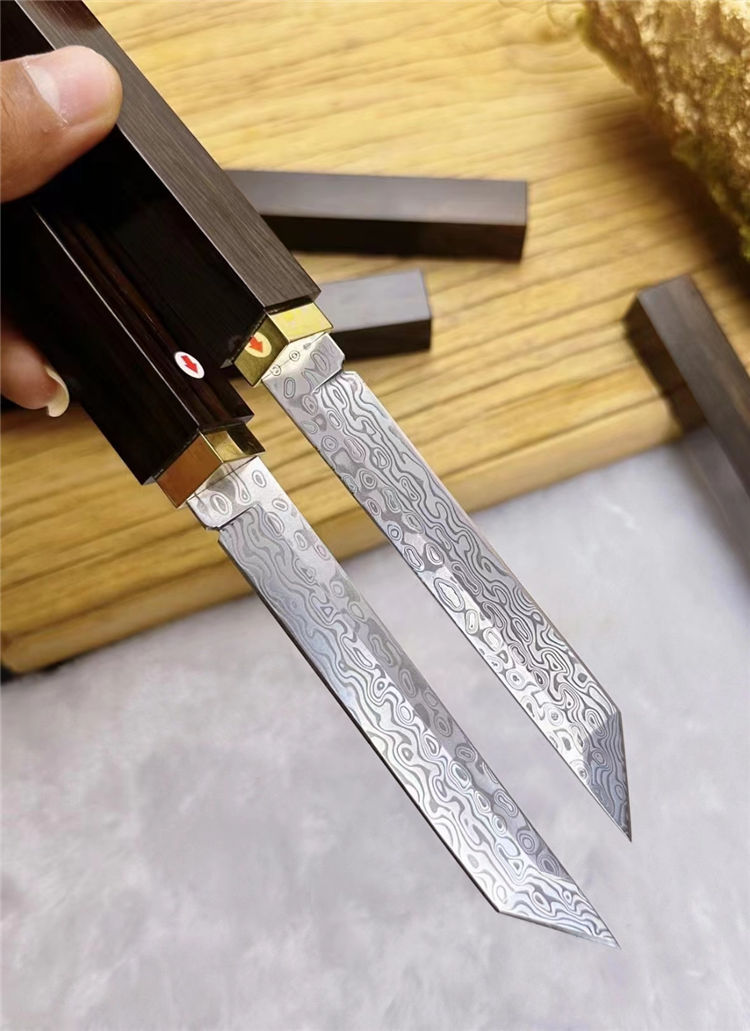 大马士革简道小武士刀 总长:12cm 刀刃:11cm 手柄:9.5cm 刃宽:1.5cm 厚度:2.8mm 钢材:进口锻造大马士革钢(96层无钢芯) 硬度:61-62HRC 柄材:纯黄铜镶嵌+老料黑檀木 重量:118g 包装:手工黑色礼品盒