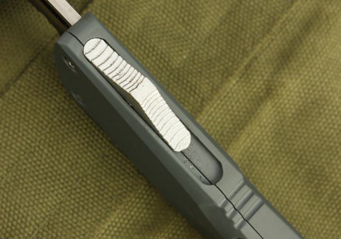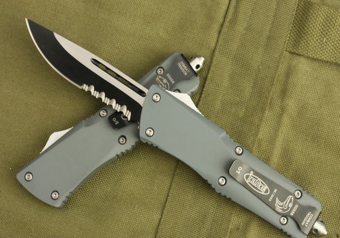 微技术.小号伤齿龙(灰色) 全 长: 22cm (含尾锥长度) 刃 长: 8.5cm 刃 厚: 3mm 刃 材: 440 硬 度: 58HRC 刀净重:150克 总重量: 260克(含包装物) 表 面: 黑钛(刀刃) 柄 材: 锌铝合金 刀 鞘: 尼龙 锁 闭: 弹簧直出 补充说明:直出弹簧刀的点头现象得到了很好的控制,出刀轻而快!手感好! 刀柄表面采用了喷塑处理,手感不错,刀柄采用锌合金铸造处理,硬度较高,稳定性较好。 配内外彩盒(双盒)包装,高档尼龙刀套。无说明书。