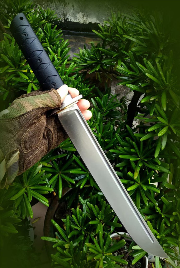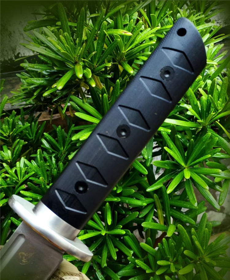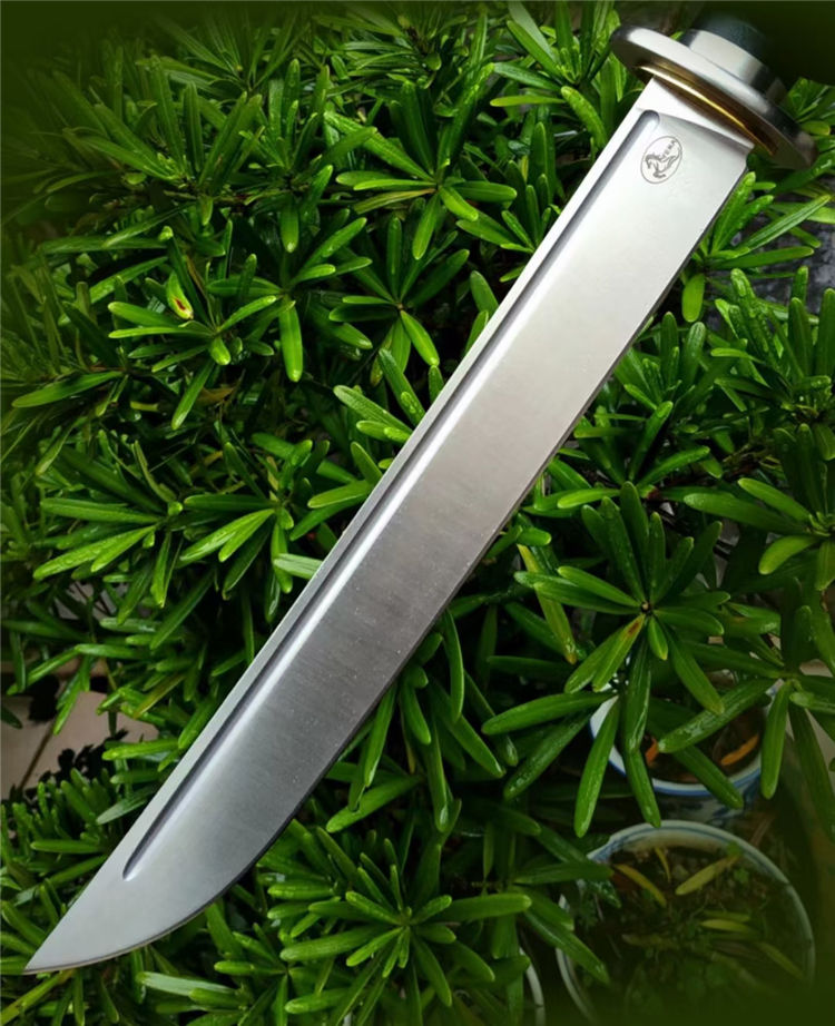 野马征途Ⅳ直刀 全长:42.8cm 刃长:28.2cm 柄长:14cm 刃宽:3.5cm 刃厚:6.2cm 刃材:DC53磨具钢 柄材:G10 硬度:真空处理60-61HRC 重量:480克 刀套:K鞘