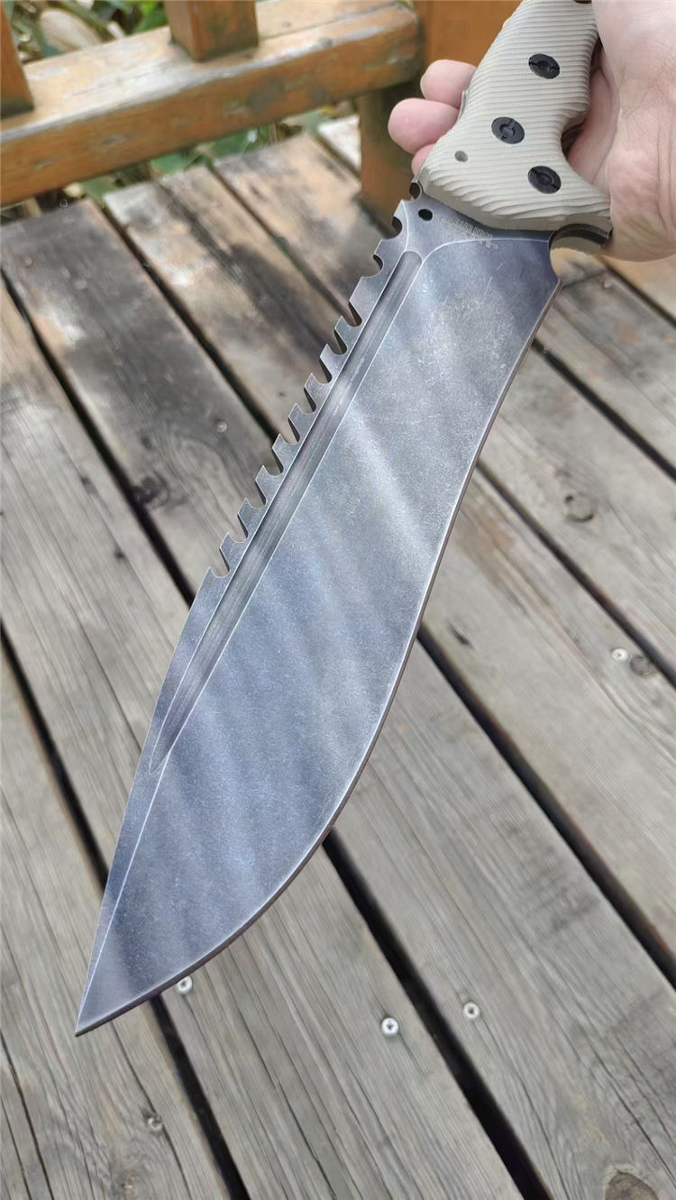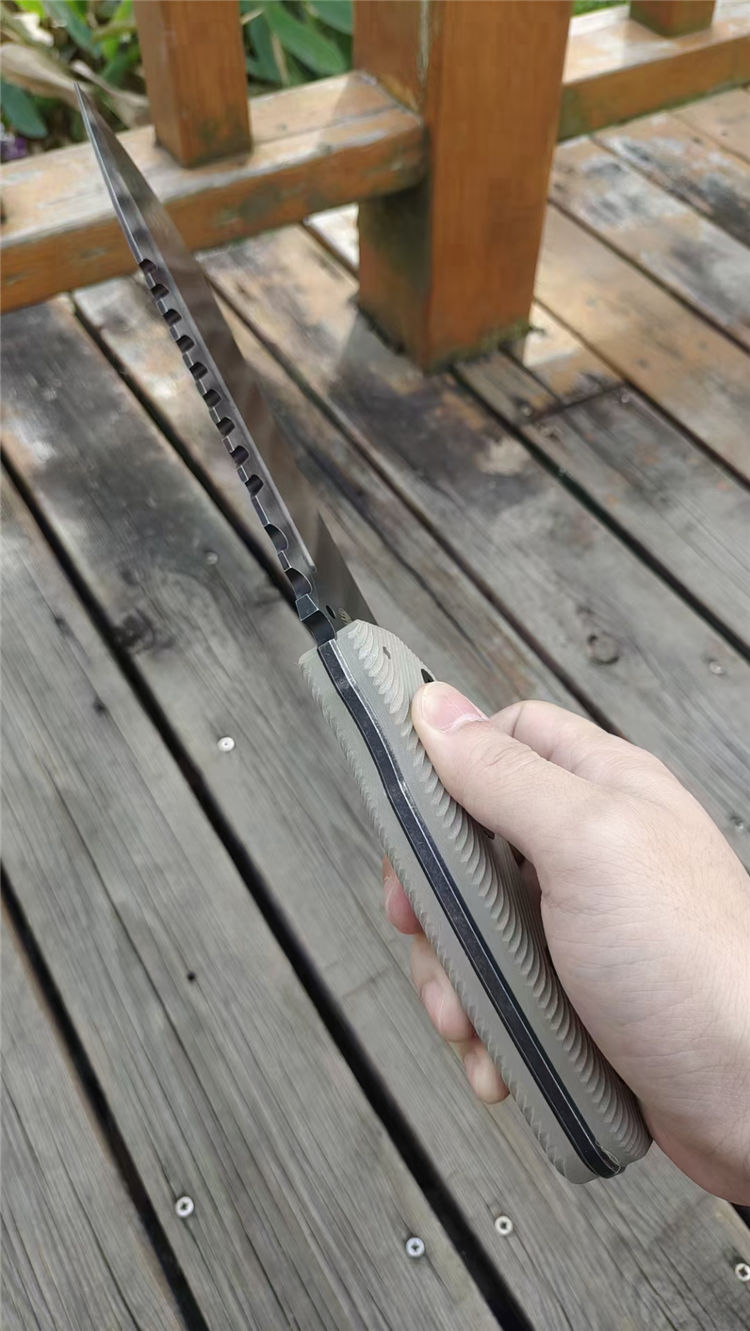 米勒兄弟M31直刀 全长:370mm 刃长:225mm(开刃部分) 柄长:145mm 刃宽:52mm 刃厚:6.0mm 刃材:进口A8钢 刀重:625g单刀 毛重:940g(含鞘) 硬度:60+HRC 热处理:专业真空深冷让处理油淬 表面:双色阳极氧化钛涂层高级精密度石洗黑钛工艺 柄材:G10高密度碾压材料 结构:一体龙骨成形 配套:进口K鞘+进口意大利手工制作植鞣皮 包装:黑色手工盒子(合作代工出口版简包)