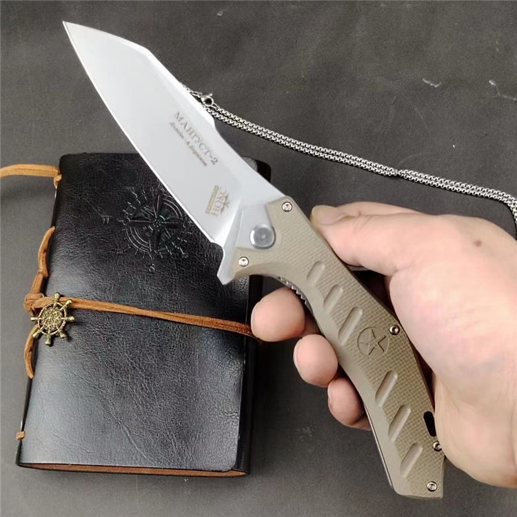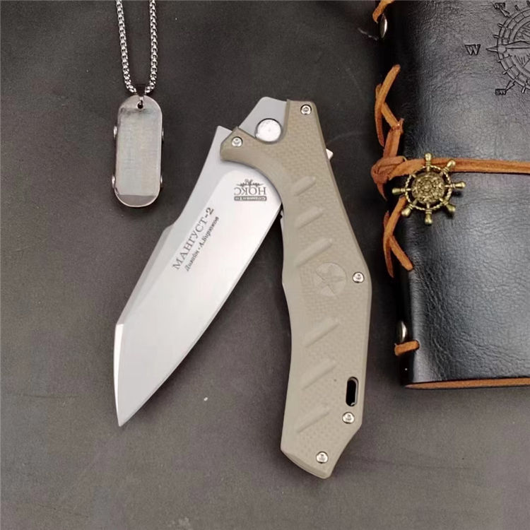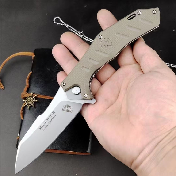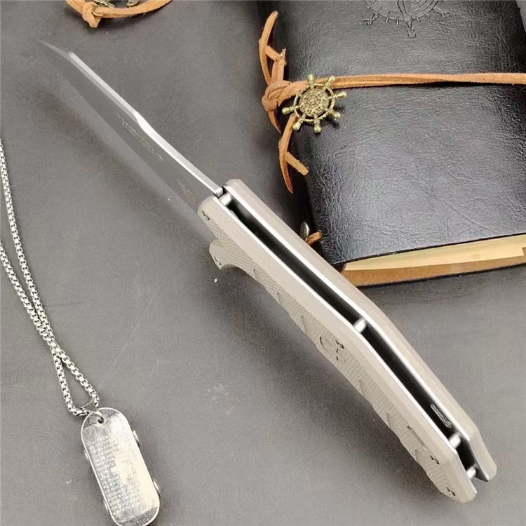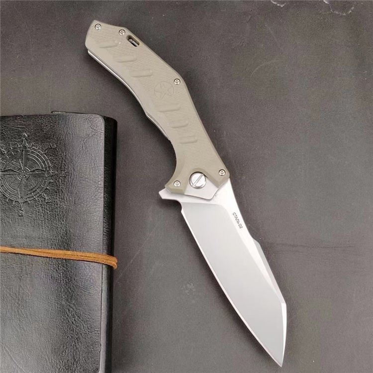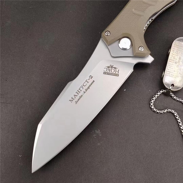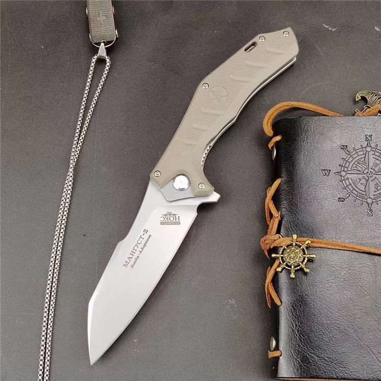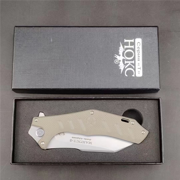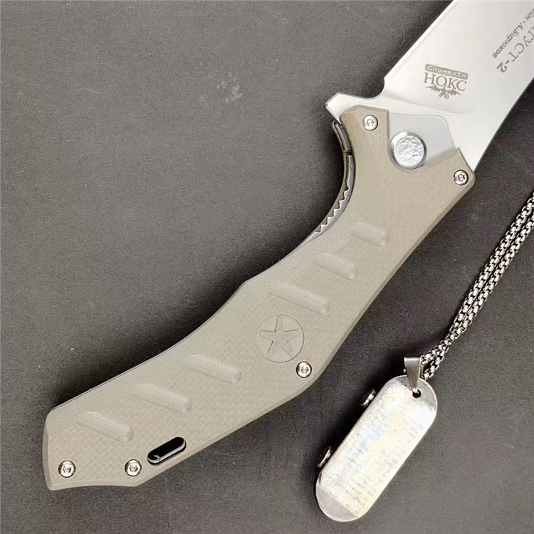 三角龙折刀 全长:230mm 刃长:100mm 折合:130mm 刃宽:30mm最宽处 刃厚:3.5mm 刃材:进口CPM-D2 刀重:173.6g 毛量:225.8g(含鞘包装盒) 硬度:60-61+HRC 表面:滚珠喷纱 柄材:G10高密度碾压材料 结构:一体龙骨 配套:进口硬质皮套 包装:原装HOCK黑礼品盒
