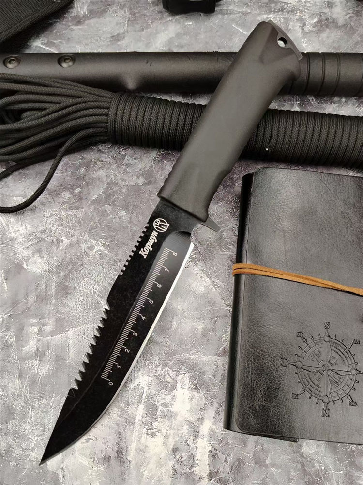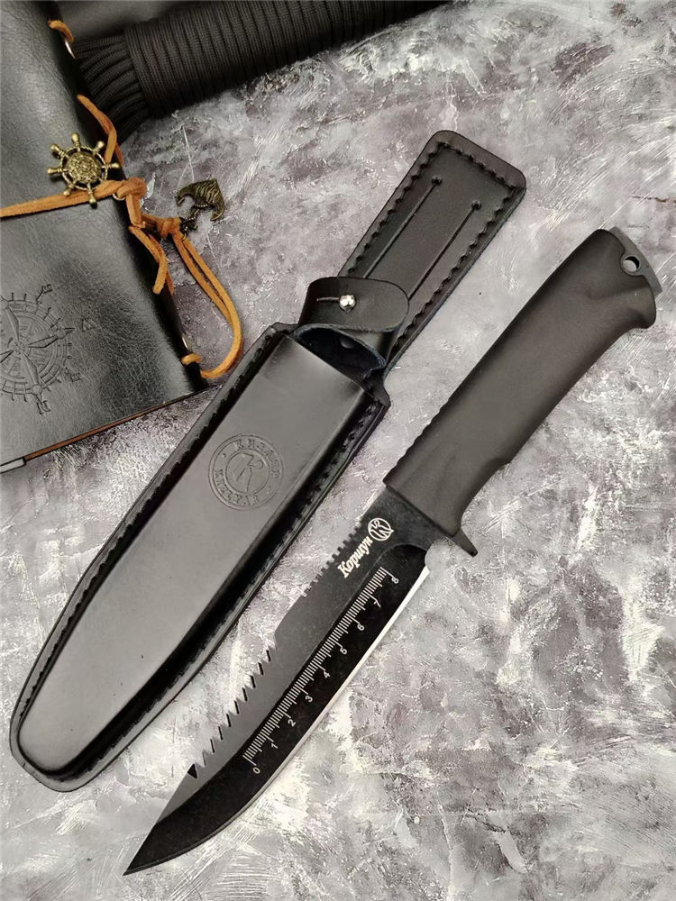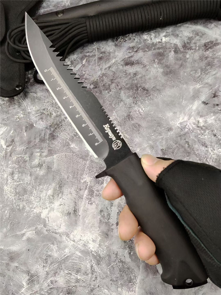 俄罗斯特种部队克服魔尺直刀 全长:28.5cm 刃长:16.1cm 柄长:12.4cm 厚度:0.49cm 宽度:3.1cm(最宽处) 硬度:58-60HRC 刃材:9Rc18Mov 柄材:ABS+橡胶 配套:手工牛皮套 包装:迷彩袋+纸合 重量:393.8g(含包装) 净重:325.3g(含鞘)