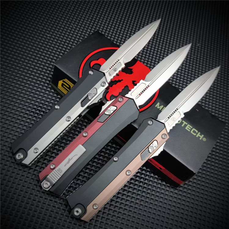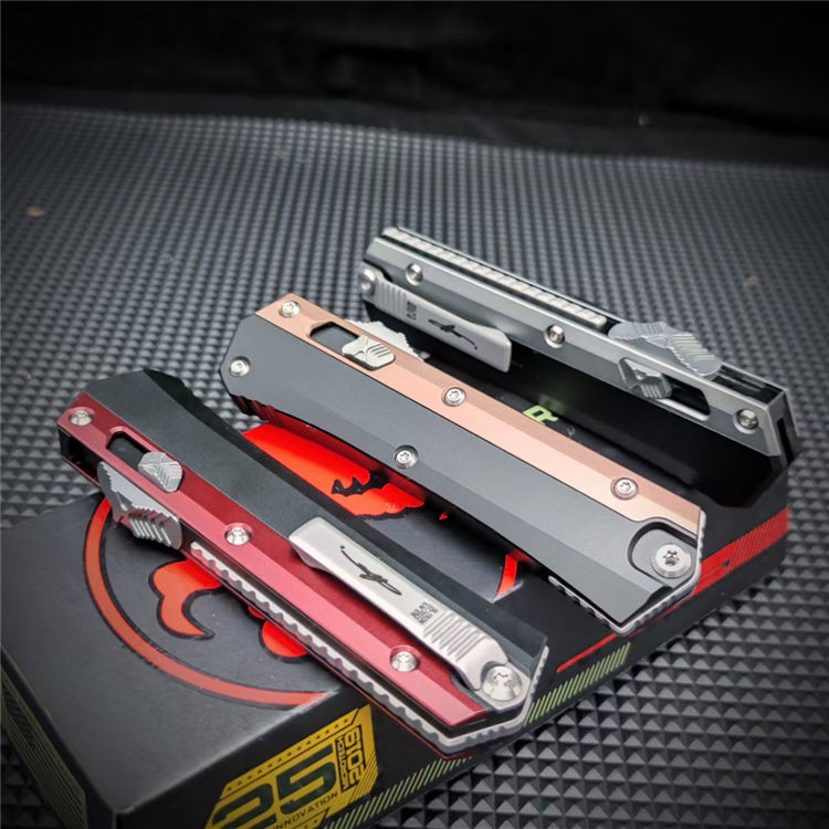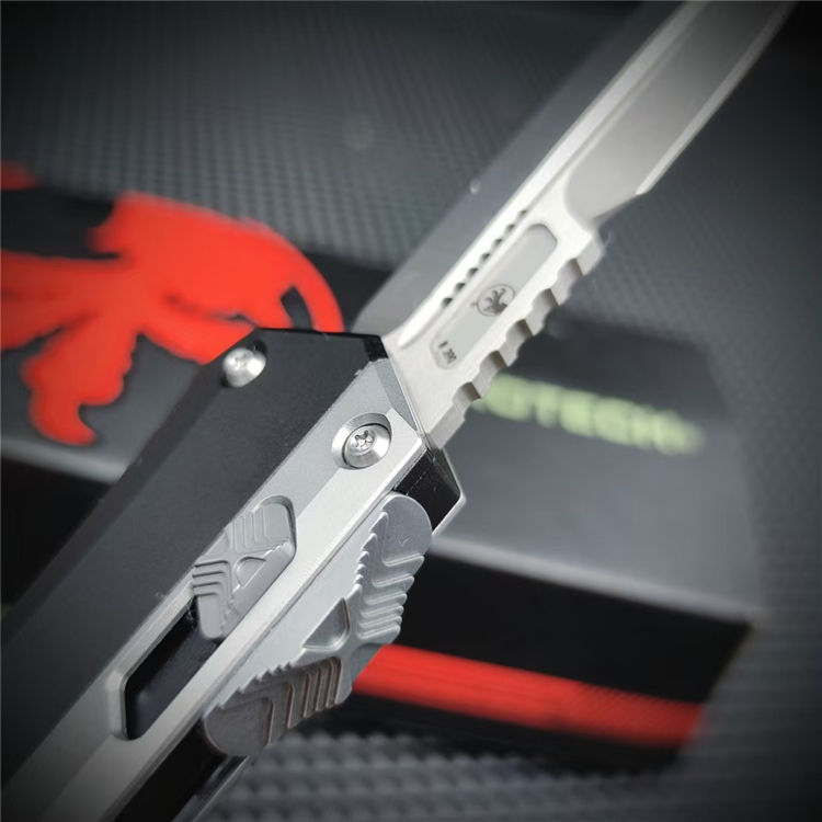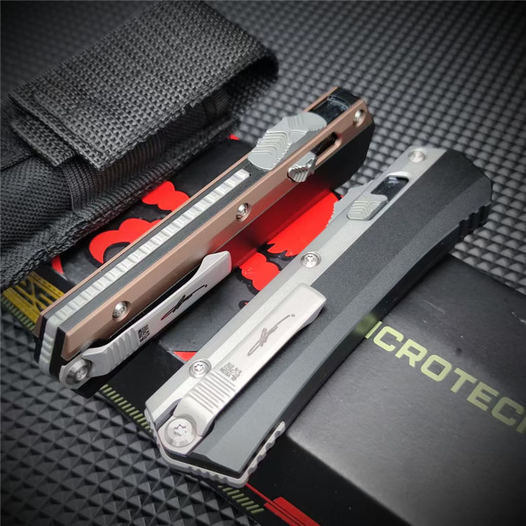 微技术蛇王直出跳刀 总长:22CM 刃长:9.1CM 刃宽:2CM 刃厚:3MM 材质:D2 硬度:58-60HRC 柄材:铝合金镶嵌G10 柄龙:TC4钛合金 柄长:11.9CM 柄宽:33MM 柄厚:15MM 净重:148G 袋夹:TC4钛合金 刀鞘:尼龙鞘