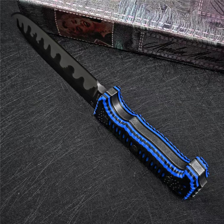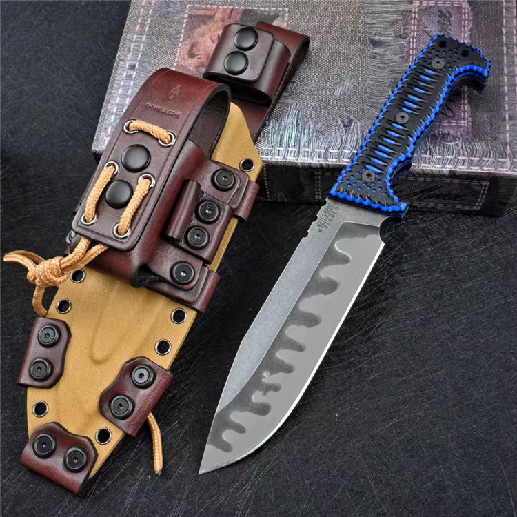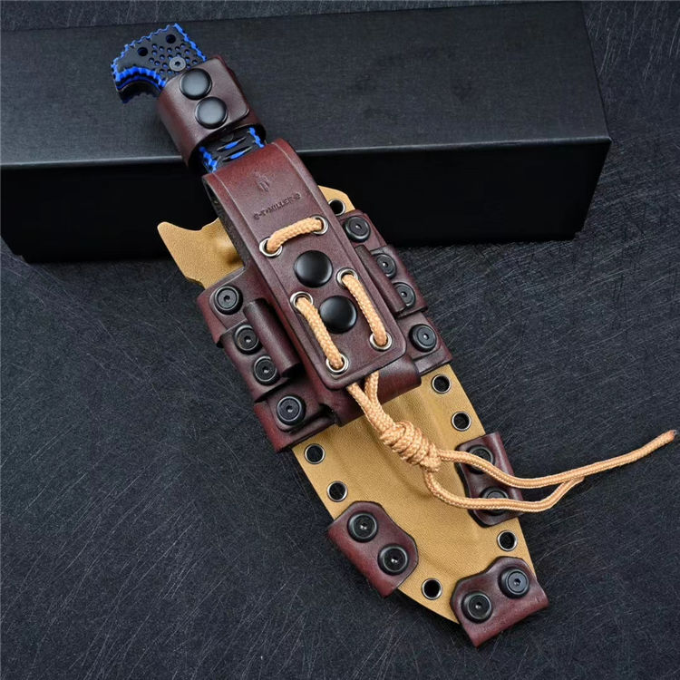 米勒兄弟M8直刀 全长:29.9cm 刃长:16.1cm 柄长:12.8cm 刃厚:0.8cm 刃宽:4.3cm 刀重:587g(单刀)936g(加套) 毛重:1176g 钢材:Z-wear 柄材:G10 硬度:60-61HRC LOGO:CNC精雕 包装:黑色手工盒子 刀鞘:手工进口K版鞘+意大利进口植鞣皮手工制作