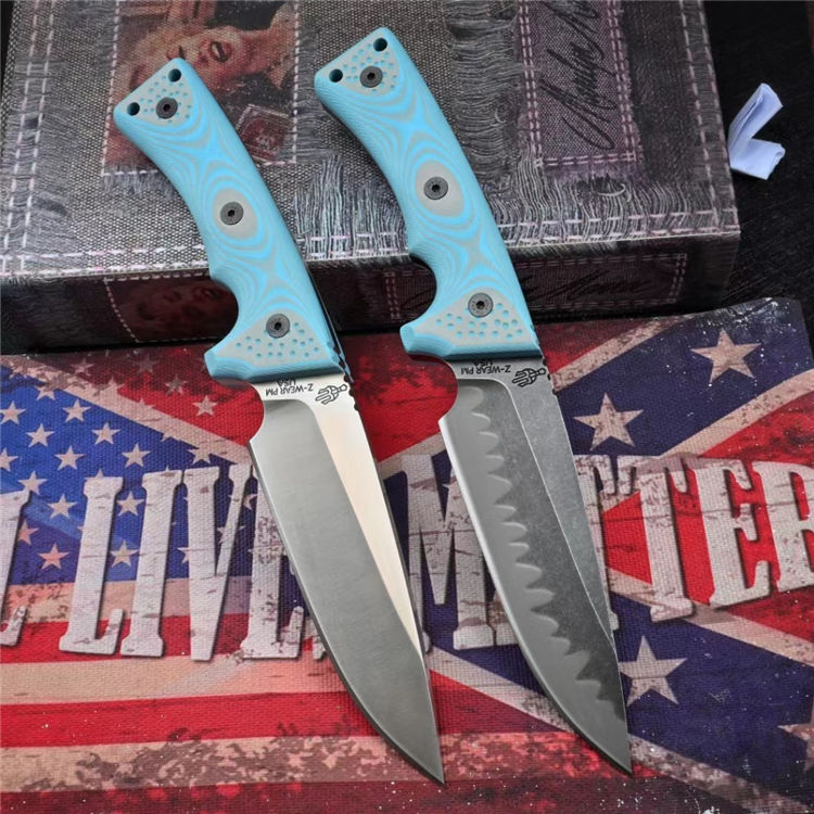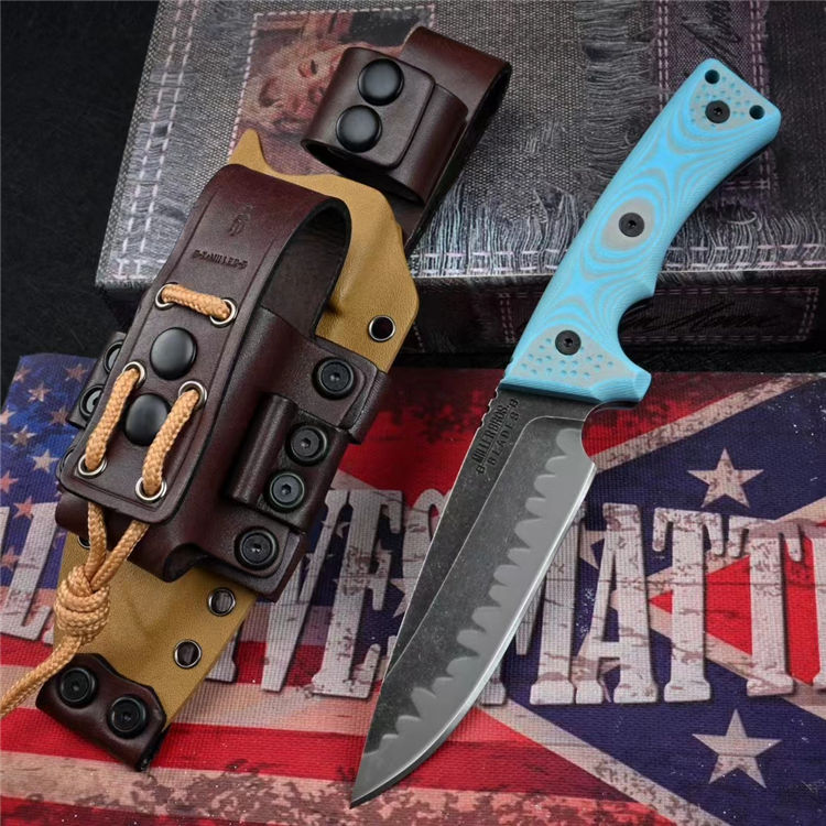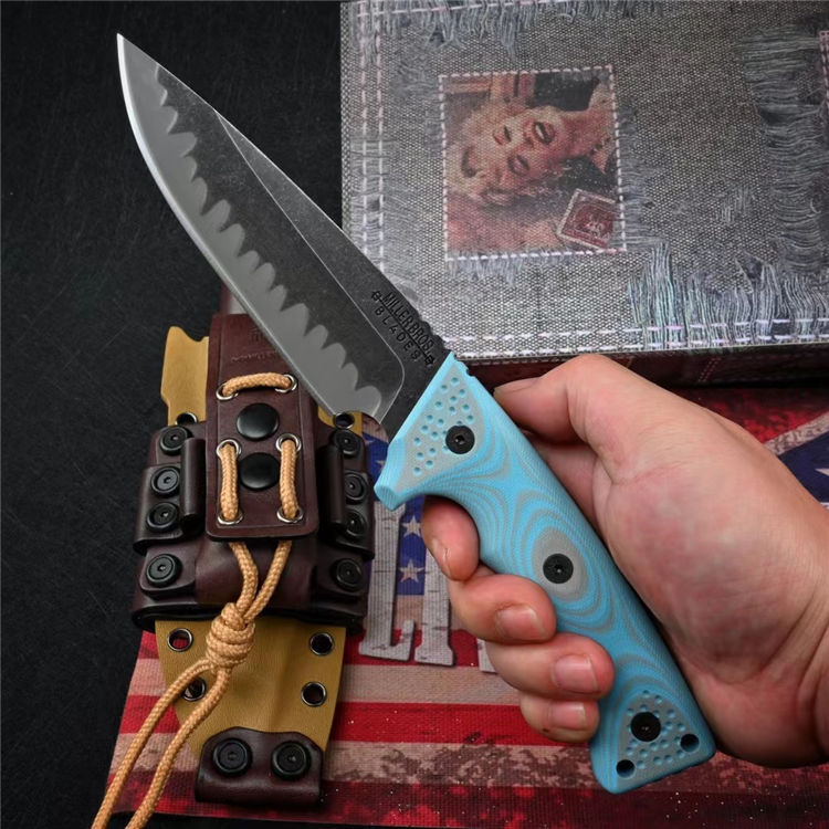 米勒兄弟M35直刀 全长:26.1cm 刃长:12.6cm 柄长:13.1cm 刃厚:0.7cm 刃宽:4cm 刀重:443g(单刀)747g(加套) 毛重:986g 钢材:Z-wear 柄材:G10 硬度:60-61HRC LOGO:CNC精雕 表面:烧刃纹和砂光 包装:黑色手工盒子 刀鞘:手工进口K版鞘+意大利进口植鞣皮手工制作