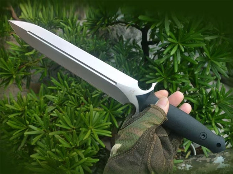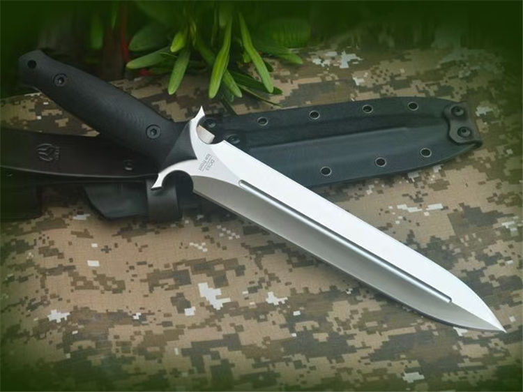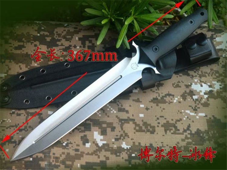 博尔特冰锋直刀 全长:367mm 刃长:227mm 柄长:140mm 刃最宽:40mm 刃厚:6mm 刃面处理:精细幼砂光钢本色 类型:以锋利度,耐磨韧性保持度最出色 开刃方式:二次开刃 刃材:DC53钢 热处理:真空油淬,2次回火处理,使钢材韧性保持性更佳 硬度:60HRC 柄材:黑色G10+对锁螺丝,一体全柄,握感更舒服,性能更强悍 净重:450克 刀鞘:配K鞘+皮带扣 包装附件:配送护刀油+刀绳