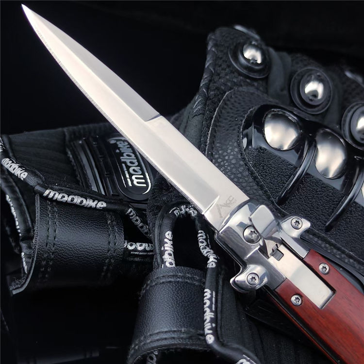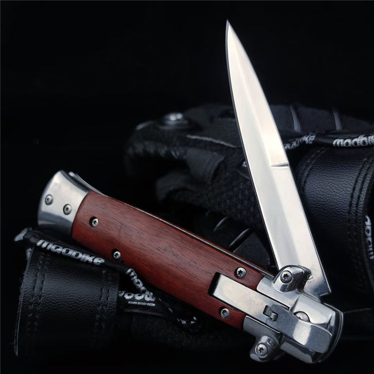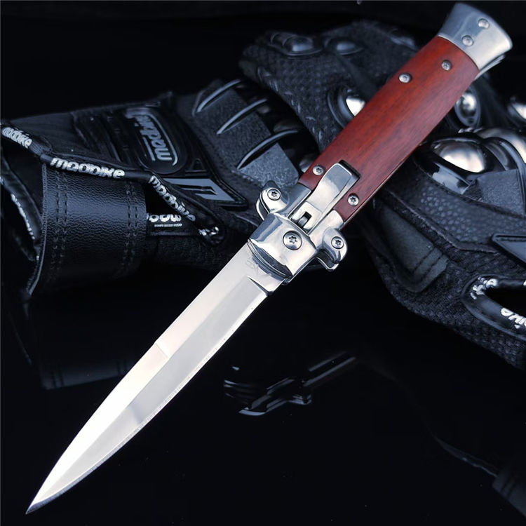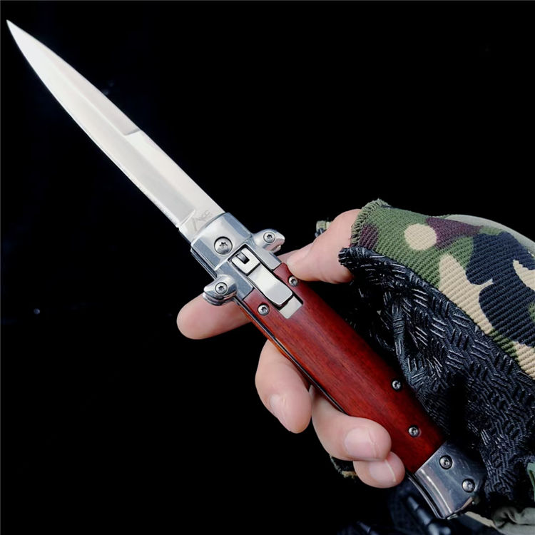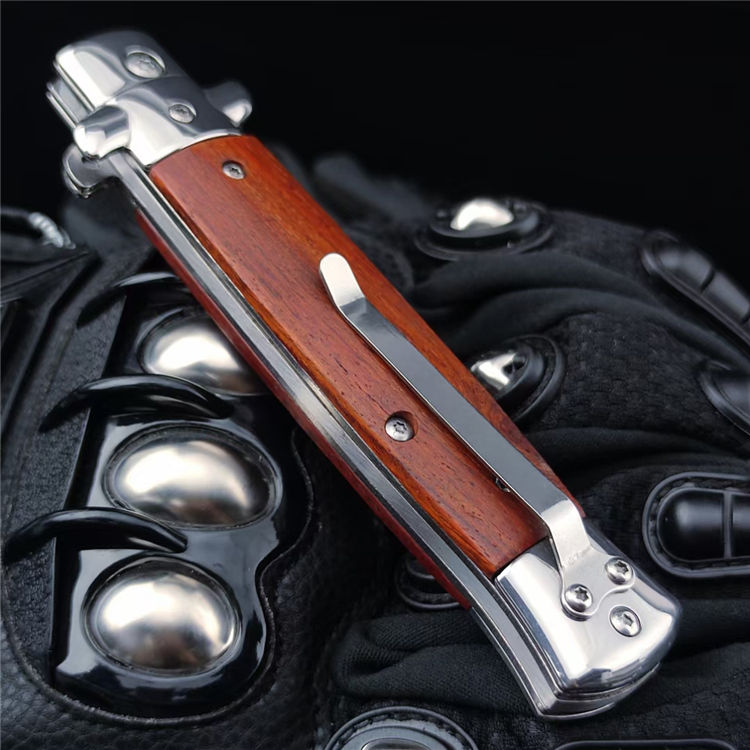 FA69侧开跳刀 总长:22.5CM 刃长:9.8CM 刃宽:1.5CM 刃厚:3MM 刃材:440C 柄材:彩木 柄长:12.7CM 柄宽:23MM 柄厚:18MM 重量:165G