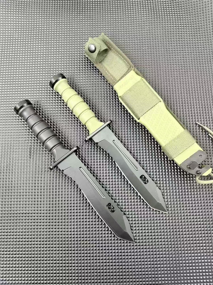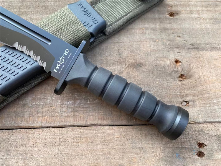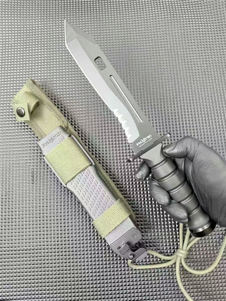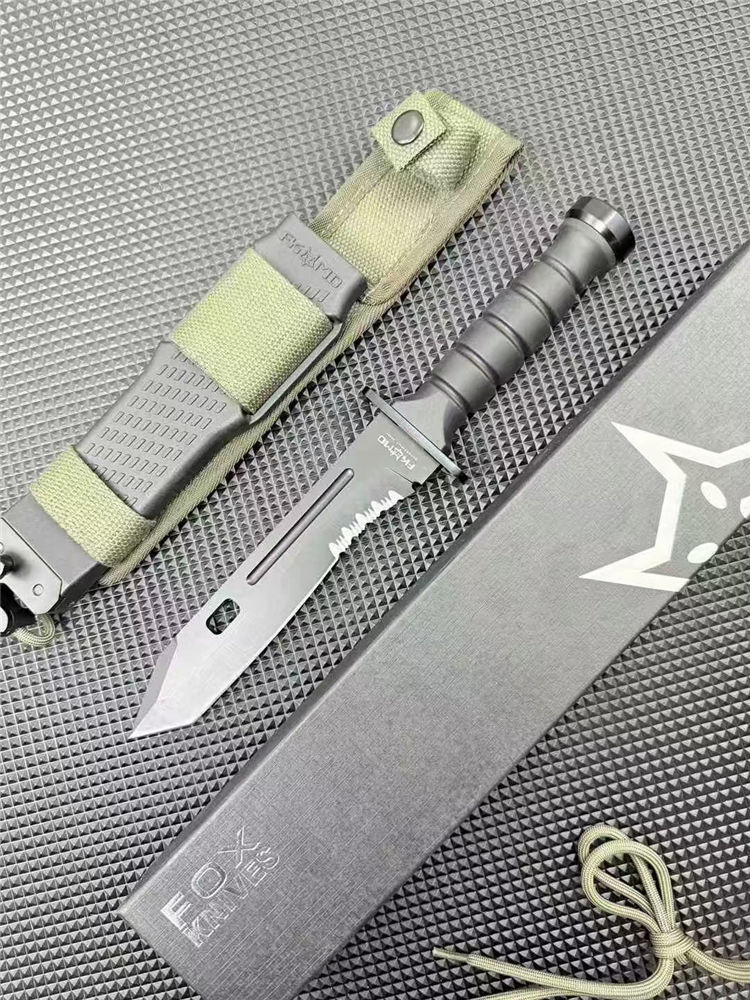 狐狸FOX军刺 全长:30.4CM 刃长:18.5CM 刃厚:5MM 柄长:11.8CM 刃材:440C 柄材:尼龙玻纤 重量:約780克含包装 附件:战术刀鞘