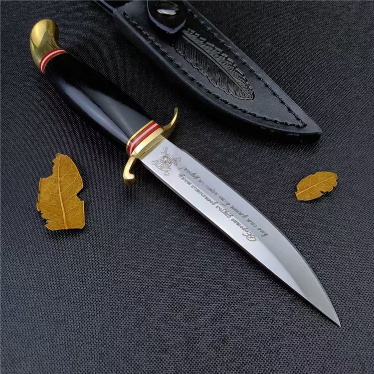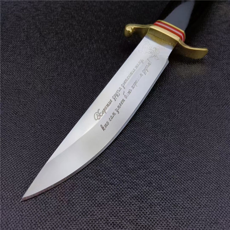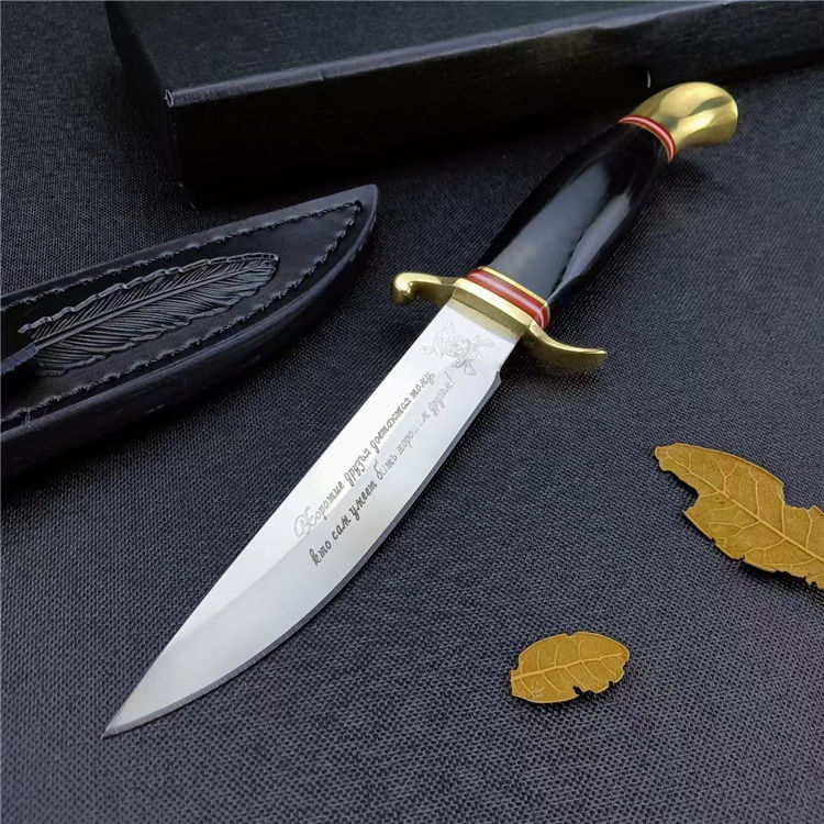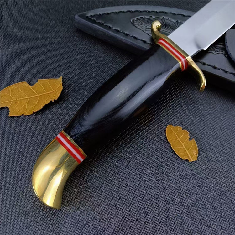 新版俄罗斯契卡直刀 总长:23CM 刃长:12CM 刃宽:2.2CM 刃厚:3MM 刃材:440C 柄材:黄铜+黑檀木 柄长:11CM 柄宽:25MM 柄厚:21MM 重量:155G