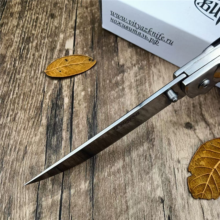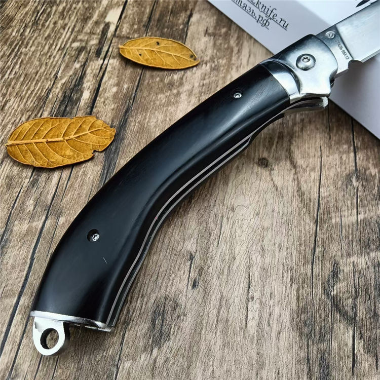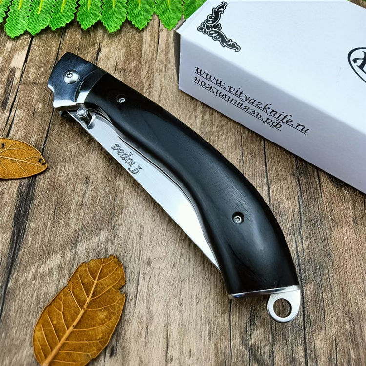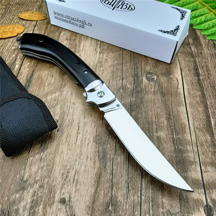 俄罗斯维特亚兹折刀 总长:24.4CM 刃长:10.1CM 刃宽:2CM 刃厚:2.5MM 柄材:黑檀木 柄长:14.3CM 柄宽:18MM 柄厚:20MM 重量:180G