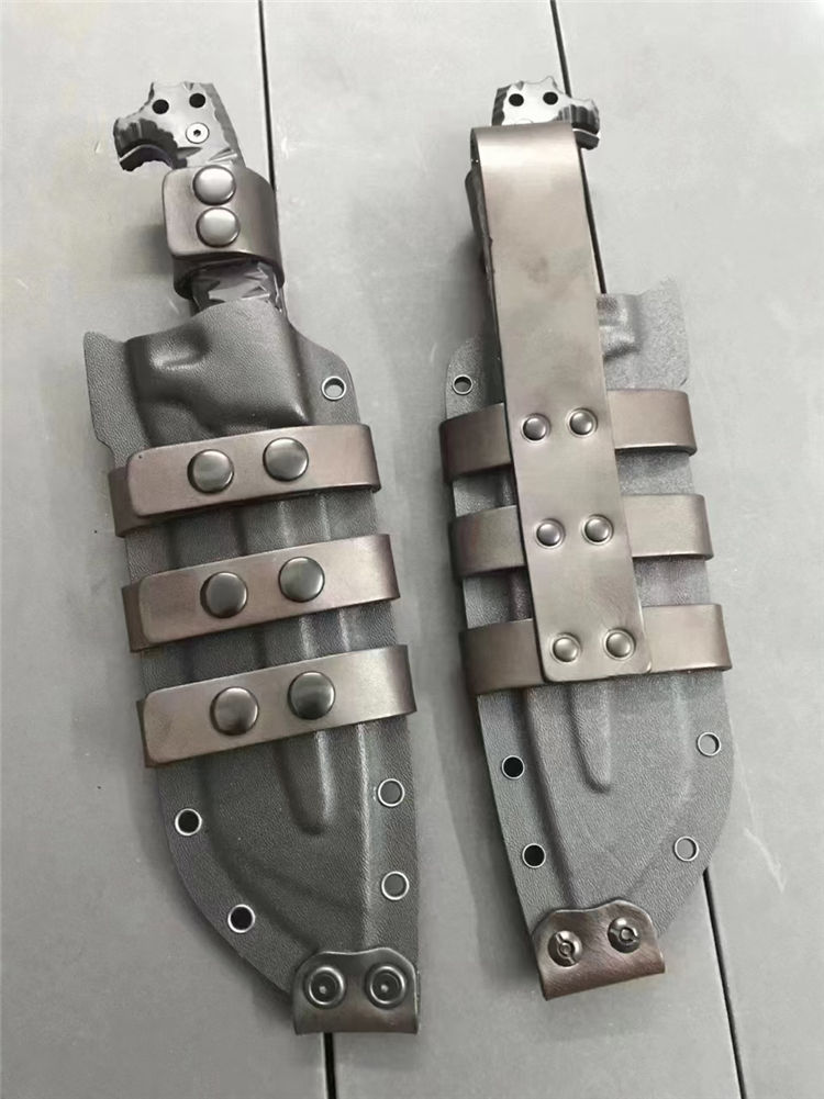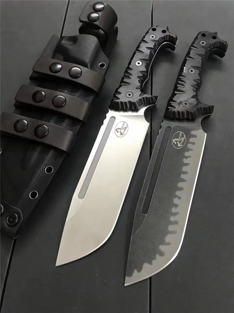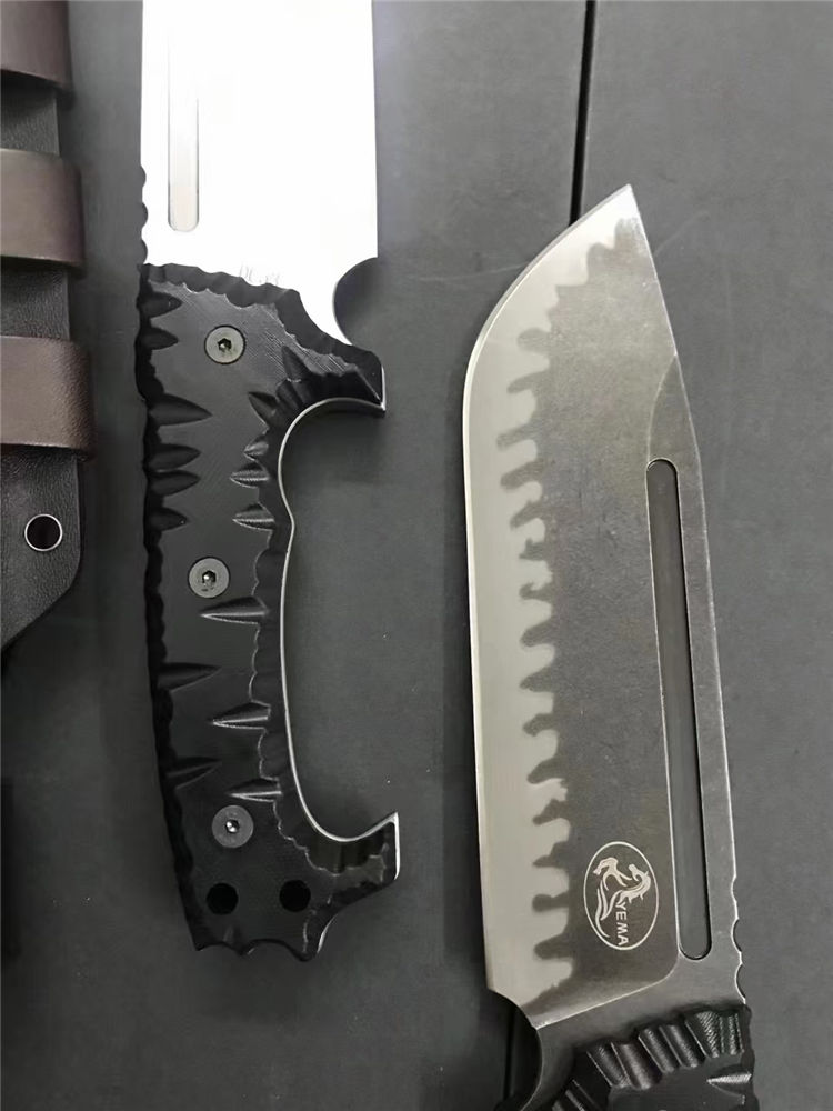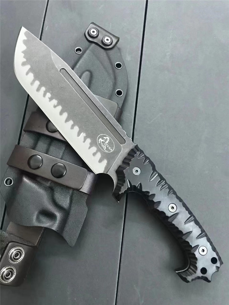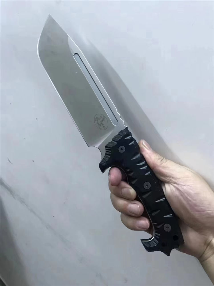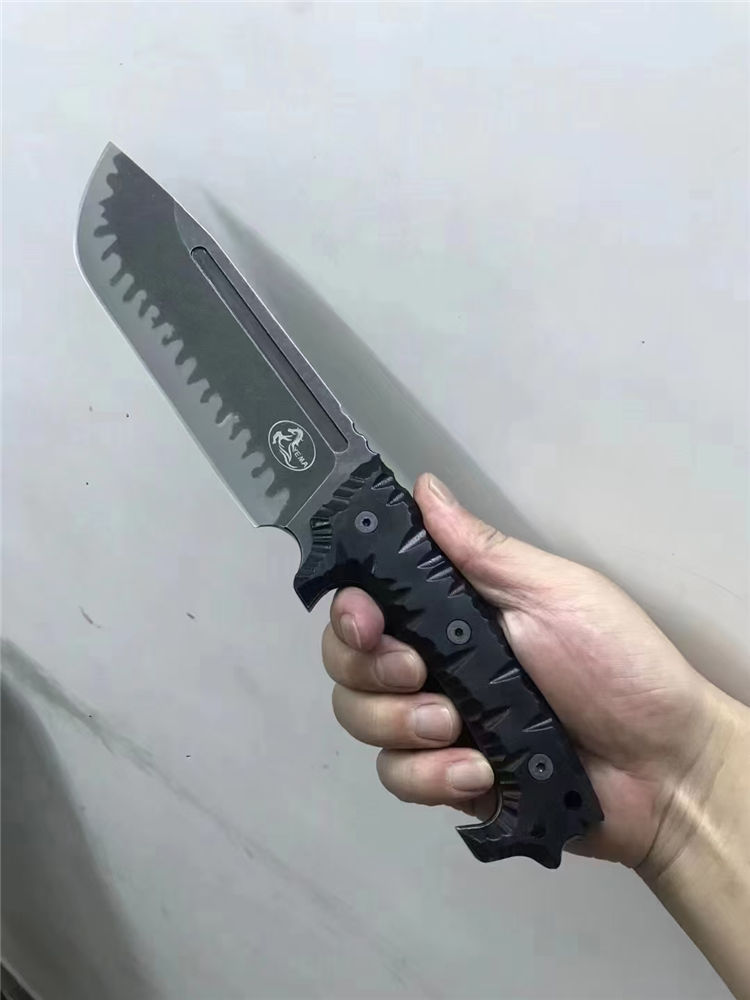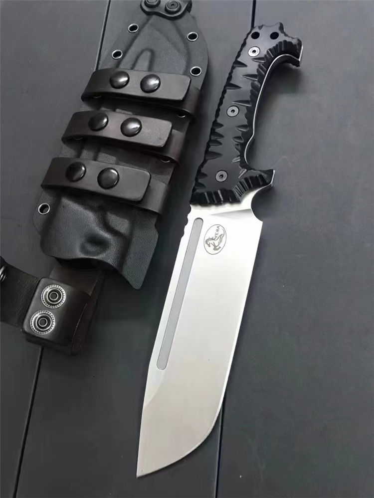 野马黑虎直刀 全长:320mm 刃长:180mm 刃宽:54mm 柄长:135mm 刃材:DC53 硬度:60-61HRC 刃厚:6.5mm 表面:钢本砂光、虎纹 柄材:黑色G10 刀鞘:K鞘