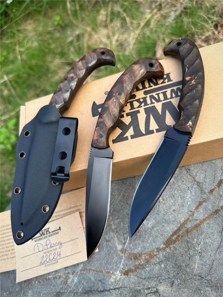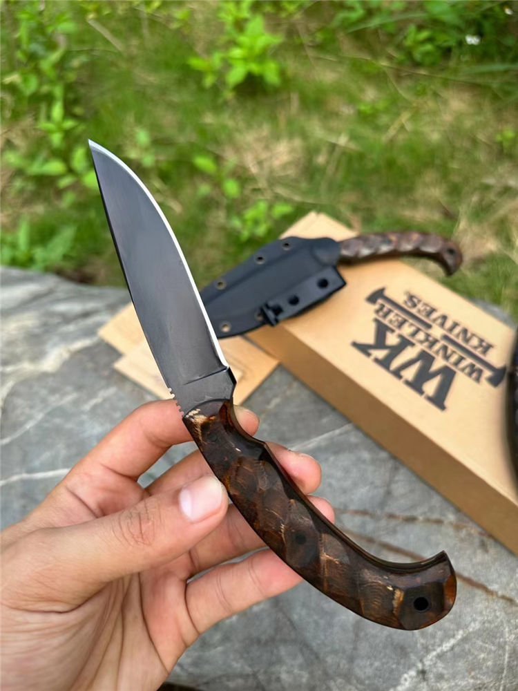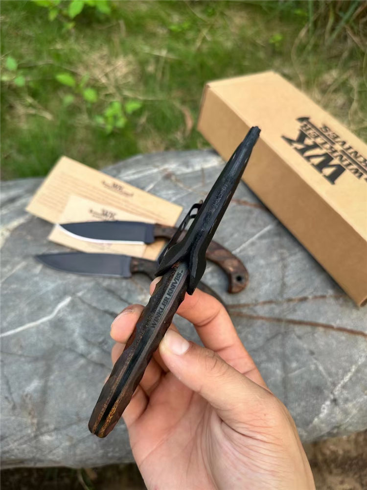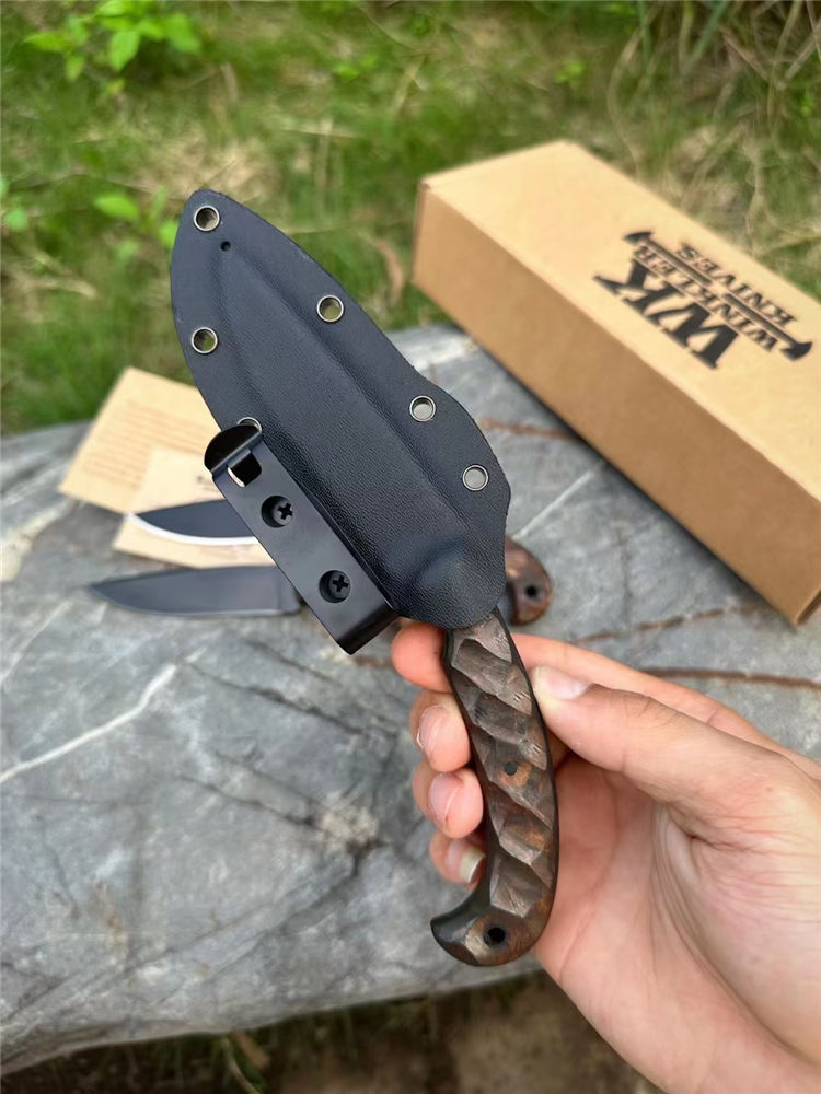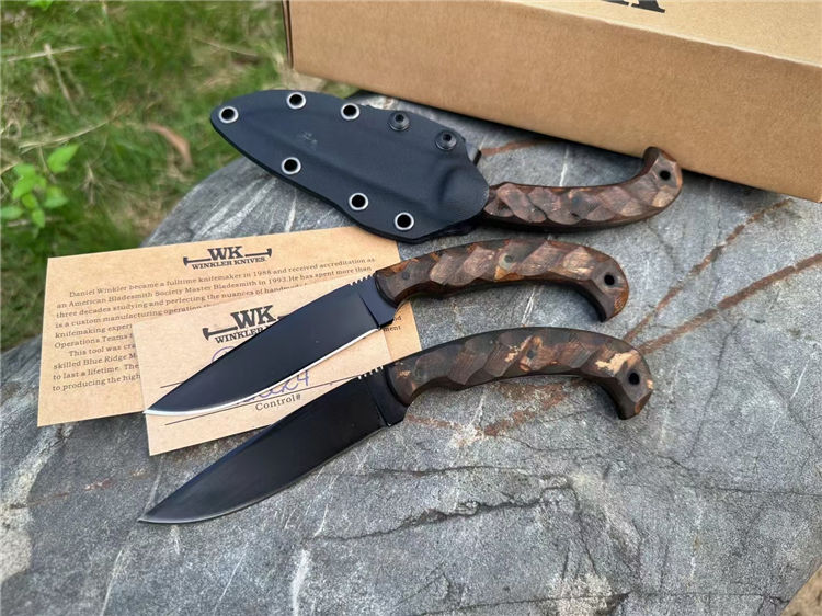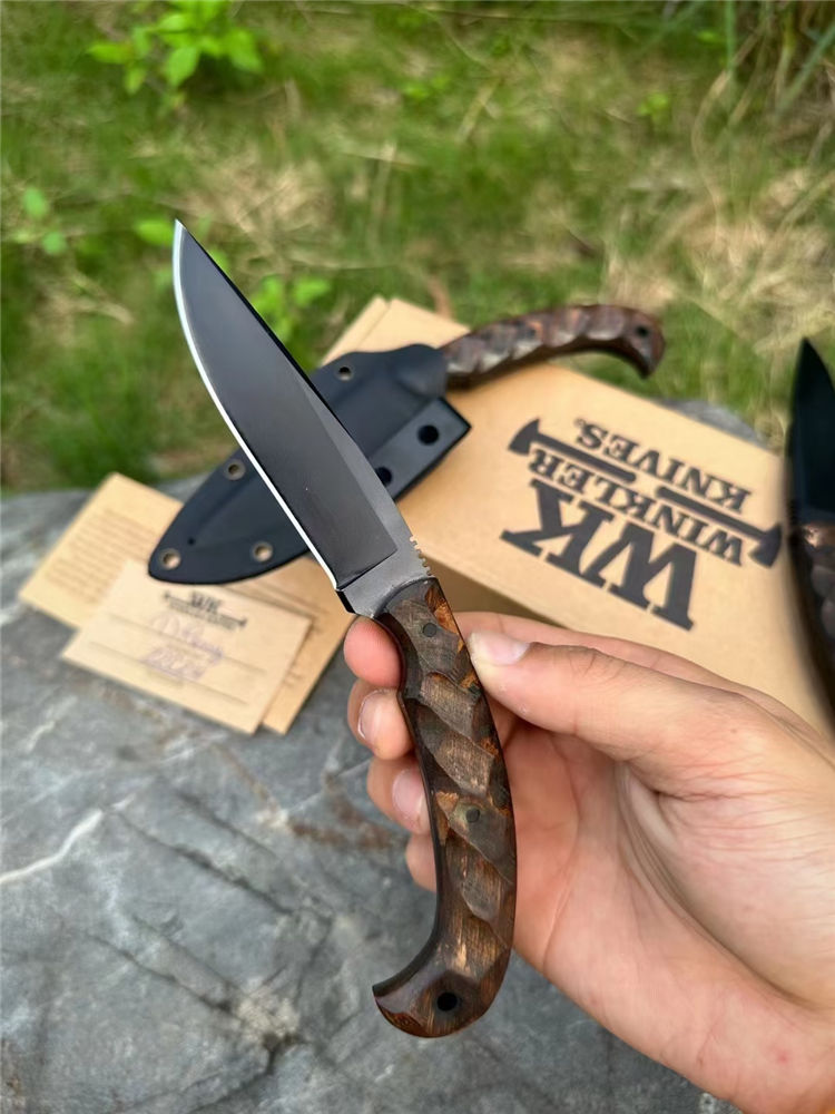 温克勒美军海豹应急者直刀 总长:19cm 刀刃:9.5cm 手柄:9.5cm 刃厚:4.5MM 钢材:80crv2全龙骨一体,专业真空热处理 硬度:60HRC 柄材:印第安枫木·雕刻,战术三明治静音刀鞘