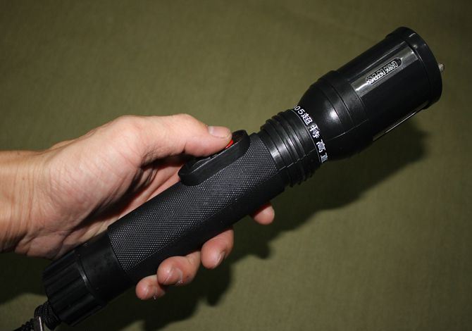 2、强光照明时,手握警棍,推动侧面标有照明指示的开关即可。