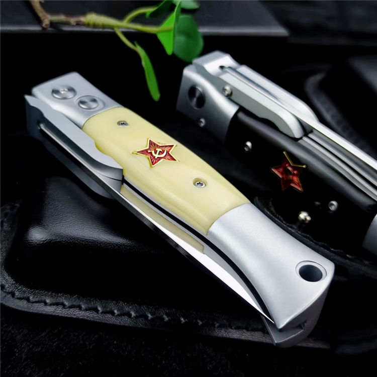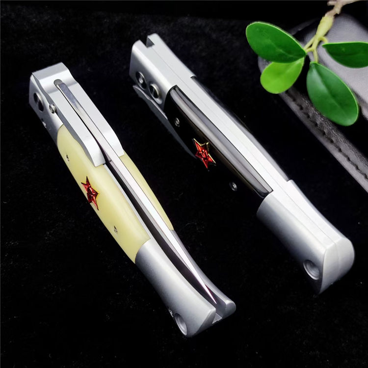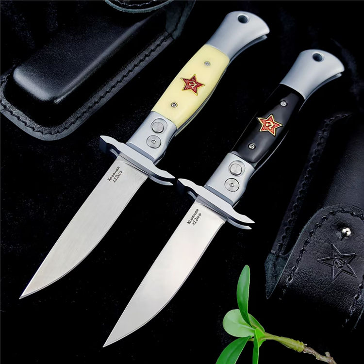 新款爱国者侧开跳刀 总长:22CM 刃长:9.5CM 刃宽:2CM 刃厚:3MM 刃材:X12M 柄材:航空铝镶嵌树脂 柄长:11.5CM 柄宽:23MM 柄厚:20MM 重量:94G 刀鞘:牛皮鞘