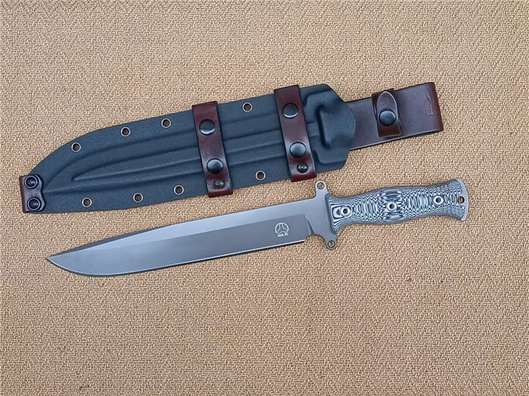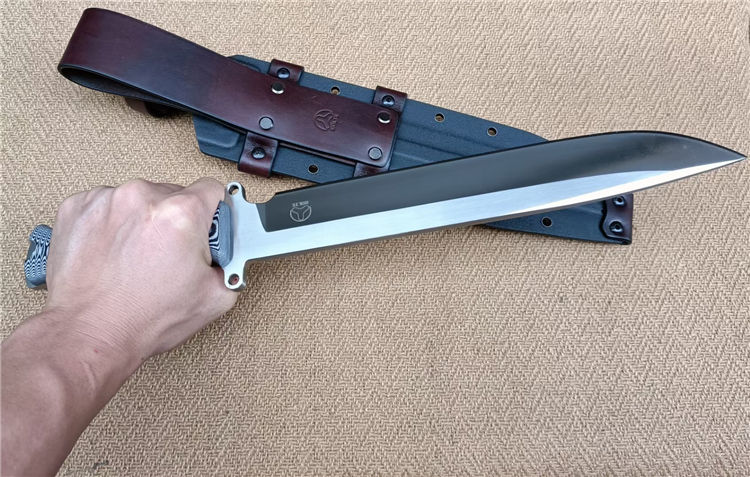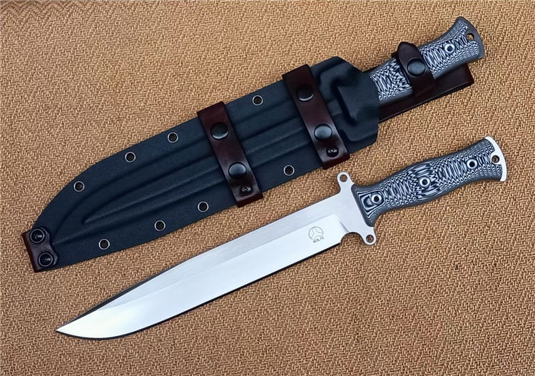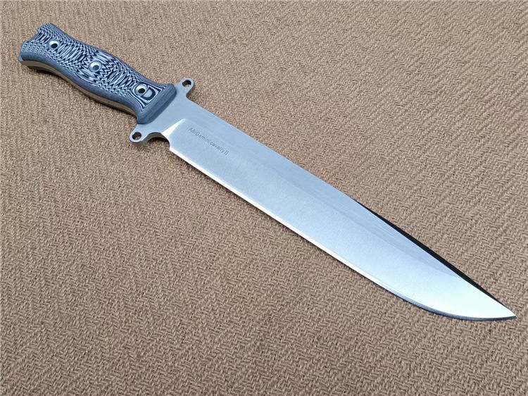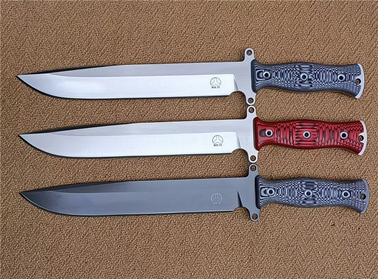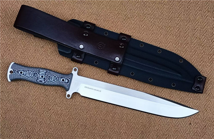 博尔特双子骑兵加长直刀 全长:397mm 刃长:241mm 柄长:129mm 刃宽:40mm 刃厚:5.9-6.0mm 刃面:精细幼砂光钢本色和灰版本 类型:以锋利度,耐磨韧性保持度最出色开 刃方式:二次开刃 刃材:A8钢 热处理:真空淬油热处理和2次回火处理 使钢材韧性保持性更佳 硬度:60+-0.5HRC 柄材:黑白、红黑G10+铝管,一体全柄、握 感更舒服、性能更强悍 包装:精美黑纸盒+护刀油+伞绳 净重:600克 刀鞘:配K鞘+皮条扣带