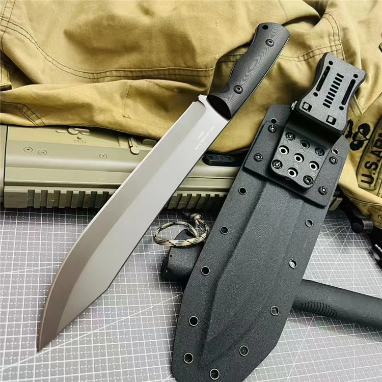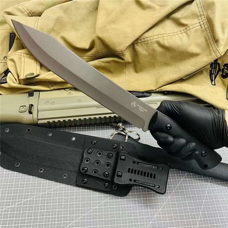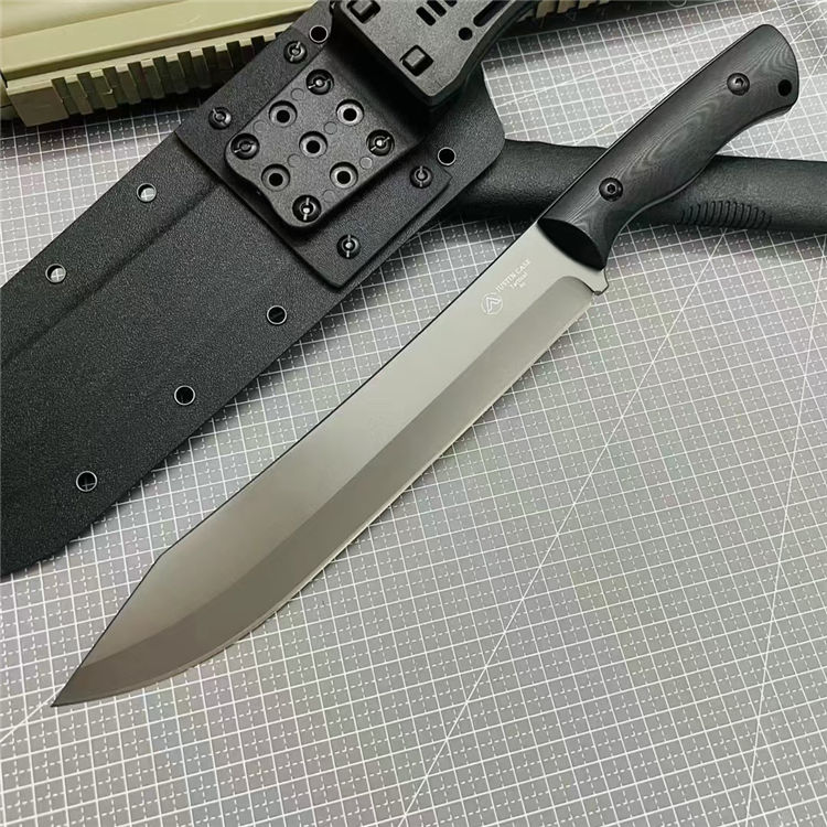 阿尔法轻型排障刀 全长:38cm 刃长:24.5cm 柄长:12.6cm 刃最宽:4cm 刃厚:4.8mm 刃面:纳米镀钛灰 类型:以硬度高、锋利度、重砍度、韧性保持度最出色 开刃方式:二次开刃 刃材:420HC钢 热处理:真空淬油热处理和2次回火处理,使钢材韧性保持性更佳 硬度:60HRC 柄材:黑色G10+对锁螺丝钉,一体全柄、握感更舒服、性能更强悍。包装精美黑纸盒 重:479克 刀鞘:配置进口K板鞘+万能夹和带扣