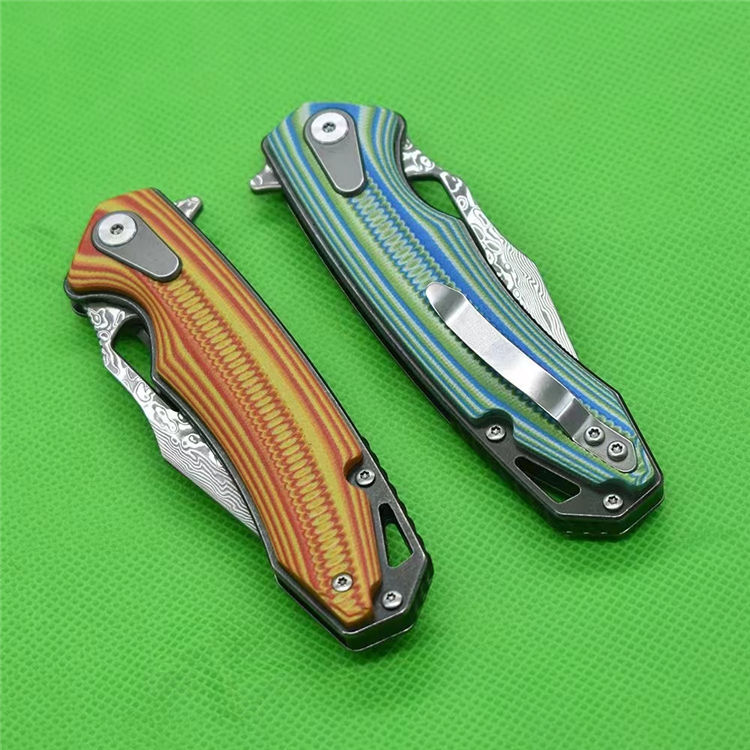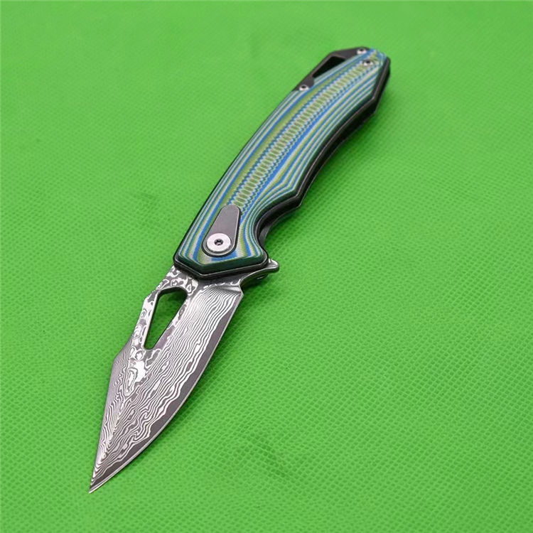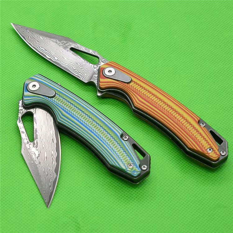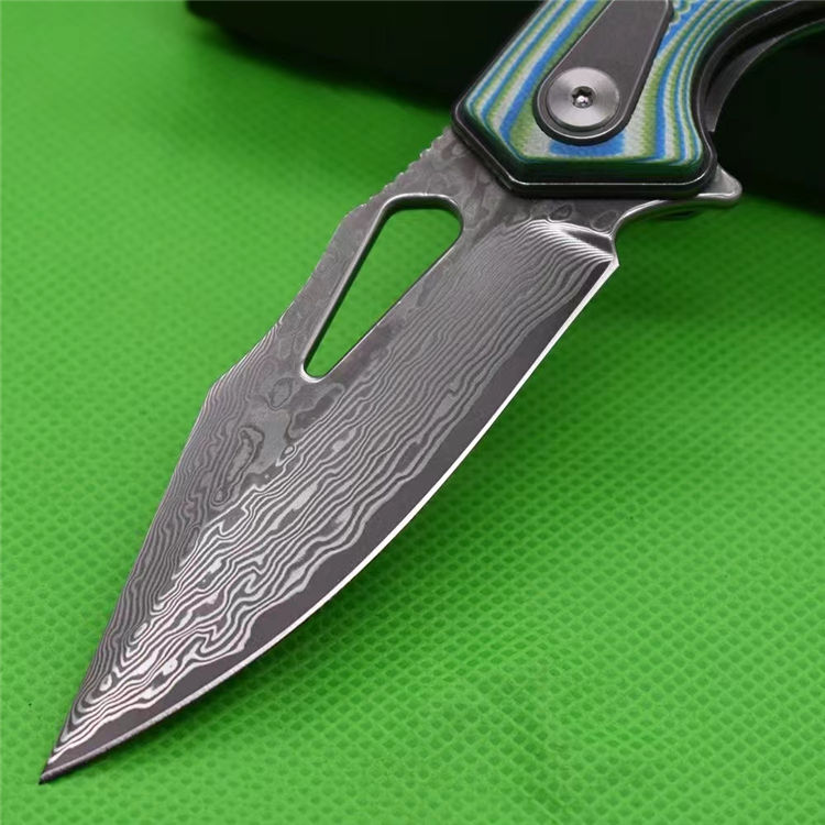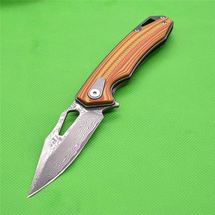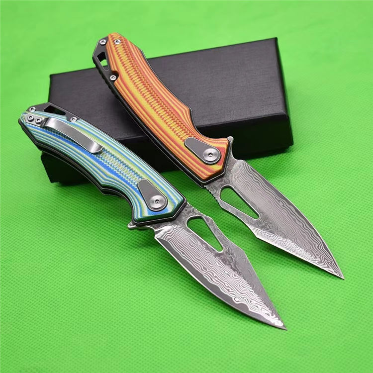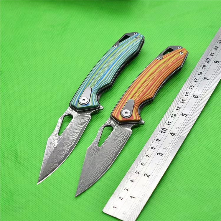 大马士革鱼骨纹折刀 全长:19.8cm 刃厚:2.83mm 刃长:8.5cm 柄长:11.4cm 刃材:VG10大马士革 柄材:双色G10精雕CNC 硬度HR:60-61 刀重:123g加盒:178g