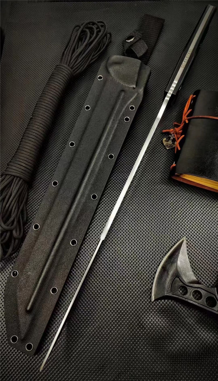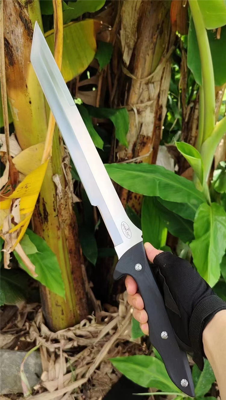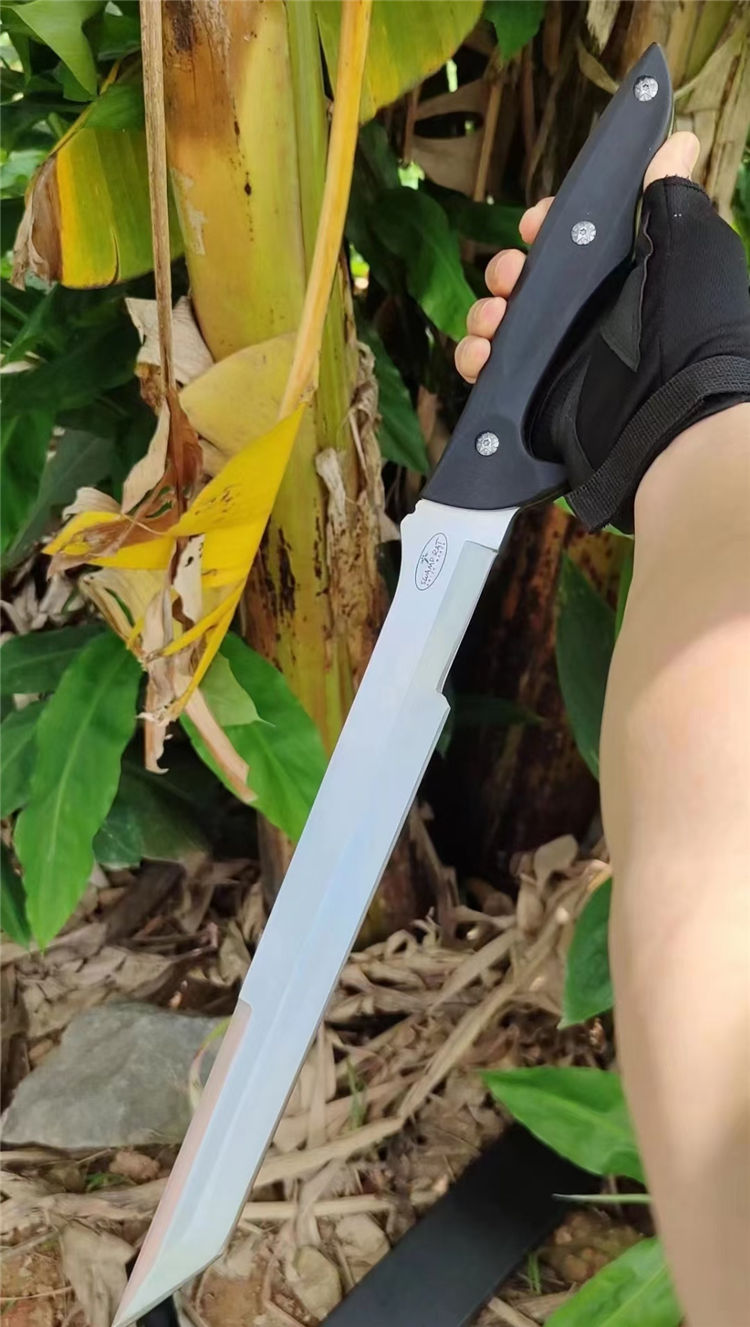 沼泽鼠御龙开山砍刀 全长:575mm 刃长:380mm 柄长:200mm 刃宽:33mm 刃厚:5.4mm 刃材:DC53钢 刀重:815g 净重:1010g含刀鞘 毛量:1330g(含K鞘包装盒) 硬度:60+HRC 表面:数控精磨+砂光拉丝面 柄材:高密度G10手柄 结构:一体龙骨成型 配套:配ABS玻纤加硬-K鞘 包装:黑色礼盒