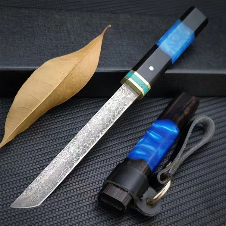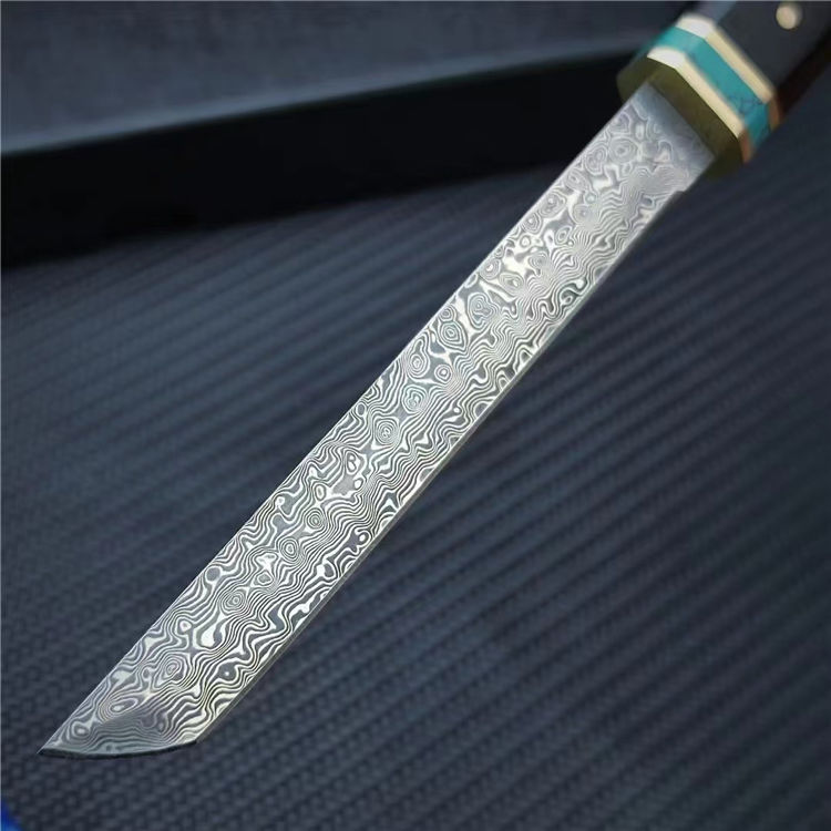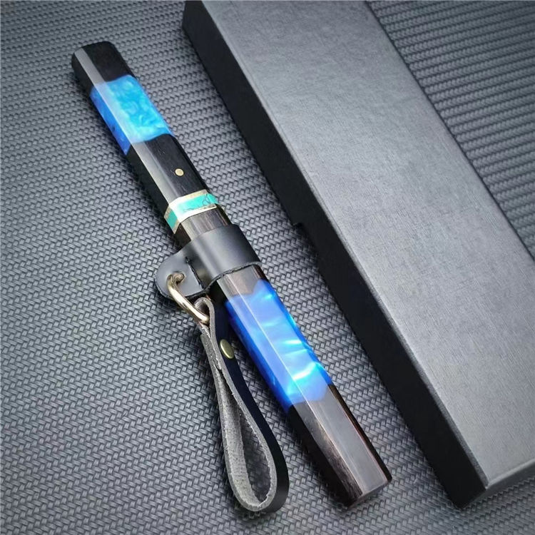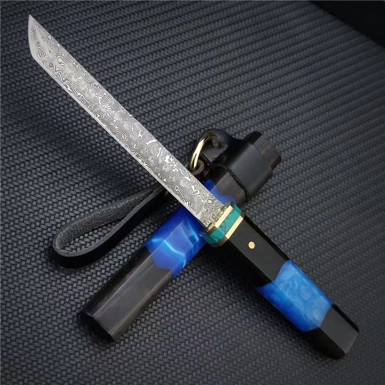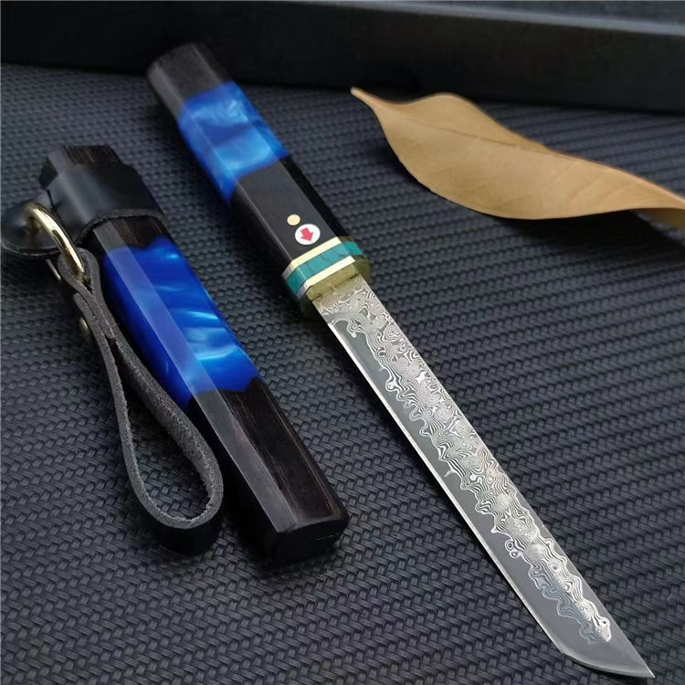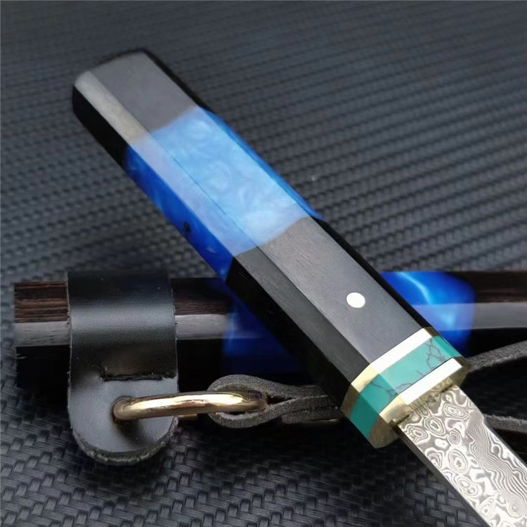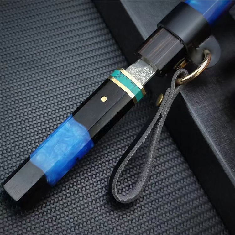迷你魅蓝唐刀 总长:20.8CM(含刀鞘) 刃长:11.5CM 刃宽:1.3CM 刃厚:2MM 刃材:大马士革钢 柄材:黑檀木+亚克力+绿松石+黄铜 柄长:8.8CM 柄宽:2CM 柄厚:1.4CM 重量:52G