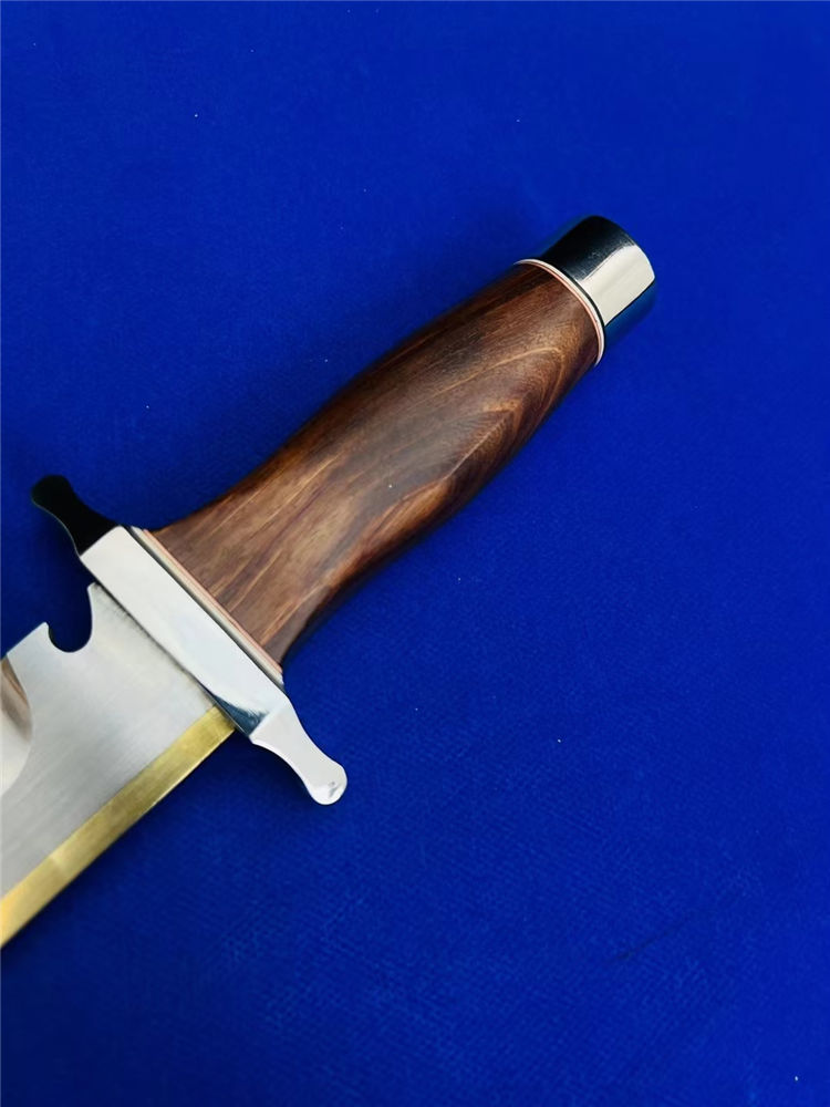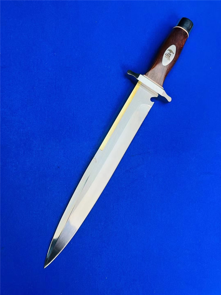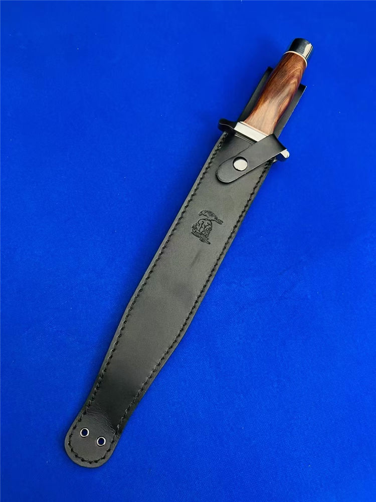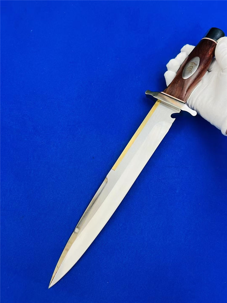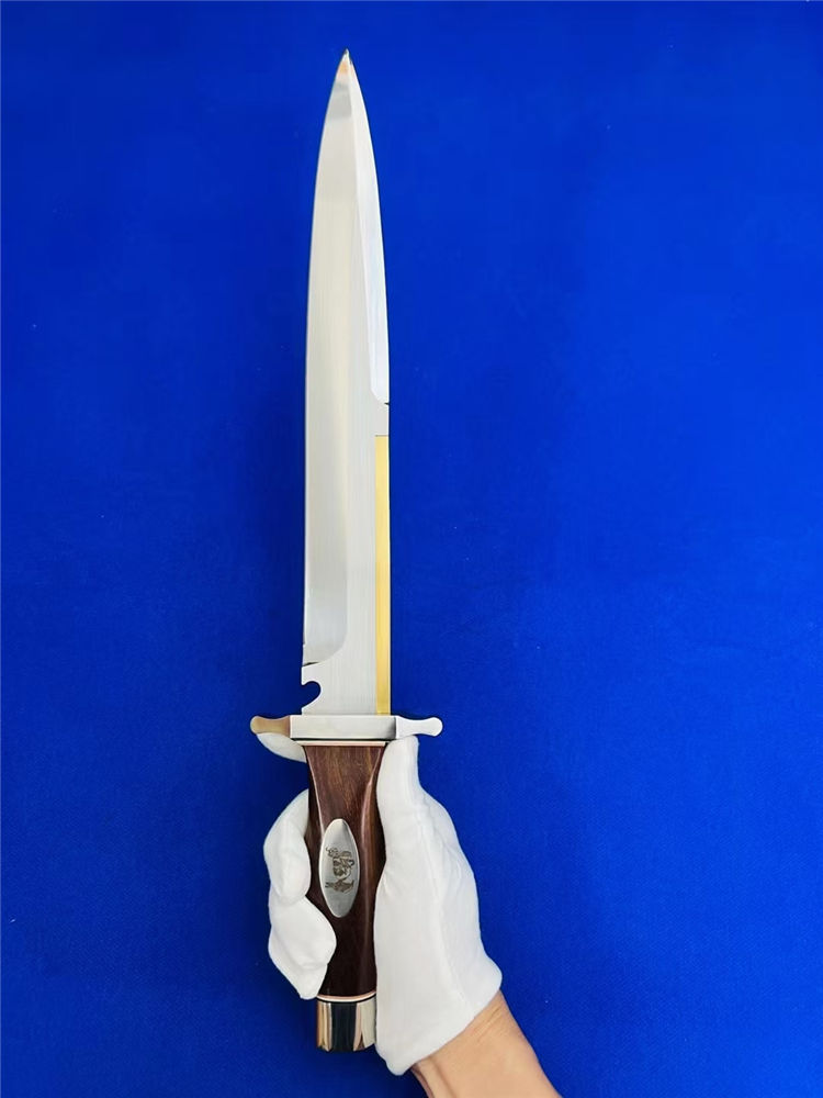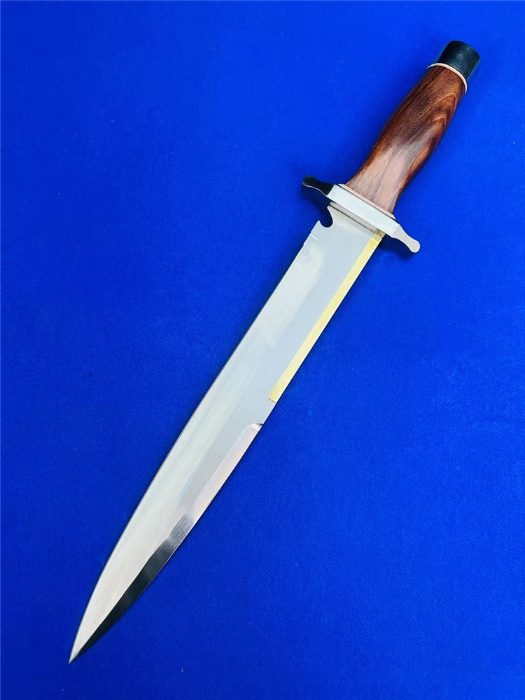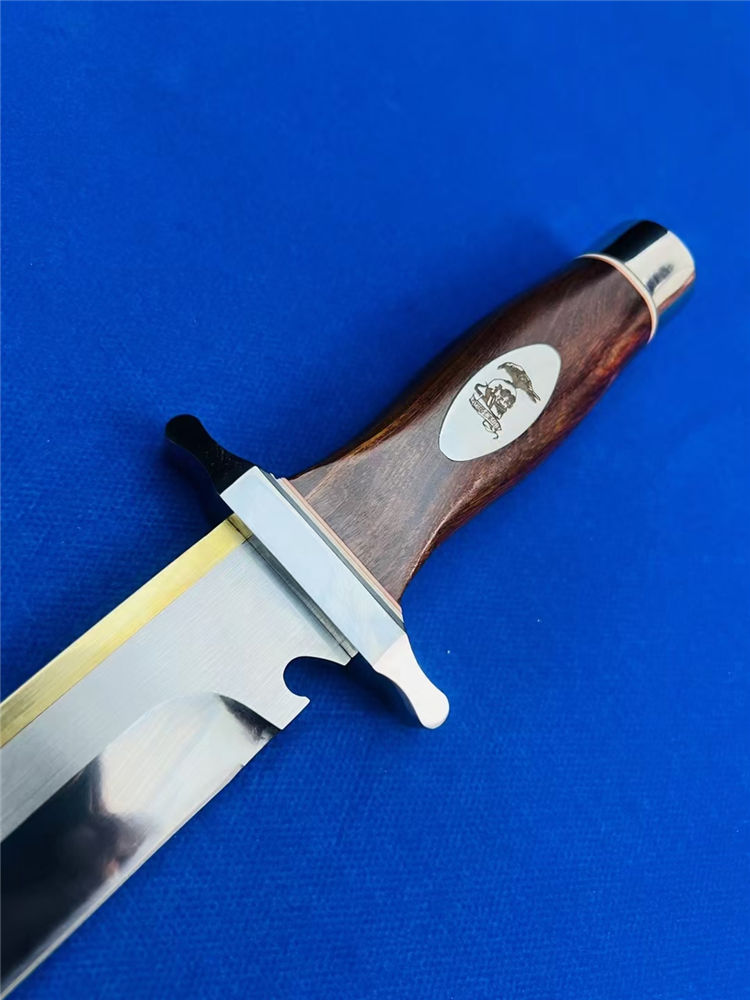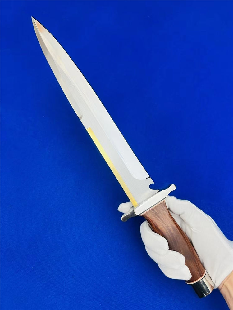 新版史太龙-大牙签 全长:430MM 刃长:29.8MM 刃厚:5.0MM 护手宽:85MM 护手厚度:10MM 柄长:132MM 刃材:9Cr18MoV 硬度:59度(真空深冷热处理) 柄材:进口缅甸红酸枝 两个钢头304材料(永不生锈)背铜嵌入两头 刀套:黑色头层皮刃面镜面处理,表面极幼拉丝。 护手铜材质,镜光处理,表面涂防氧化物 重量:1109g含包装
