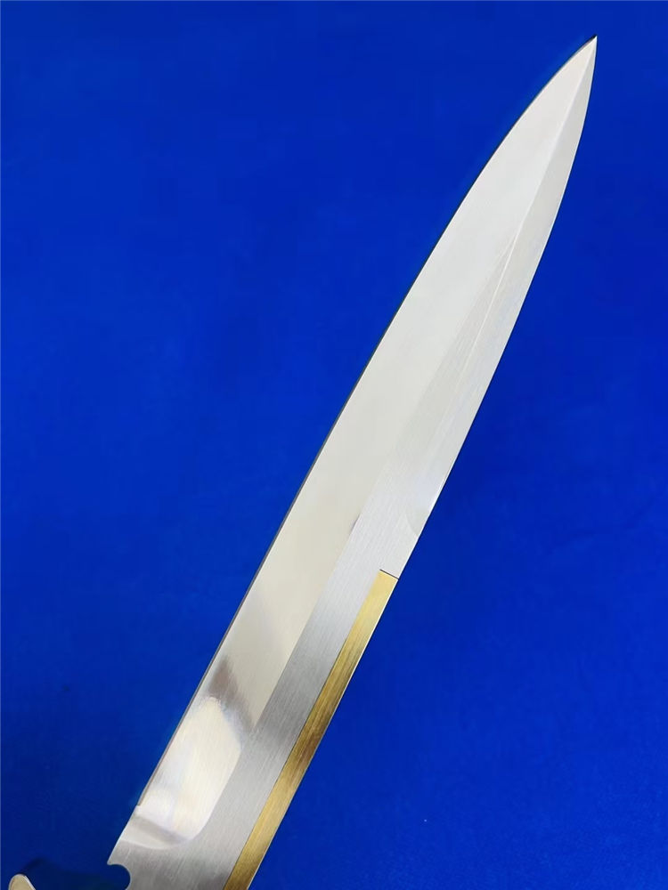 刀套:黑色头层皮刃面镜面处理,表面极幼拉丝。 护手铜材质,镜光处理,表面涂防氧化物