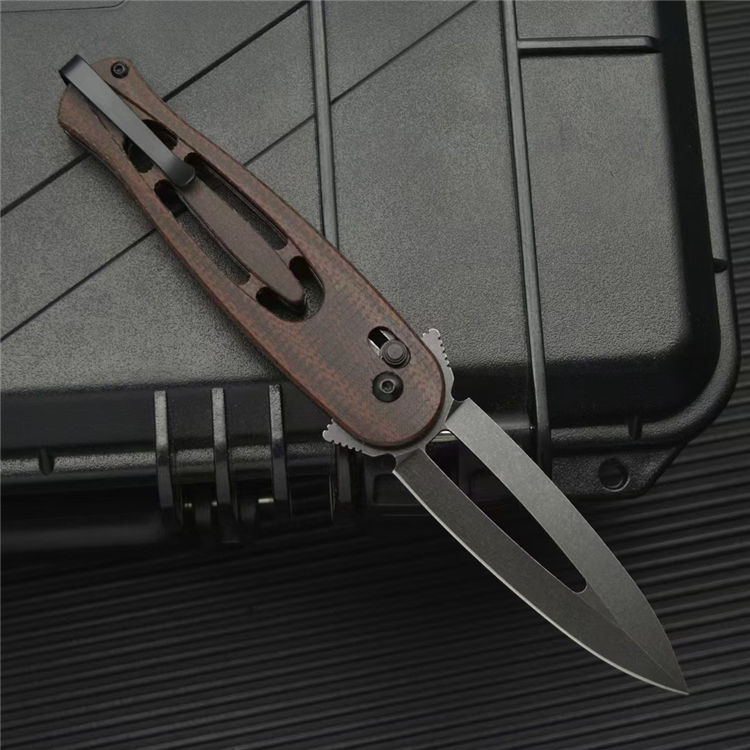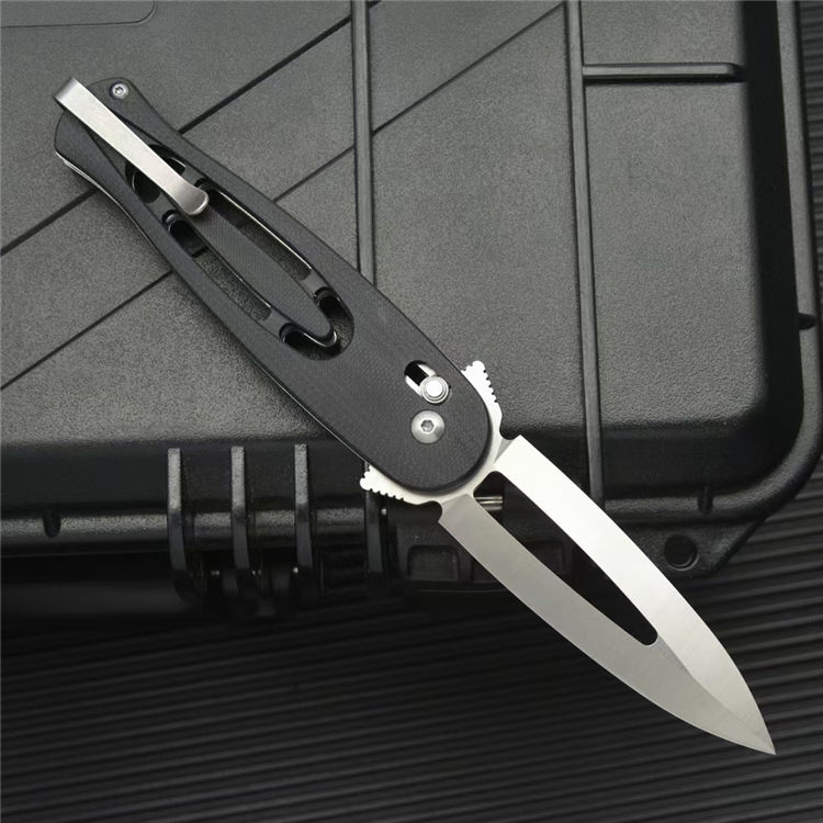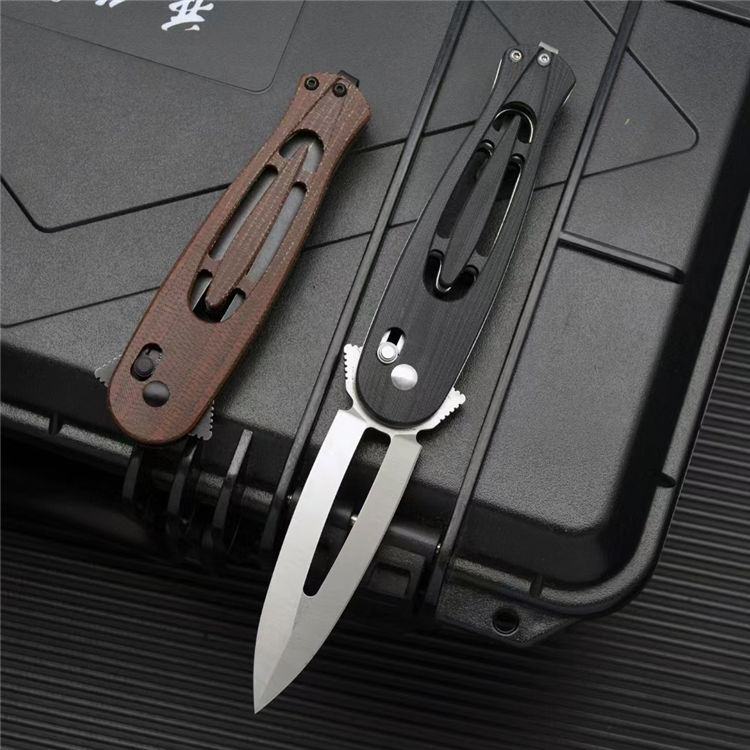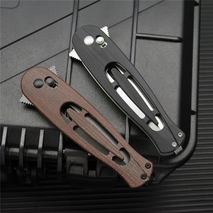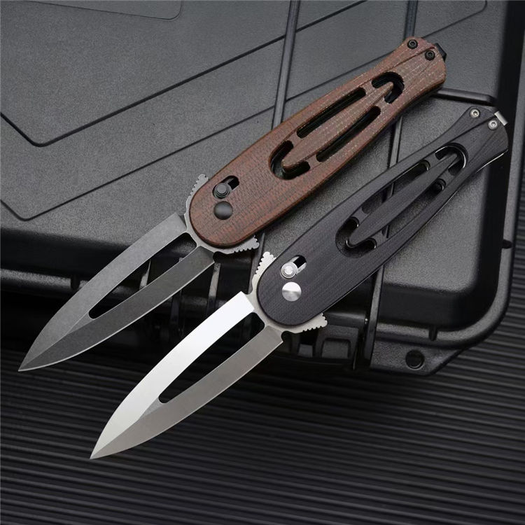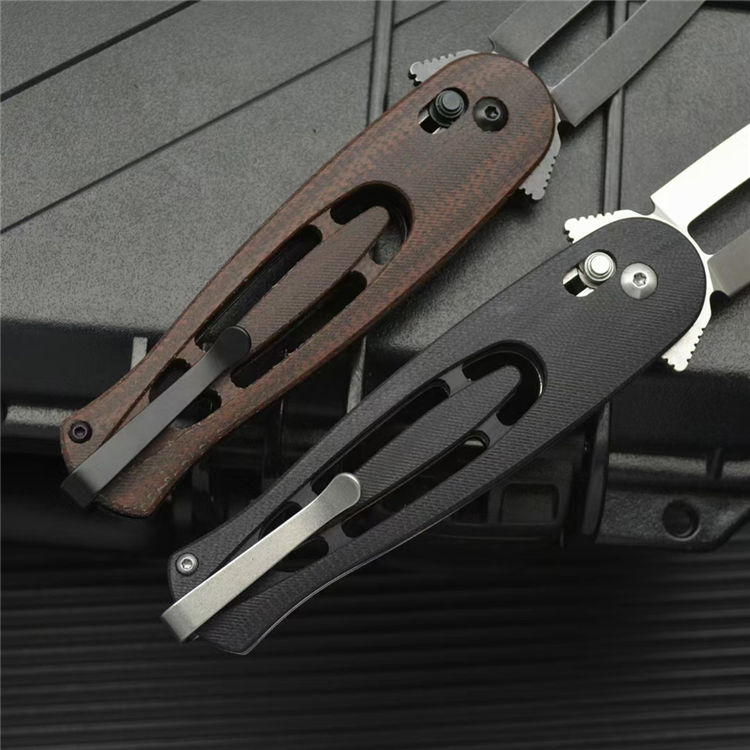 圣杯折刀 全长:19.8cm 刃长:8.0cm 柄长:11.8cm 刃宽:2.4cm 刃厚:2.8mm 刃材:进口D2钢材 刀重:99.8g(裸刀) 重量:150克(含包装盒) 硬度:58-60HRC(真空油淬热处理+回火2次) 刃面:数控水磨 柄材:黑色G10/棕色亚麻 螺丝:所有螺丝420不锈钢,全CNC精雕加工