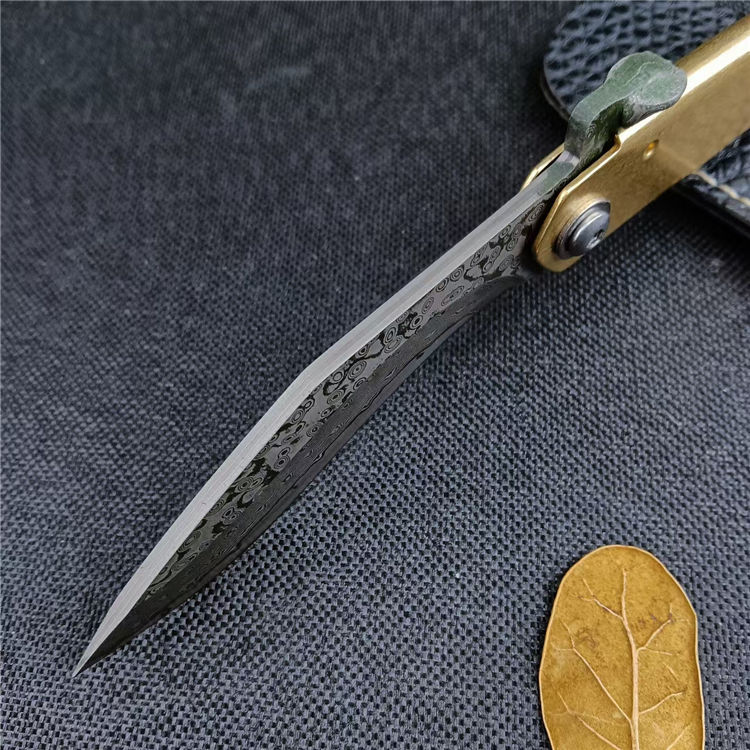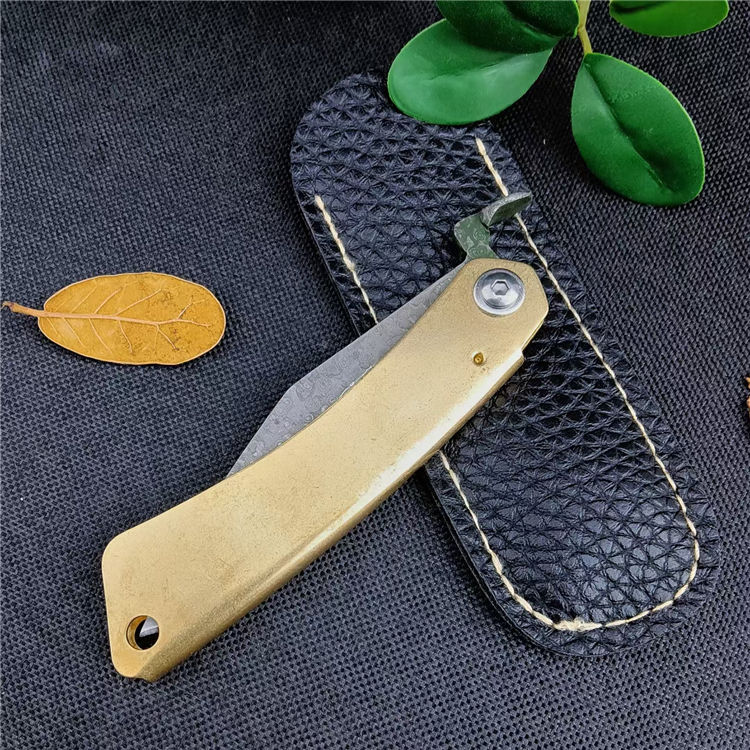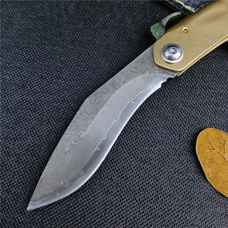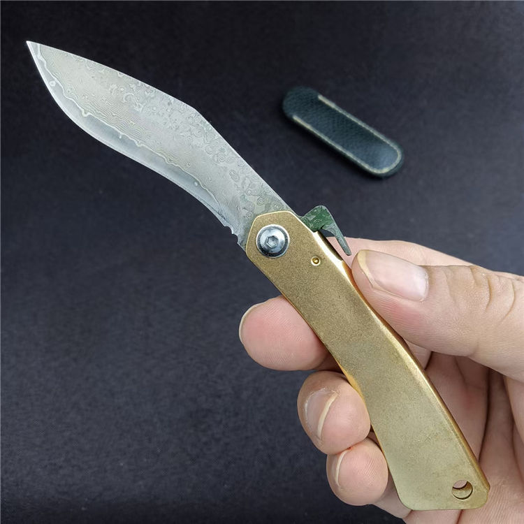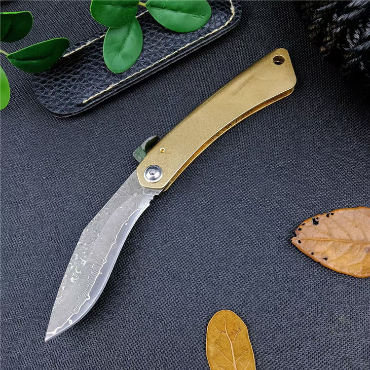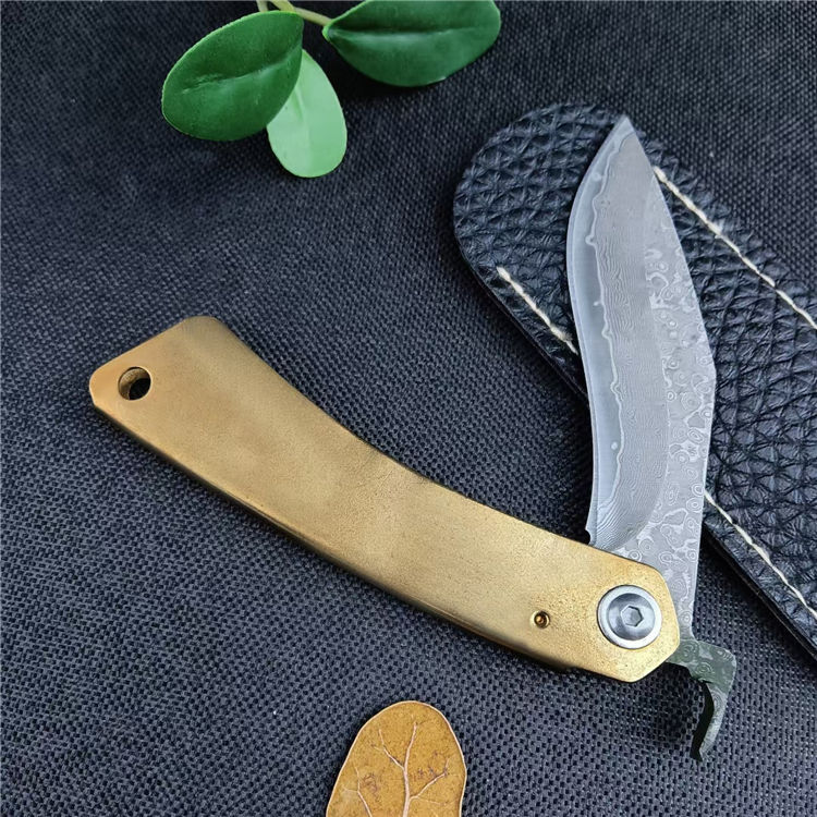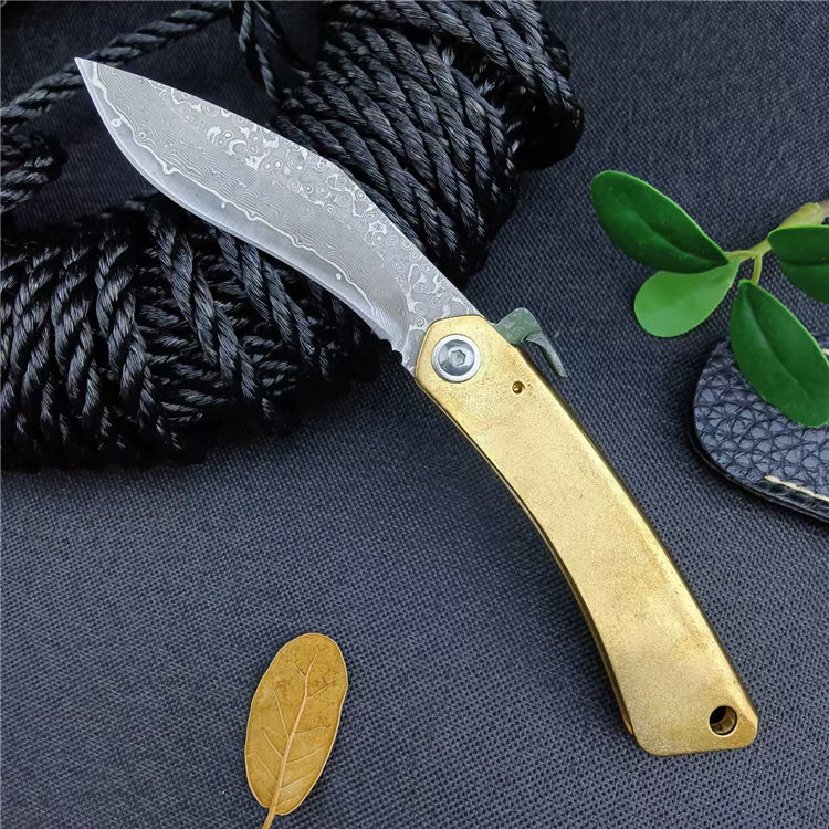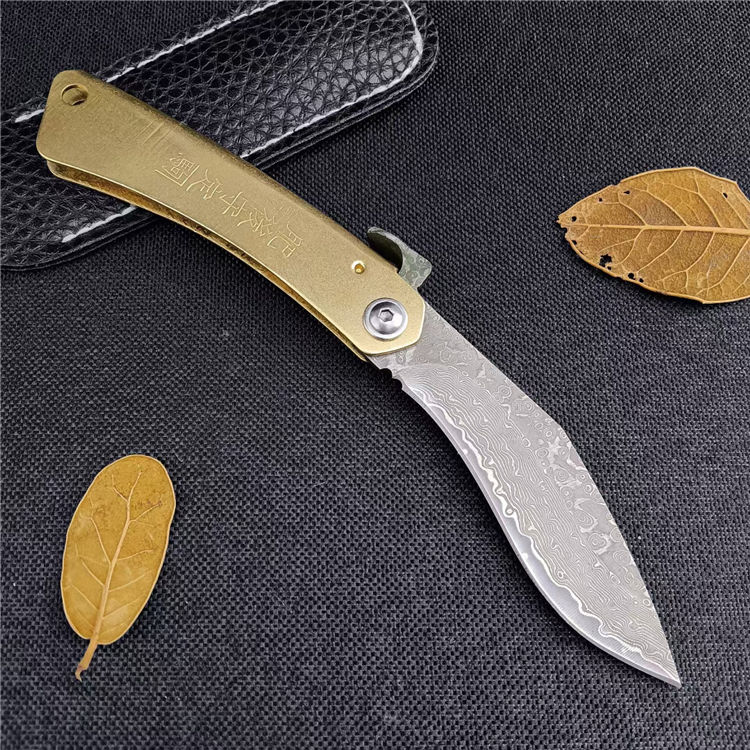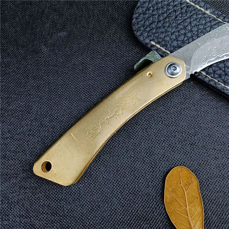大马士革肥后守折刀 总长:16CM 刃长:7CM 刃宽:1.8CM 刃厚:2.5MM 刃材:大马士革钢 柄材:黄铜 柄长:9CM 柄宽:15MM 柄厚:5MM 重量:45G