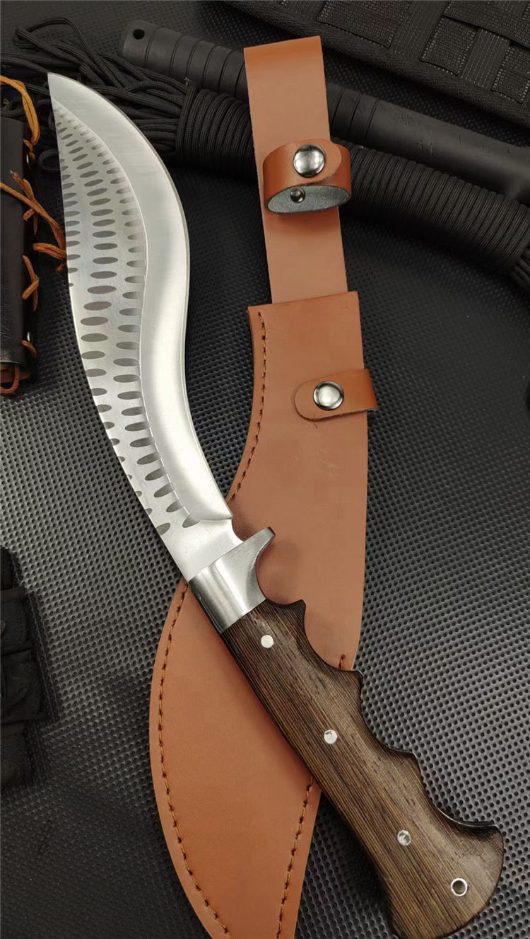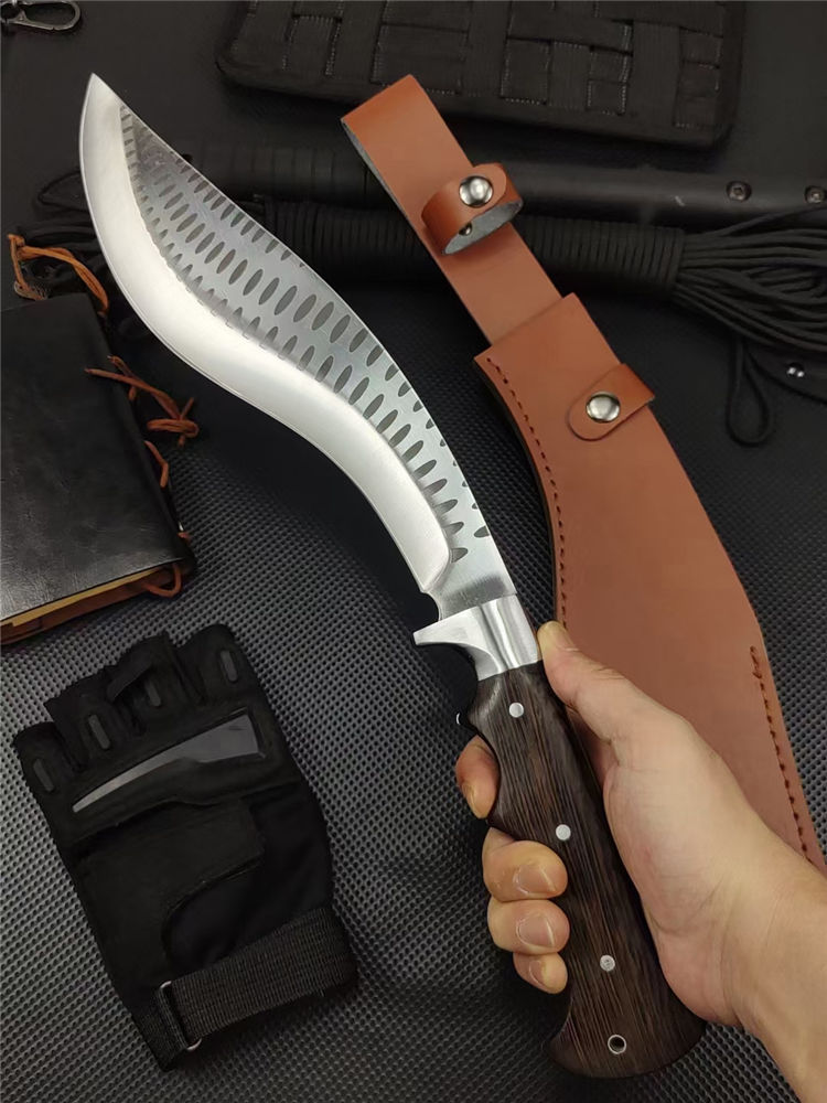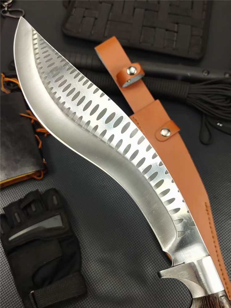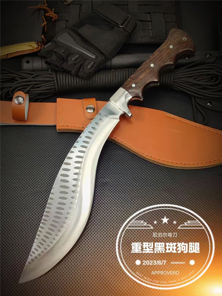 重型黑斑狗腿弯刀 全长:460mm 刃长:290mm 柄长:170m 刃宽:60mm 刃厚:5.5mm 刃材:8Cr17钢高碳钢 刀重:816g 毛重:916g(含套) 硬度:59+HRC 表面:冷轧凹痕发黑+砂光水磨 柄材:黄鸡翅木 结构:一体龙骨成型