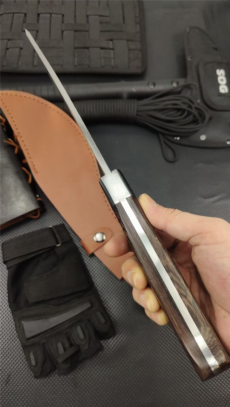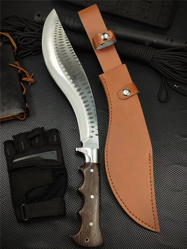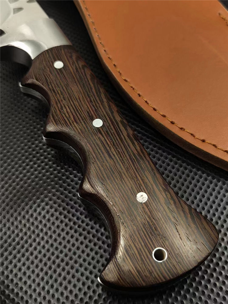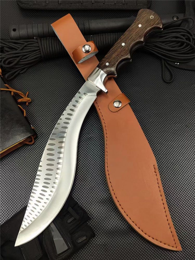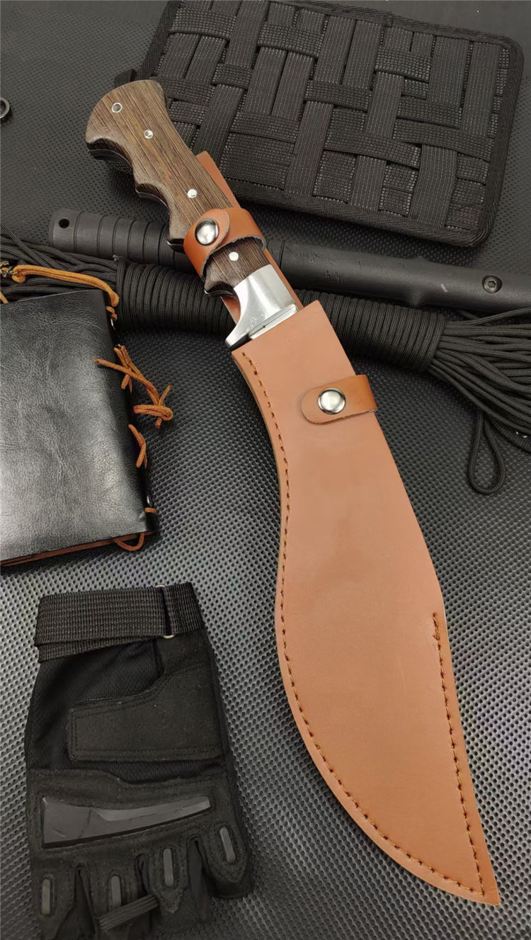 重型黑斑狗腿弯刀 全长:460mm 刃长:290mm 柄长:170m 刃宽:60mm 刃厚:5.5mm 刃材:8Cr17钢高碳钢 刀重:816g 毛重:916g(含套) 硬度:59+HRC 表面:冷轧凹痕发黑+砂光水磨 柄材:黄鸡翅木 结构:一体龙骨成型