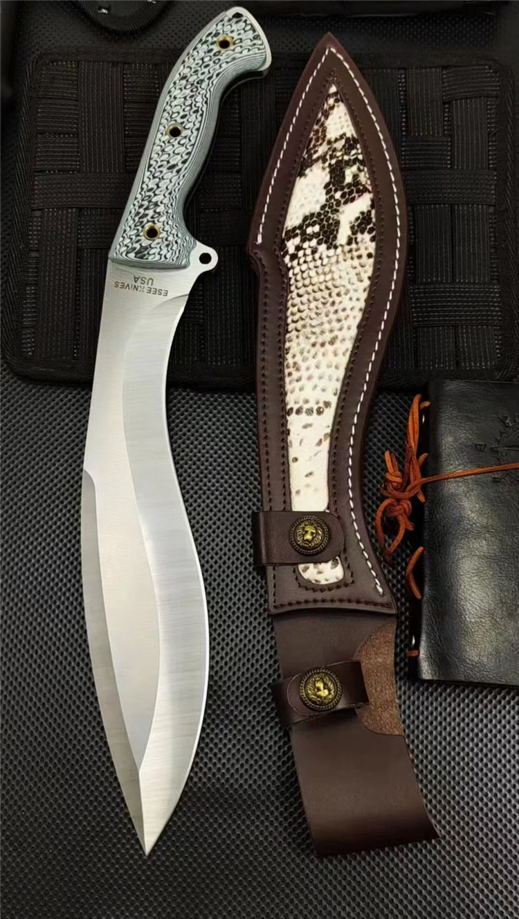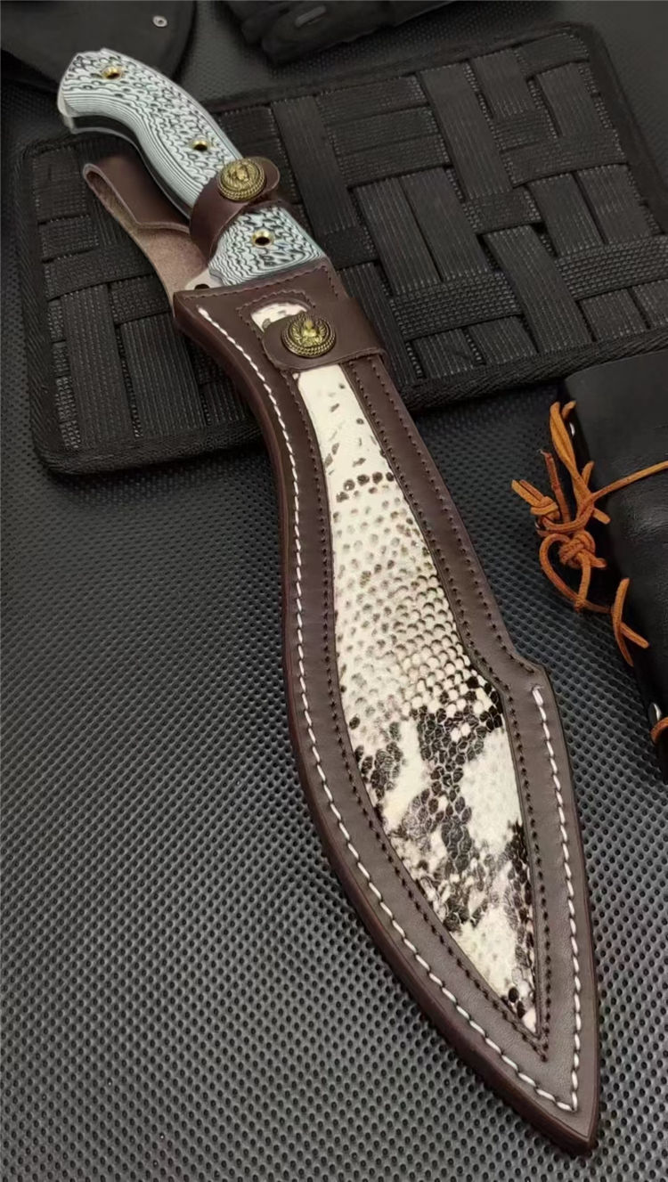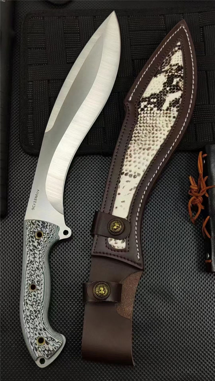 复刻版巴斯狗腿弯刀 全长:440mm 刃长:265mm开刃部分 柄长:160m 刃宽:60mm 刃厚:6.0mm 刃材:9Cr18Mov深冷处理 刀重:808(一斤7两) 毛重:1073g (含鞘含包装) 硬度:60+HRC 表面:手工砂光+CNC水磨 柄材:进口双色G10高密度碾压材料 结构:一体龙骨成型 配套:意大利进口蛇皮植鞣手工加厚牛皮套 包装:黑色礼品盒