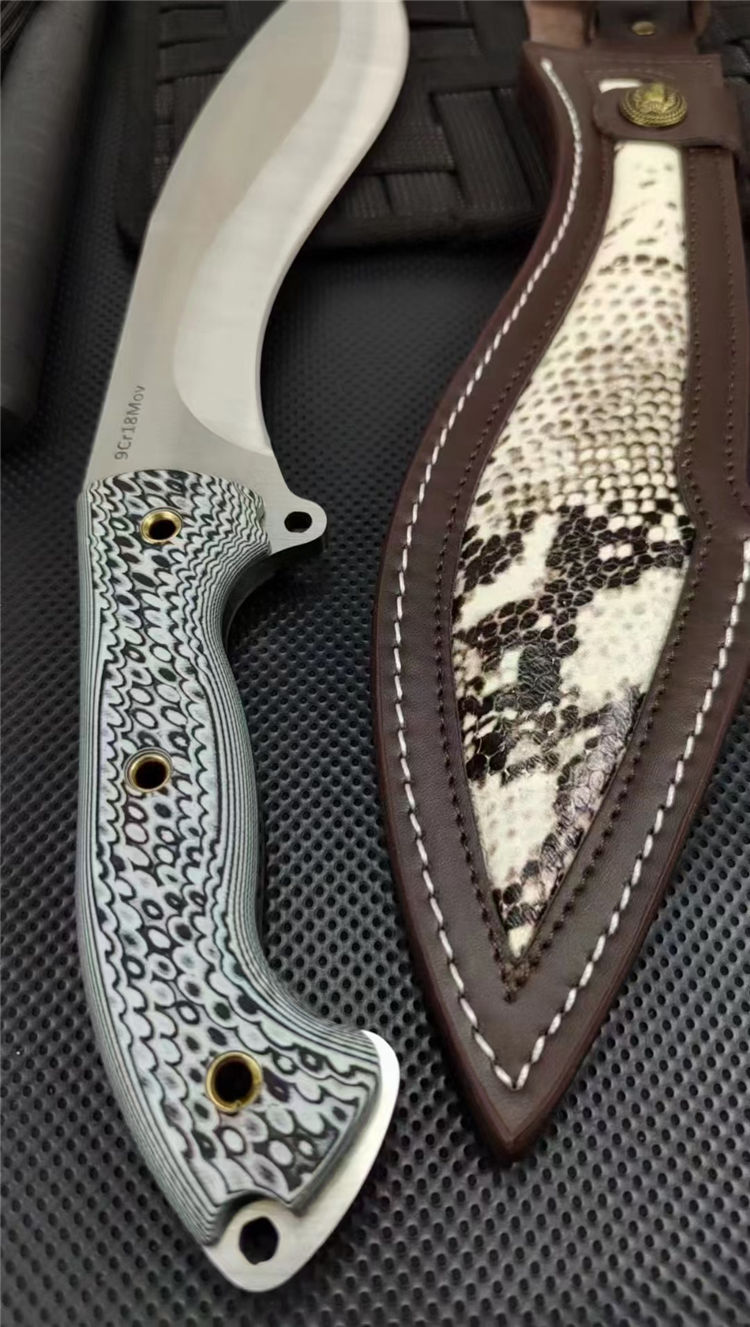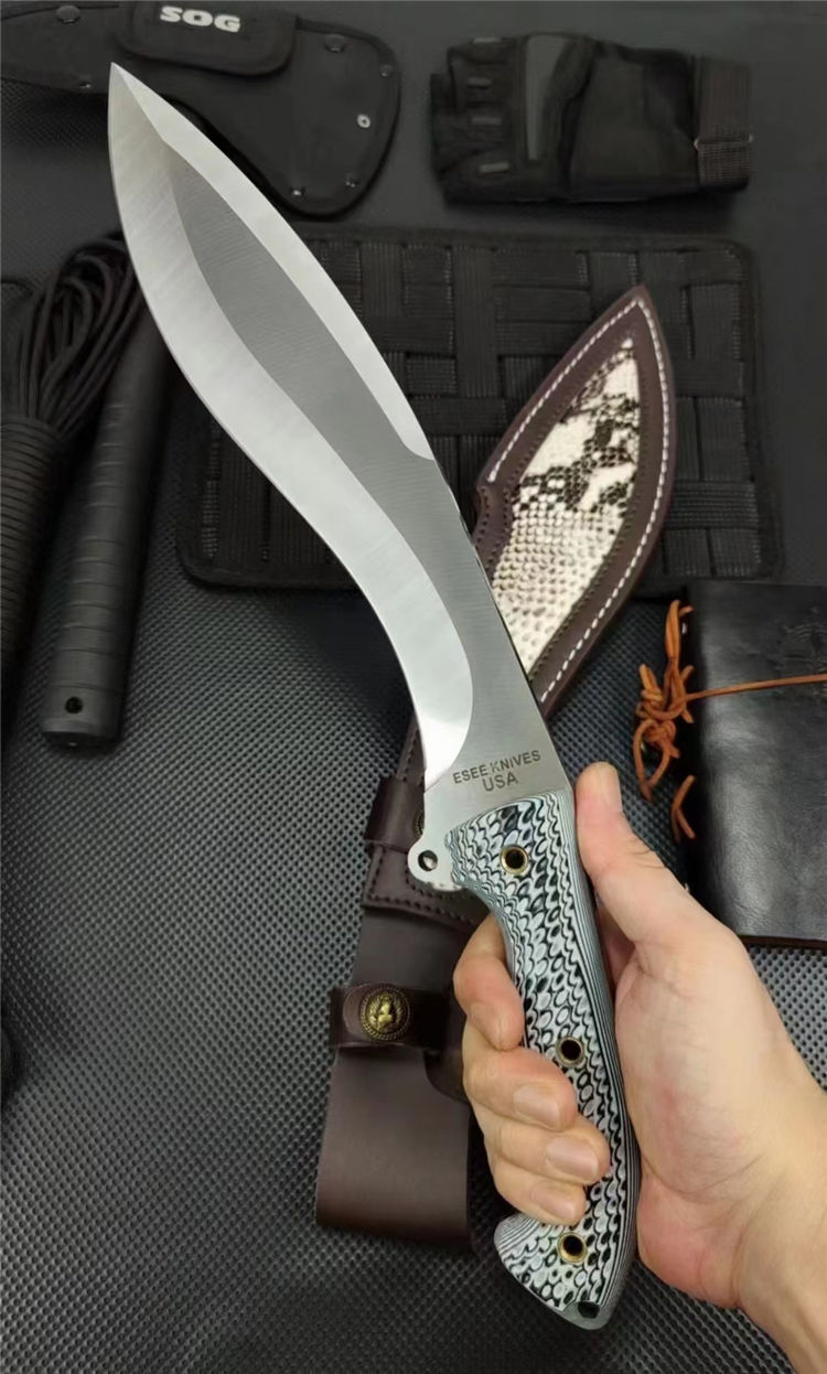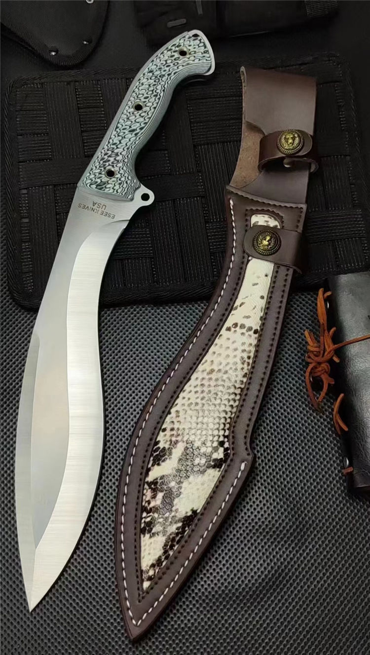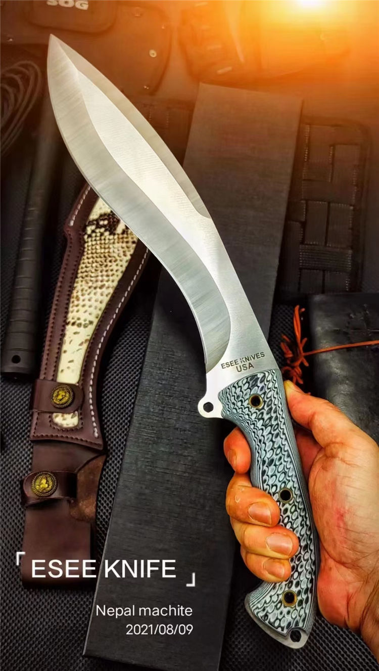 复刻版巴斯狗腿弯刀 全长:440mm 刃长:265mm开刃部分 柄长:160m 刃宽:60mm 刃厚:6.0mm 刃材:9Cr18Mov深冷处理 刀重:808(一斤7两) 毛重:1073g (含鞘含包装) 硬度:60+HRC 表面:手工砂光+CNC水磨 柄材:进口双色G10高密度碾压材料 结构:一体龙骨成型 配套:意大利进口蛇皮植鞣手工加厚牛皮套 包装:黑色礼品盒