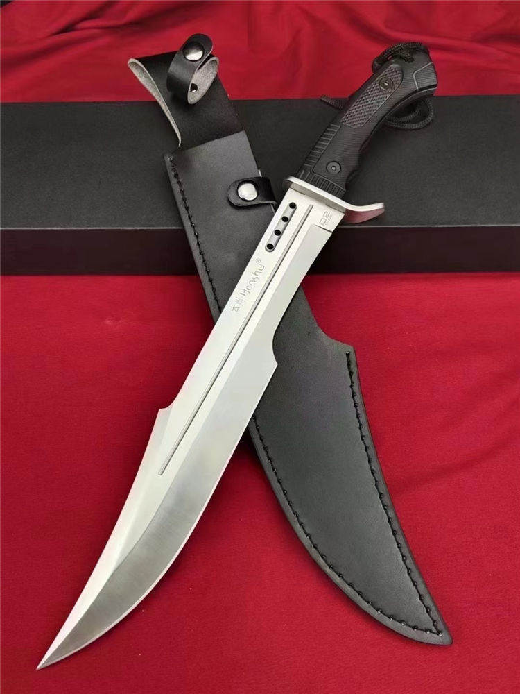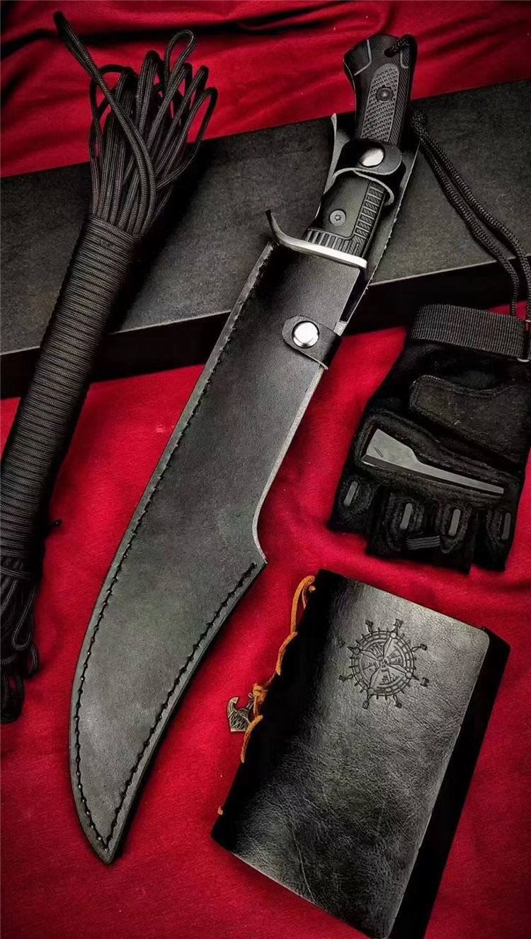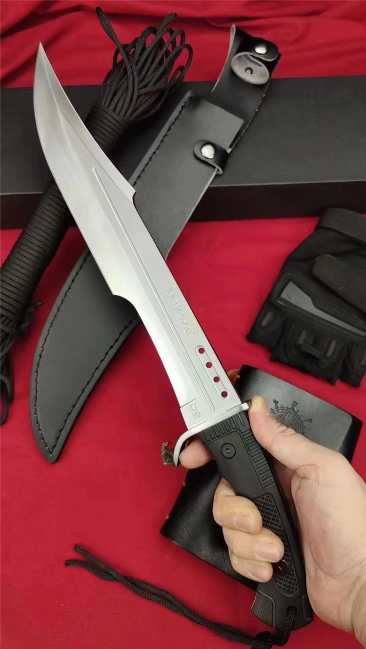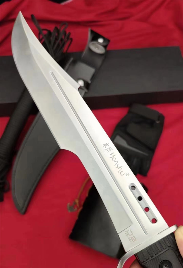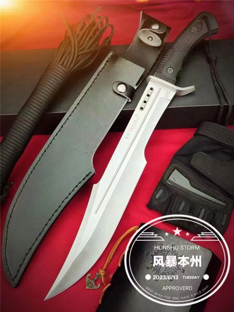 本州风暴开山砍刀 全长:460mm 刃长:210mm开刃处 刃片:32cm 柄长:140mm 刃宽:52mm最宽处 刃厚:5.6mm 刃材:进口D2 高速钢 刀重:663g/769(含鞘) 毛重:1184g含包装 硬度:60±HRC 表面:数控水磨+纳米黑钛氧化涂层 柄材:人体工学高性能尼龙玻纤TPR材料 结构:一体龙骨 配套:手工皮套 包装:黑色包装盒