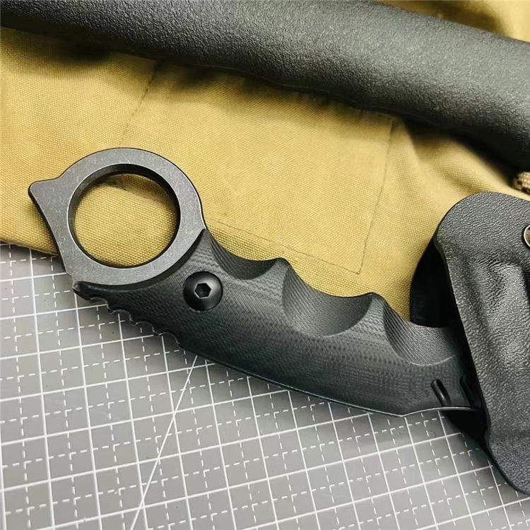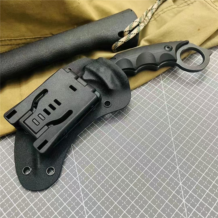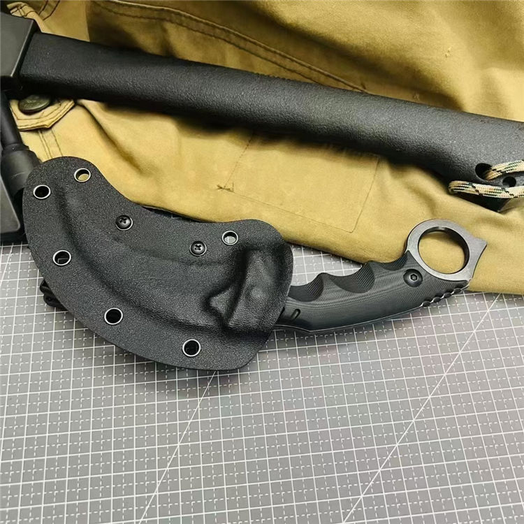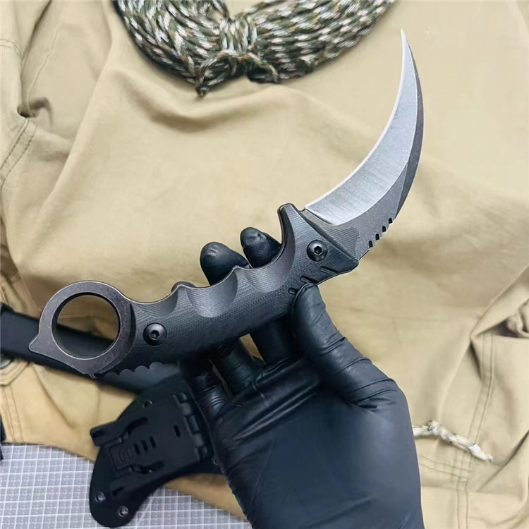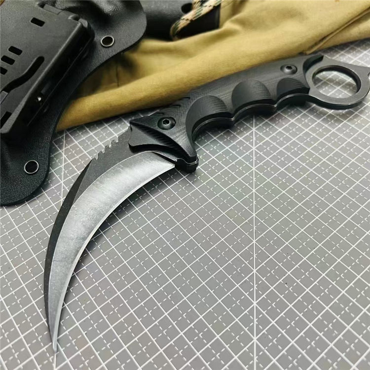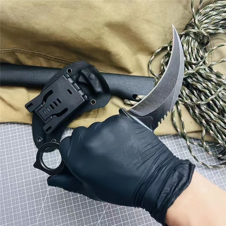 大捷龙爪刀 全长:22CM 刃长:10CM 刃材:AUS-8 硬度:59-60HRC 刃厚:5MM 表面:沧桑石洗 净重:242g 毛重:300g 刀鞘:K鞘