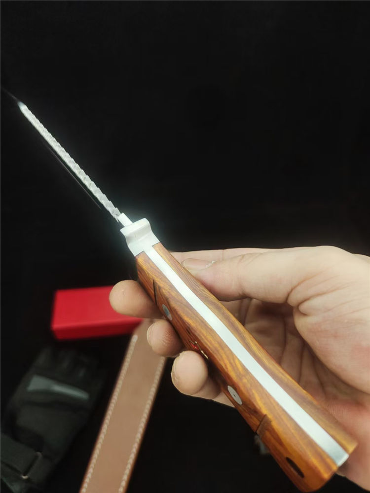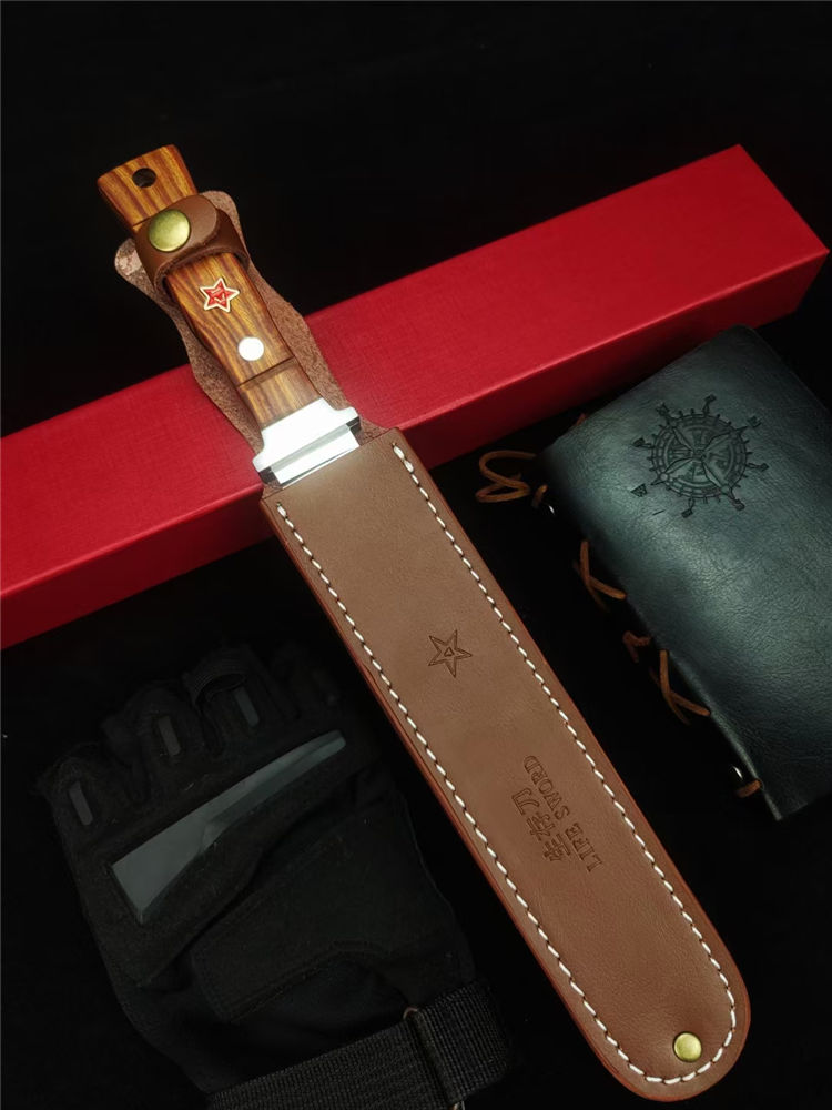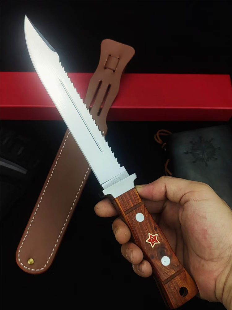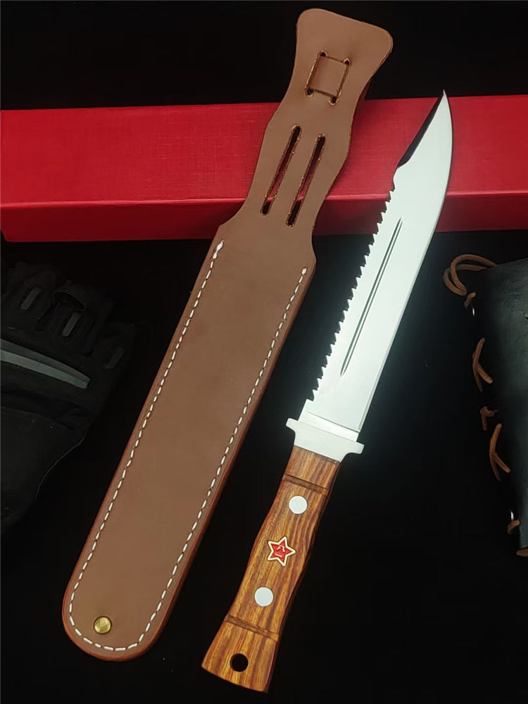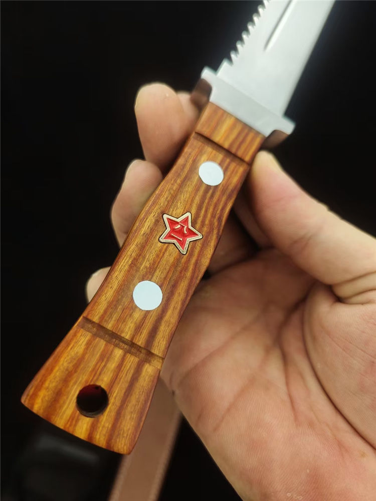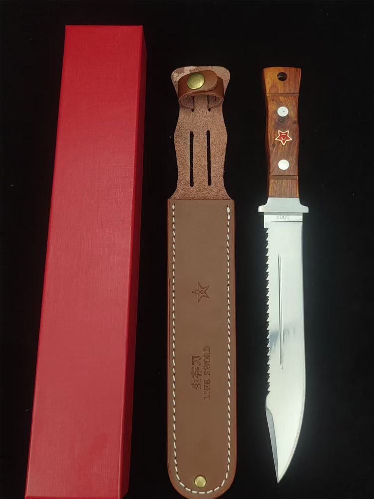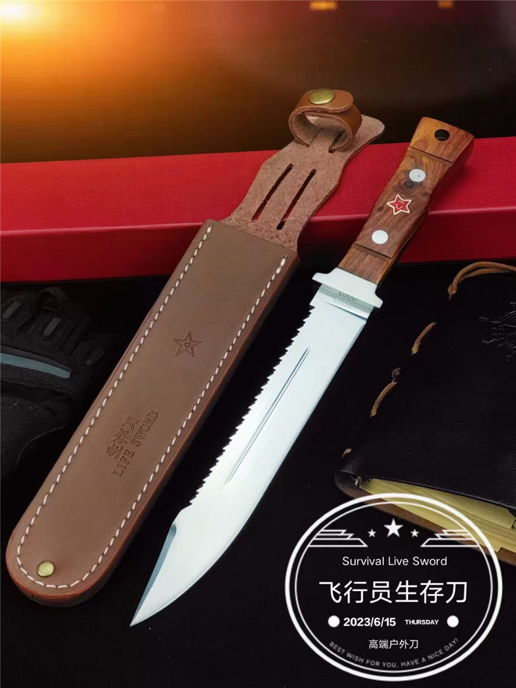 飞行员生存刀 总长:320mm 刃长:190mm开刃部分 刃厚:4.6mm 刃宽:30mm 柄长:124mm 钢材:高性能1950钢 硬度:59-60HRC 表面:手工抛光+镜光 手柄:红酸枝实木手柄铜钉贯穿 重量:425g(总重含包装) 裸刀:259g/328g(含鞘) 皮套:手工牛皮套 包装:红色礼品盒子