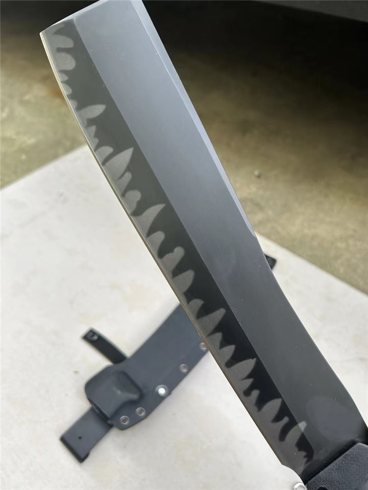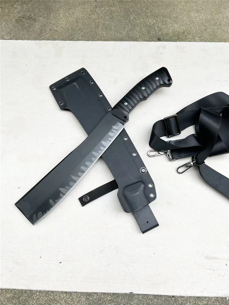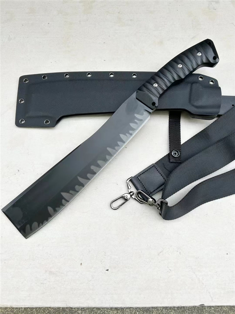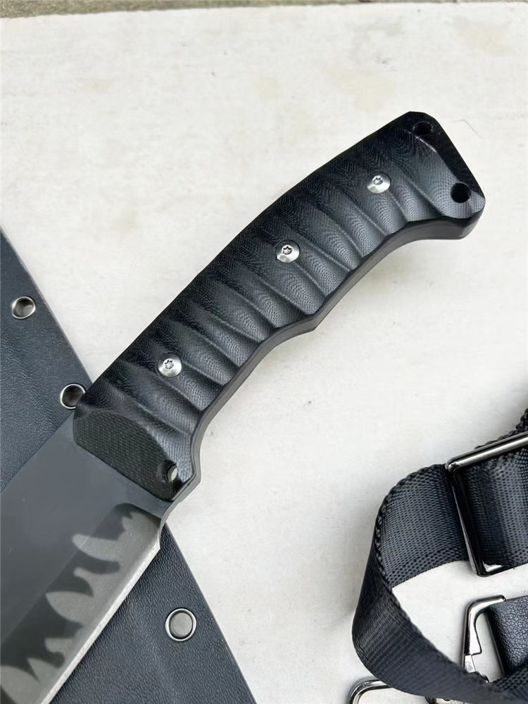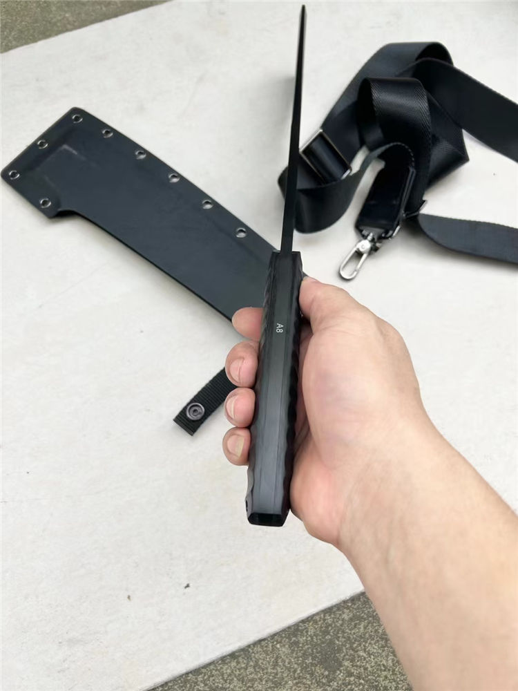 复刻版本巴斯户外柴刀 钢材:进口A8 厚度:6.8mm 全长:420mm 刃长:270mm 柄长:150mm 最宽处:60mm 硬度:60RHC 柄材:G10手柄+钢钉 开V方式:数控开V 刀刃:表面镀灰钛效果 净重:1050克 刀鞘:进口K鞘+背带 包装:精美合子