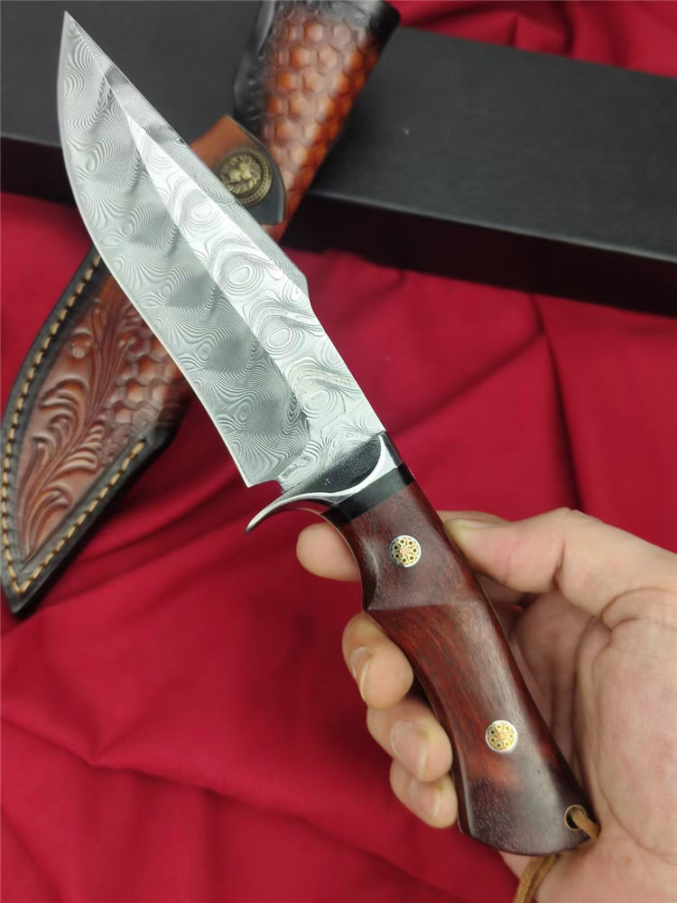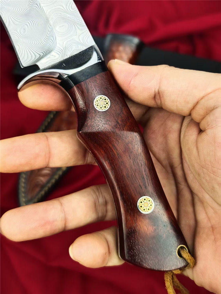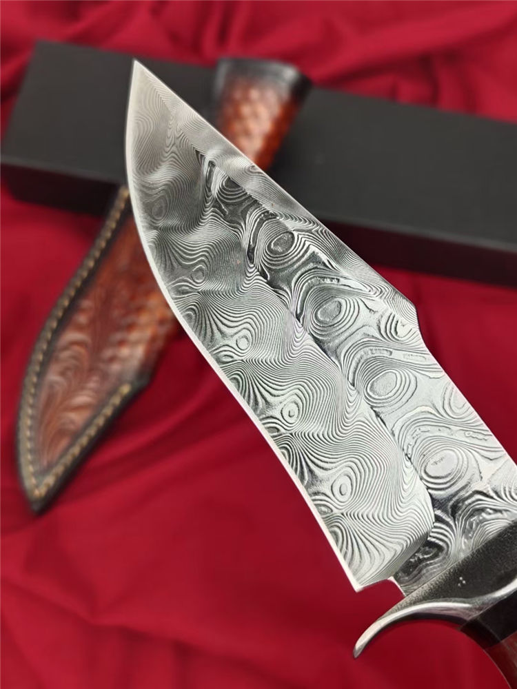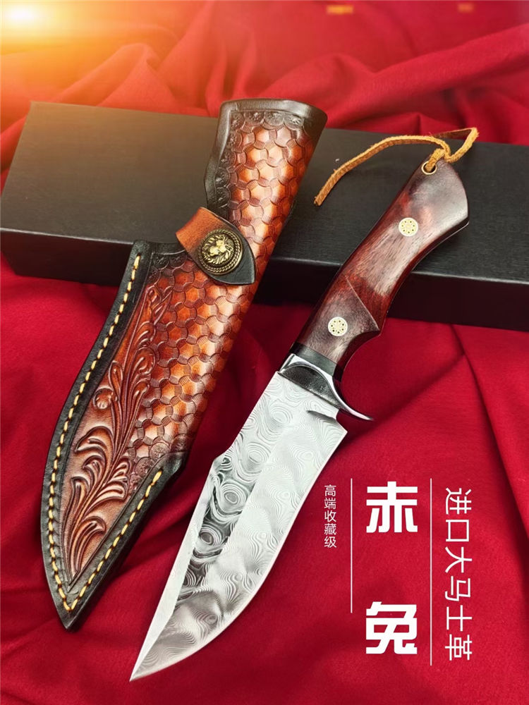 大马士革赤兔直刀 全长:255mm 刃长:133mm 柄长:115m 刃宽:42mm最宽处 刃厚:4.7mm 刃材:进口无心大马士革 刀重:280g/358g 含皮套 毛重:475g(含包装盒) 硬度:59-60HRC 表面:大马士革花纹镜光 柄材:越南血檀木-红檀 配套:手工植鞣压花进口牛皮套 包装:黑礼盒